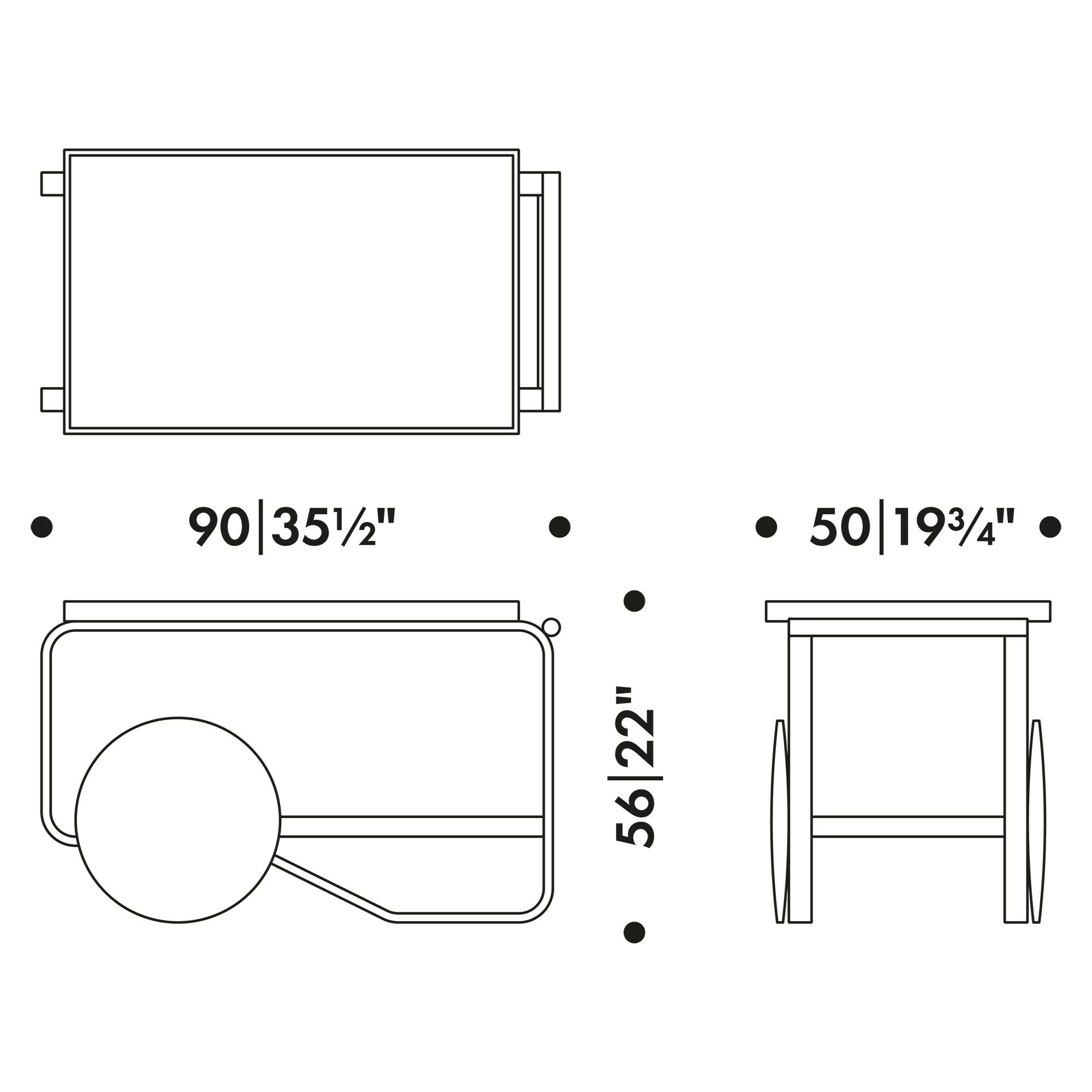 Der praktische und gleichzeitig elegante 901 Teewagen Gestell Birke schwarz ist aus Birke, Linoleum und MDF hergestellt, die Farben sind Holzkohle und Torf. Der durchgängige Rahmen trägt jeweils eine unten und eine oben angebrachte rechteckige Abstellfläche aus Linoleum. Die Abmessungen betragen dabei 90cm in der Länge, 50cm in der Breite und 56cm in der Höhe. Der 901 Teewagen Gestell Birke schwarz von Artek ist mit einem massiven Griff aus Birke versehen, mit dem der Teewagen einfach und leicht bewegt werden kann. Die Kombination des leichten Birkenholzes mit den beiden überdimensional wirkenden Rädern ermöglicht eine leichte Steuerung und Manövrierung des Teewagens, der in keinem stilbewussten Haushalt fehlen sollte.