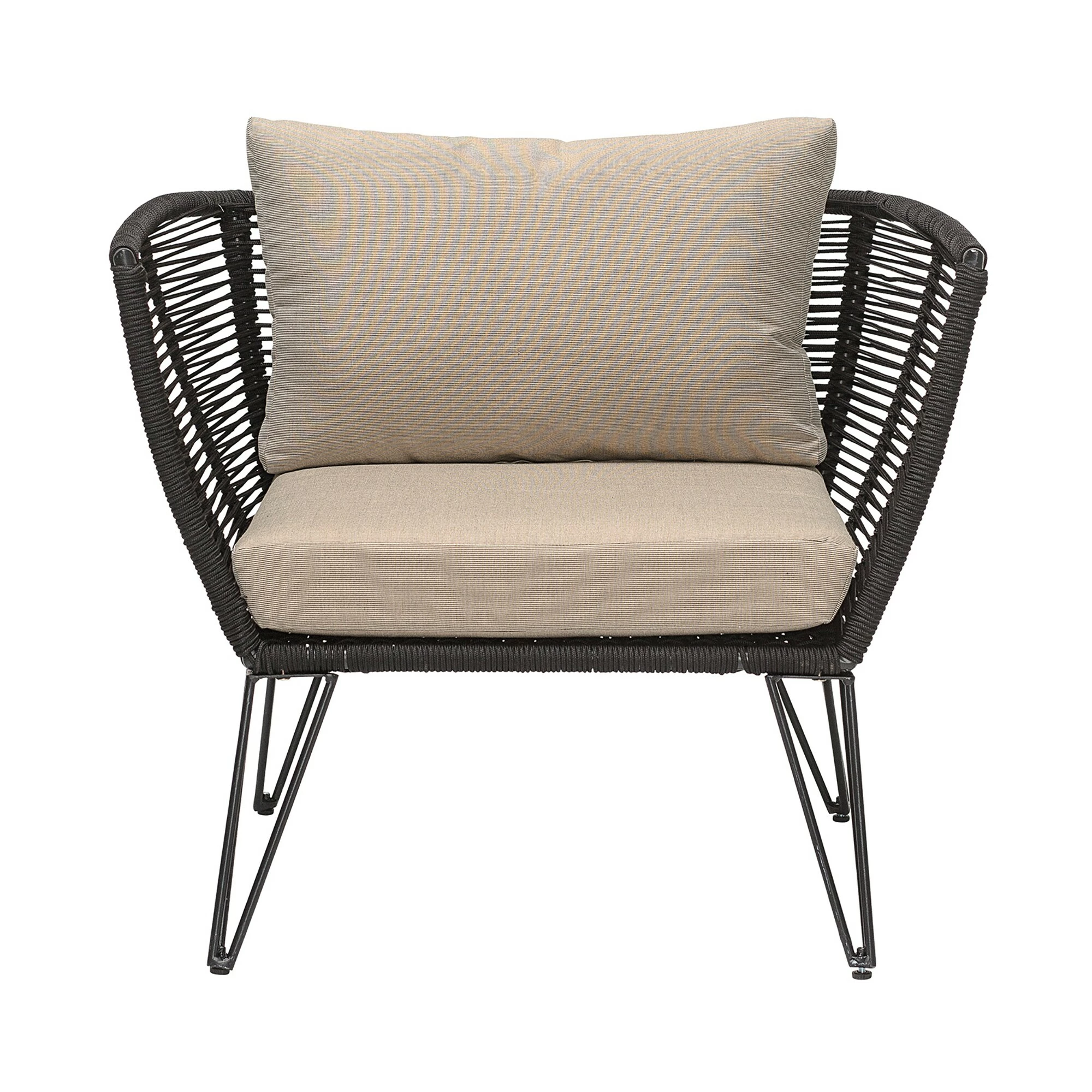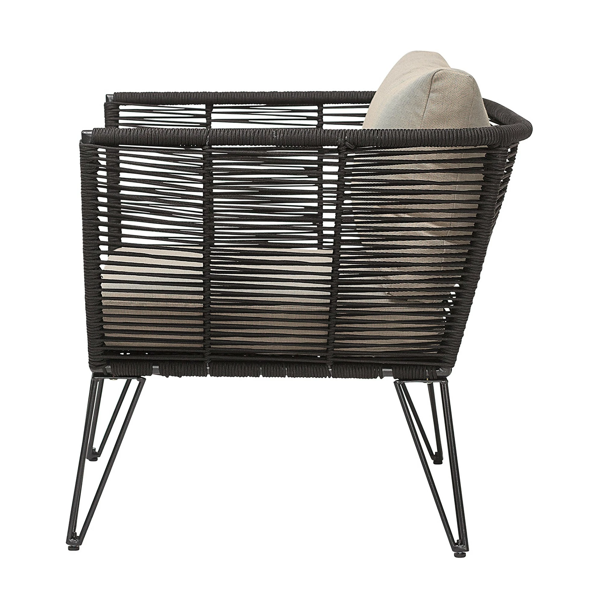 Mit einem großzügigen Maß von 87 cm in der Breite und einer Sitztiefe von 60 cm lädt der Mundo Lounge Gartensessel schon beim Anblick zum bequemen Hineinsetzen ein. Ein Sitzkissen und ein Kissen an der Rückenlehne – beide mit Polyester gefüllt – unterstützen das Wohlbefinden und eine gemütliche Sitzhaltung. So lässt sich der Tagesausklang oder das Wochenende im Garten, auf dem Balkon oder der Terrasse bestens genießen. Stabilen Halt bietet das Stahlgestell, das schwarz pulverbeschichtet und vor Frost sicher ist. Optisches Highlight ist die Ummantelung des Gestells im Sitzbereich mit einem Seil aus Polyester, das Wasser abweist. Es spannt sich zudem horizontal um einzelne senkrechte Stäbe. Somit werden Sitzfläche und Rückenlehne zu einem Korb, der optisch an ein Rattangeflecht erinnert.