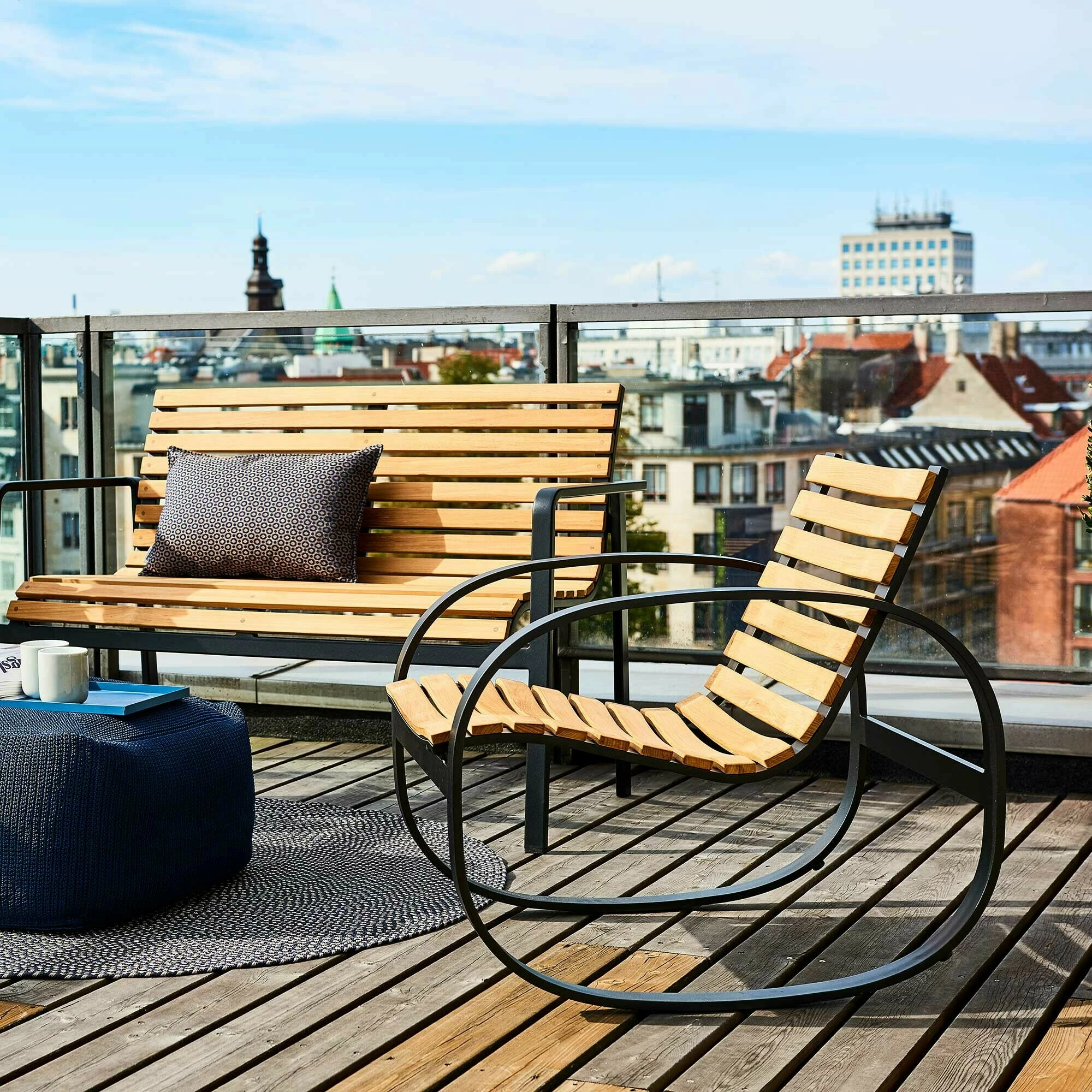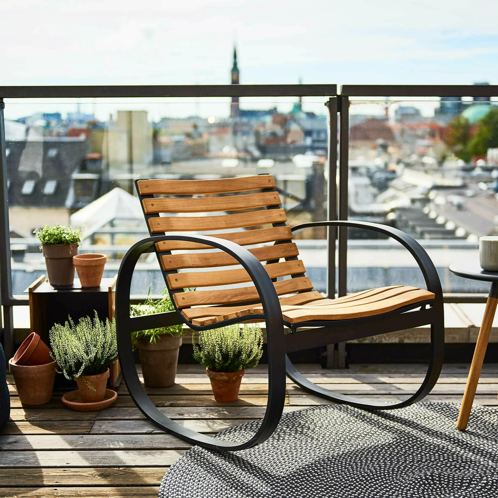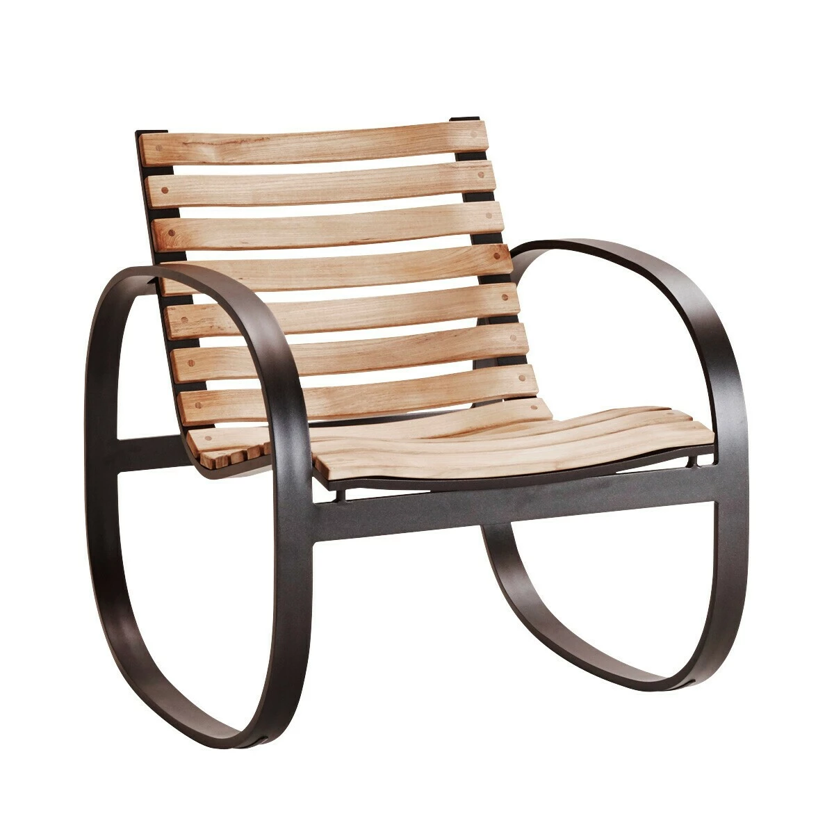 Für den Parc Schaukelstuhl kommt Teakholz zum Einsatz, ein Naturmaterial, das sich schon seit vielen Jahren für den Outdoorbereich bewährt. Das Holz enthält nämlich viel Öl und ist daher wasserabweisend. So kann der Parc Schaukelstuhl auch bei schlechtem Wetter im Freien verweilen. Die Sitzfläche und die Rückenlehne sind aus einzelnen Lamellen gefertigt. Dazwischen entsteht ein Spalt, der bei Regen ein rasches Abfließen von Nässe ermöglicht. Wird das Material nicht regelmäßig geölt, erhält es im Laufe der Zeit eine Patina. Das Teakholz ist zertifiziert und stammt aus nachhaltiger Forstwirtschaft. Der auffällige, ovale Rahmen des Schaukelstuhls ist aus pulverbeschichtetem Aluminium gefertigt und dient als Kufen und Armlehnen zugleich.