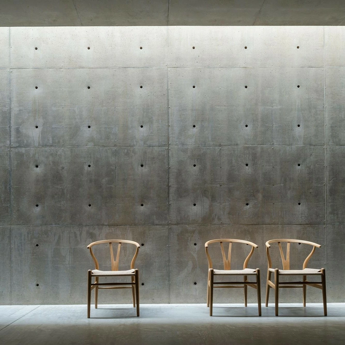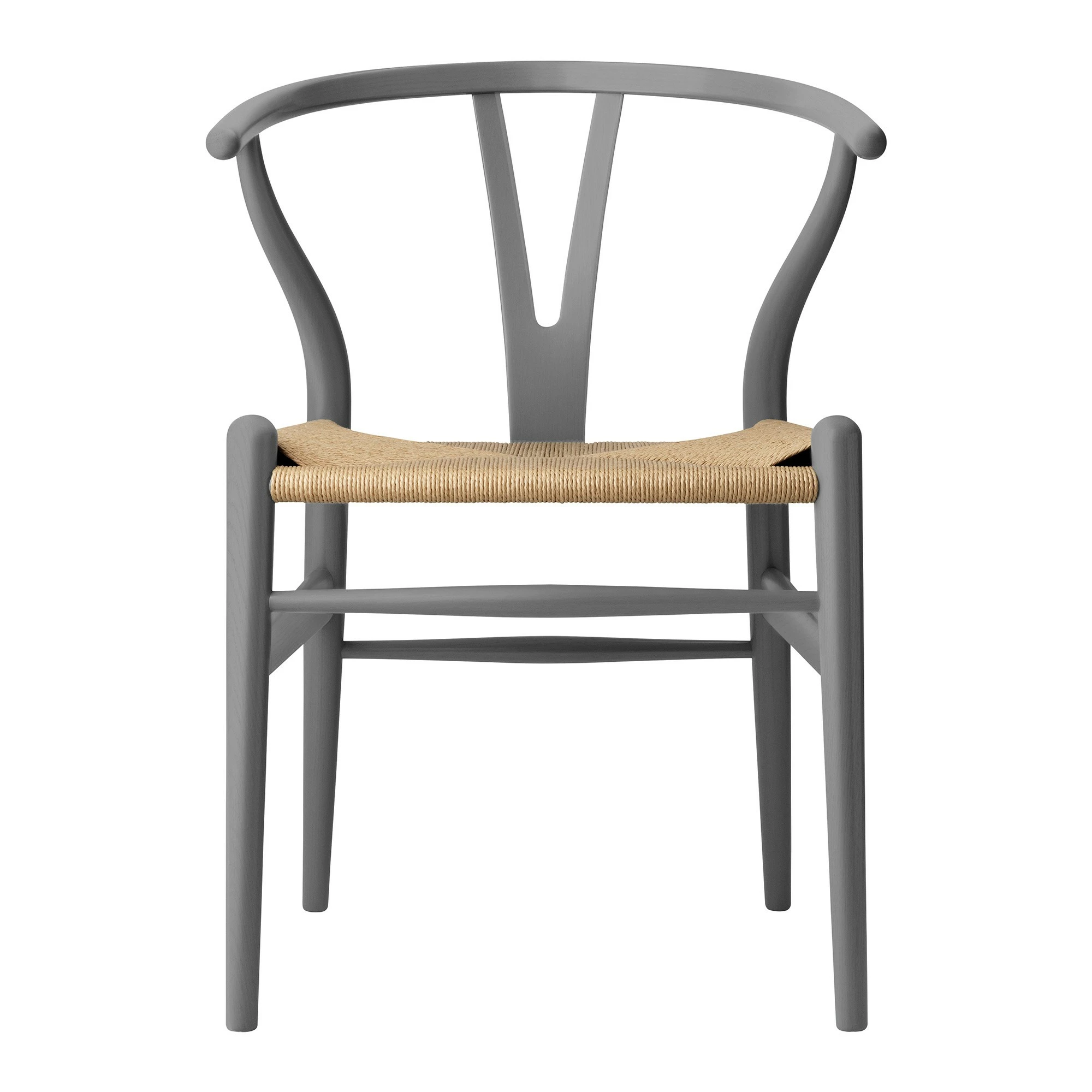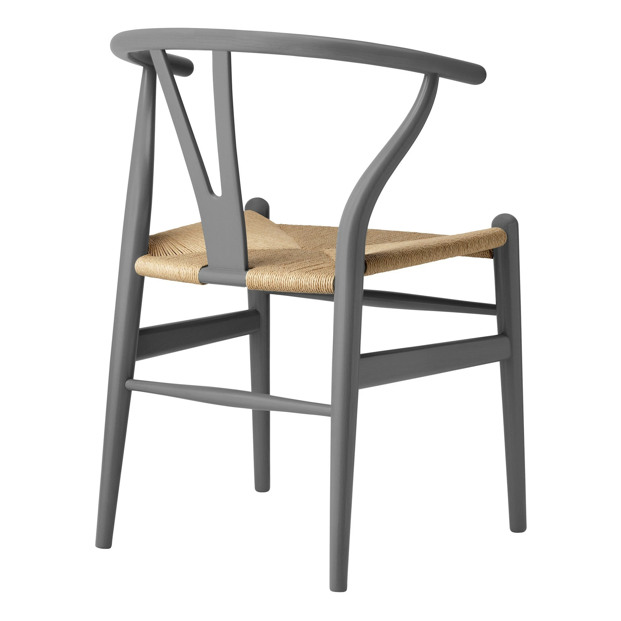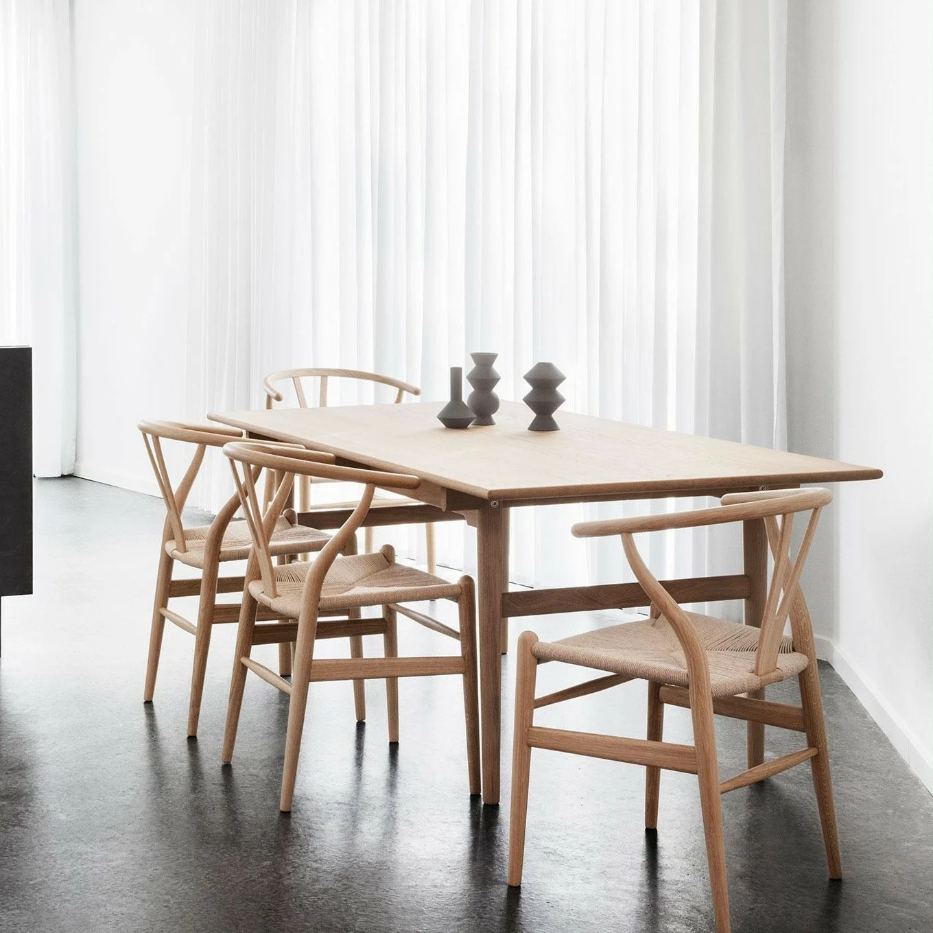 Zum Markenzeichen des filigranen wie formschönen Stuhls wird die Rückenlehne, die in Form des Buchstaben Y gestaltet ist. Da dieser Teil ein wenig einem Brustbein ähnelt, erhielt das Modell den Namen Wishbone. Das Modell ist in Dänemark heute noch so berühmt, dass es oft nur als ‚der Stuhl‘ bezeichnet wird. Sicheren Stand gewährleistet dem Limited Edition CH24 Wishbone Chair Gestell Buche das in geraden Linien gestaltete Gestell, das aus vier Beinen und vier Querstreben besteht. Einen harmonischen Kontrast dazu bildet die rund geschwungene Lehne. Obwohl das Modell schlicht wirkt, sind 100 Arbeitsschritte notwendig, bis es vollendet ist. Für die Sitzfläche verwendet Wegner hochwertiges Papiergarn, der Rest besteht aus Buchenholz.
