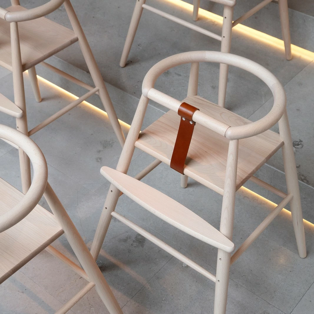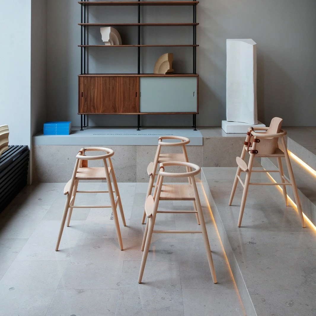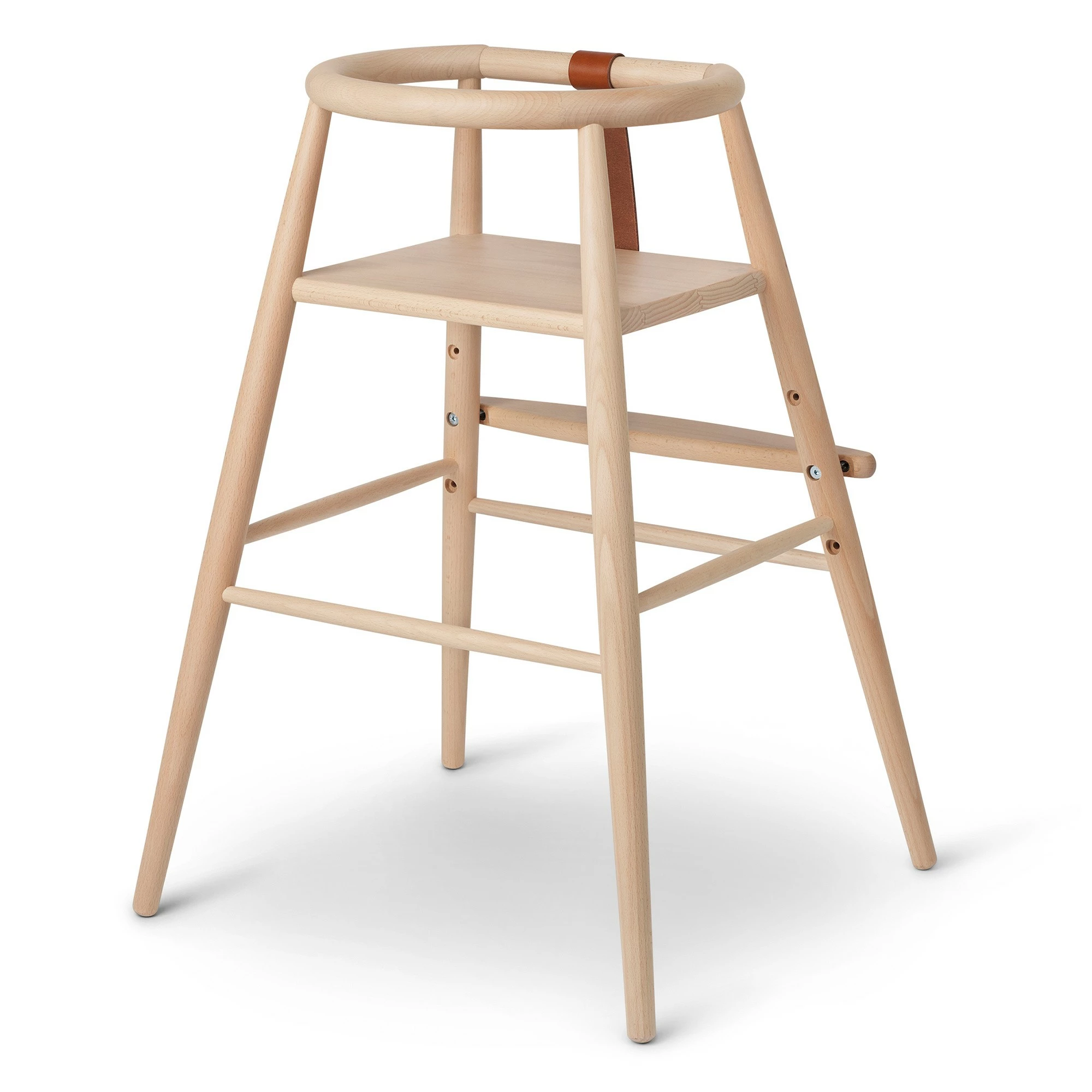 Der ND54 Kinderhochstuhl mit Baby-Einsatz, der 1954 präsentiert wurde, gilt nicht umsonst als ein echter Klassiker: Funktionell und ästhetisch zugleich entspricht er genau den Bedürfnissen von Eltern und Kindern. Das Möbelstück wurde gekonnt auf seine Grundlagen reduziert und gleichzeitig den optischen Ansprüchen eines modernen Interieurs angepasst. Der Hochstuhl mit herausnehmbarer Lehne fügt sich damit optimal in Ihr Esszimmer ein und harmoniert perfekt mit dem Interieur Ihres Zuhauses. Der puristisch gestaltete ND54 Kinderhochstuhl mit Baby-Einsatz ist aus transparent lackierter Buche gefertigt und besitzt praktische Riemen aus braunem Kernleder. Er ist 70,5 cm hoch und hat eine Sitzfläche von 51 cm in der Breite und 52 cm in der Tiefe. Die vier Beine sind auseinandergespreizt, sodass eine erhöhte Standfestigkeit des Hochstuhles gewährleistet wird. Sämtliche Elemente des Möbelstücks wie etwa die Fußstütze oder die Armlehnen sind abgerundet und damit perfekt an die Sicherheitsanforderungen für Kinder bis 3 Jahre oder bis zu einem Gewicht von 15 kg angepasst. Im Lieferumfang finden Sie zudem drei Schilder aus Edelstahl, in die Sie den Namen der Kinder gravieren können, die den Stuhl benutzt haben. Denn der Hochstuhl kann über Generationen weitergegeben werden.