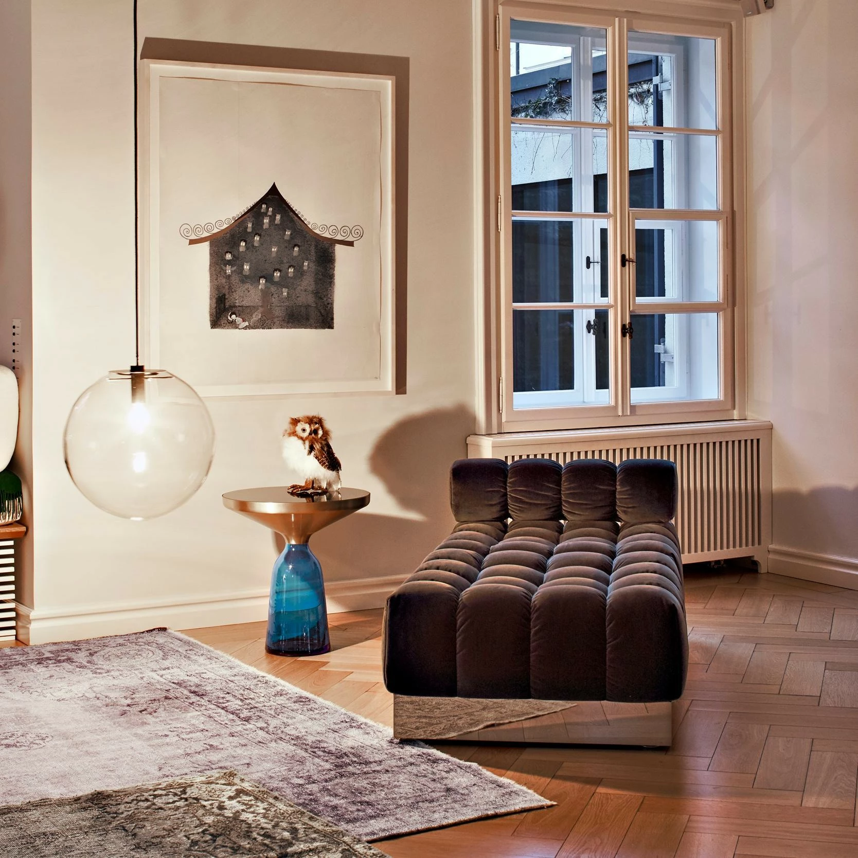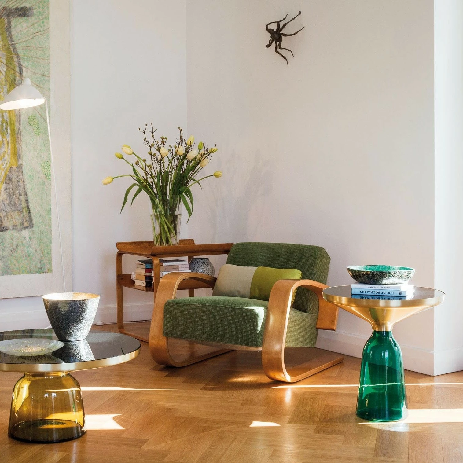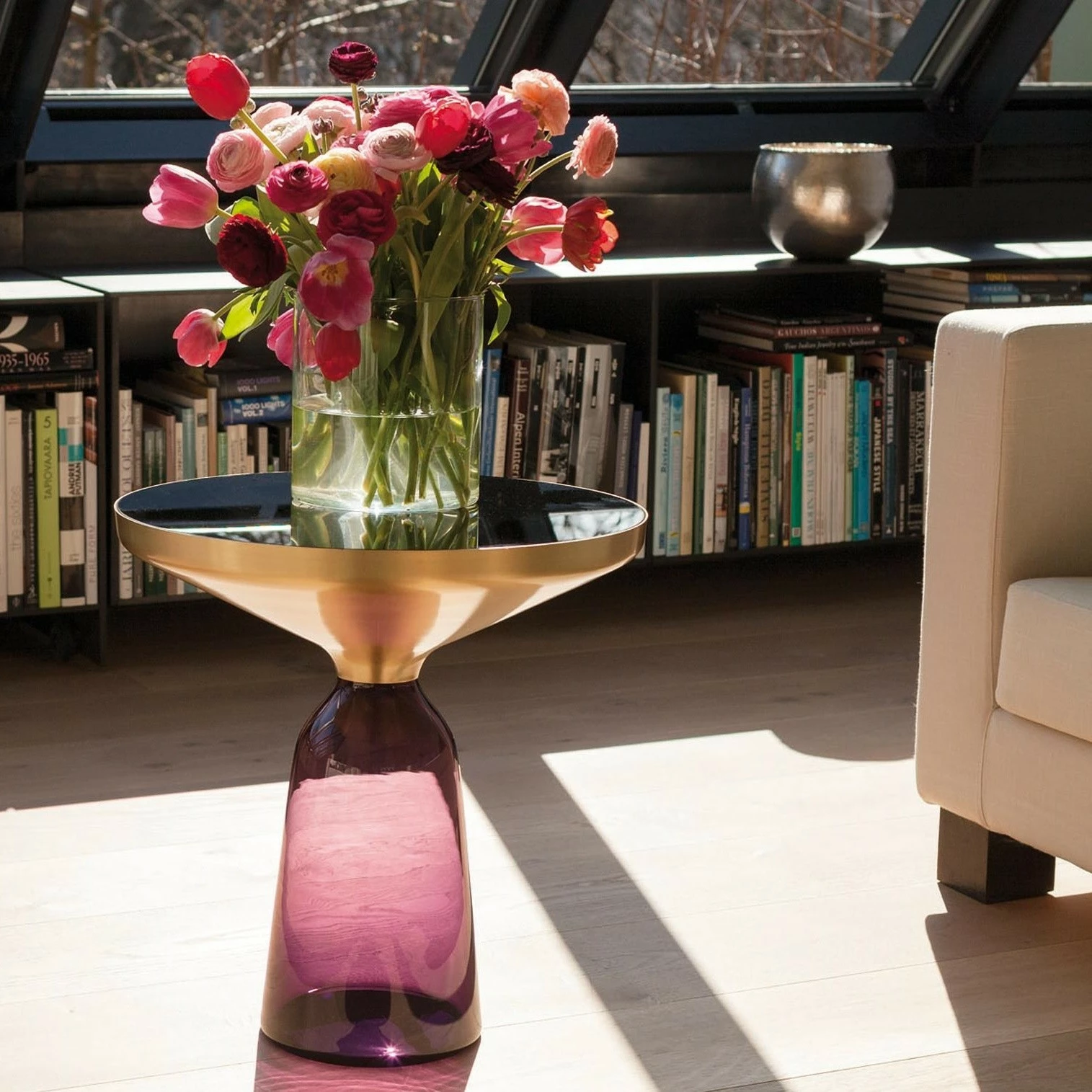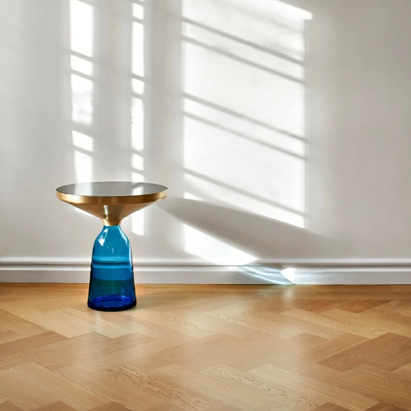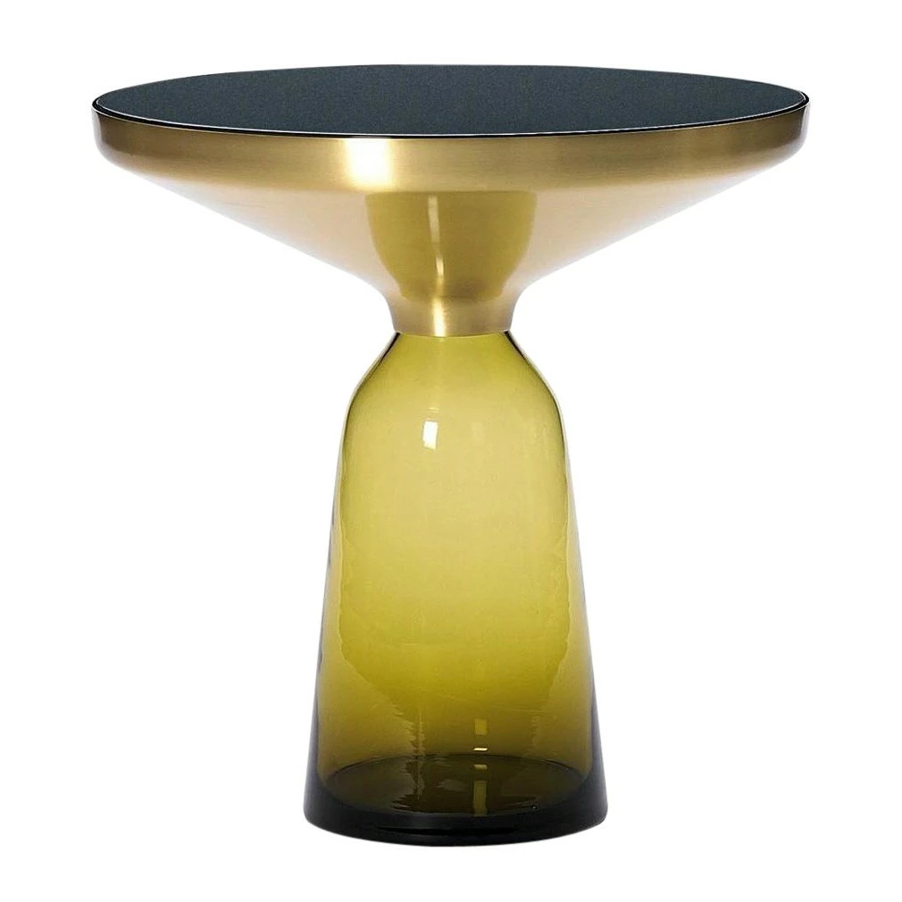 Der Beistelltisch Bell Side Table ist aus Glas und Metall gearbeitet und verbindet diese beiden so gegensätzlichen Materialien zu einem kontrastreichen Ganzen. Der Tischfuß des Bell Side Table/Beistelltisches von ClassiCon ist aus Glas gearbeitet. Er wurde nach traditioneller Art in eine Holzform geblasen. Kleine Unebenheiten und Bläschen tragen zum Charakter und zur Einzigartigkeit dieses handgefertigten Beistelltisches bei.