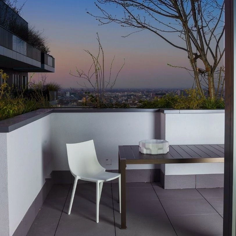 Der französische Designer stellte den Bo Gartenstuhl im Jahr 2002 vor. Er wird aus Polypropylen hergestellt, einem robusten und langlebigen Material. Da auch widrige Wetterverhältnisse dem Werkstoff nichts anhaben können, kann der Bo Gartenstuhl bei schlechtem Wetter im Freien bleiben. Mit seinem einfachen Design passt er in jeden Garten, auf den Balkon, in die Küche oder den Wohnraum. Nach einer Gartenparty oder am Ende der Outdoor-Saison kann der Bo Gartenstuhl gestapelt und somit platzsparend verstaut werden. Bis zu 8 Exemplare lassen sich aufeinander stellen. Die vorderen Beine sind gerade, die hinteren ausgestellt. Einen interessanten Kontrast zu den geraden Linien des Gestells bildet die geschwungene Rückenlehne. Sie trägt zum ausgezeichneten Sitzkomfort bei. Gefertigt wird der Gartenstuhl als Monoblock. Mit seiner matten Oberfläche wirkt er elegant.