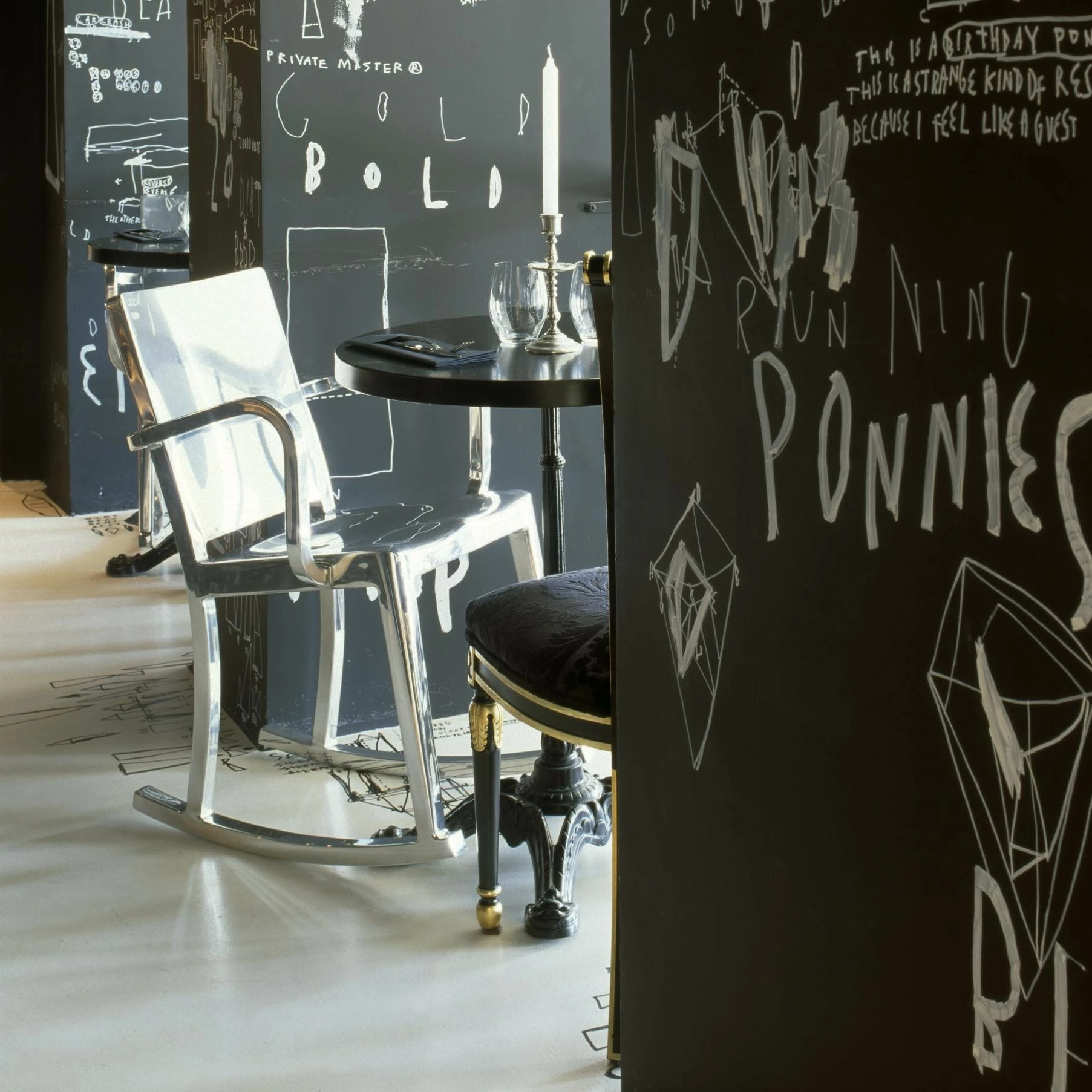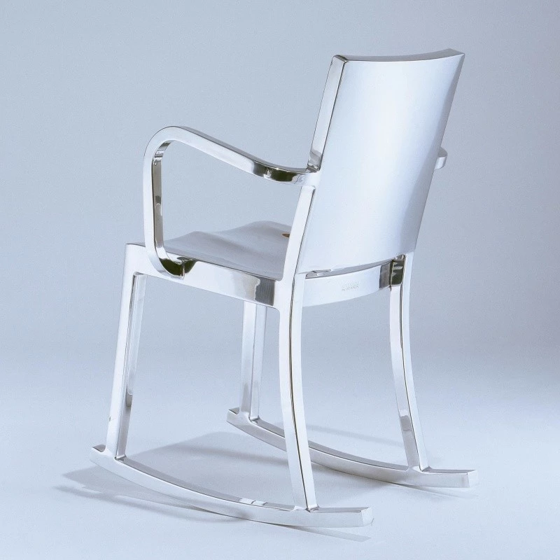 Der stylishe Hudson Schaukelstuhl mit Armlehnen, designed by Philippe Starck im Jahr 2000 für den US-amerikanischen Stuhlhersteller Emeco, gehört zu der originalen Hudson Kollektion, die ursprünglich für das renommierte New Yorker Hudson Hotel kreiert wurde.