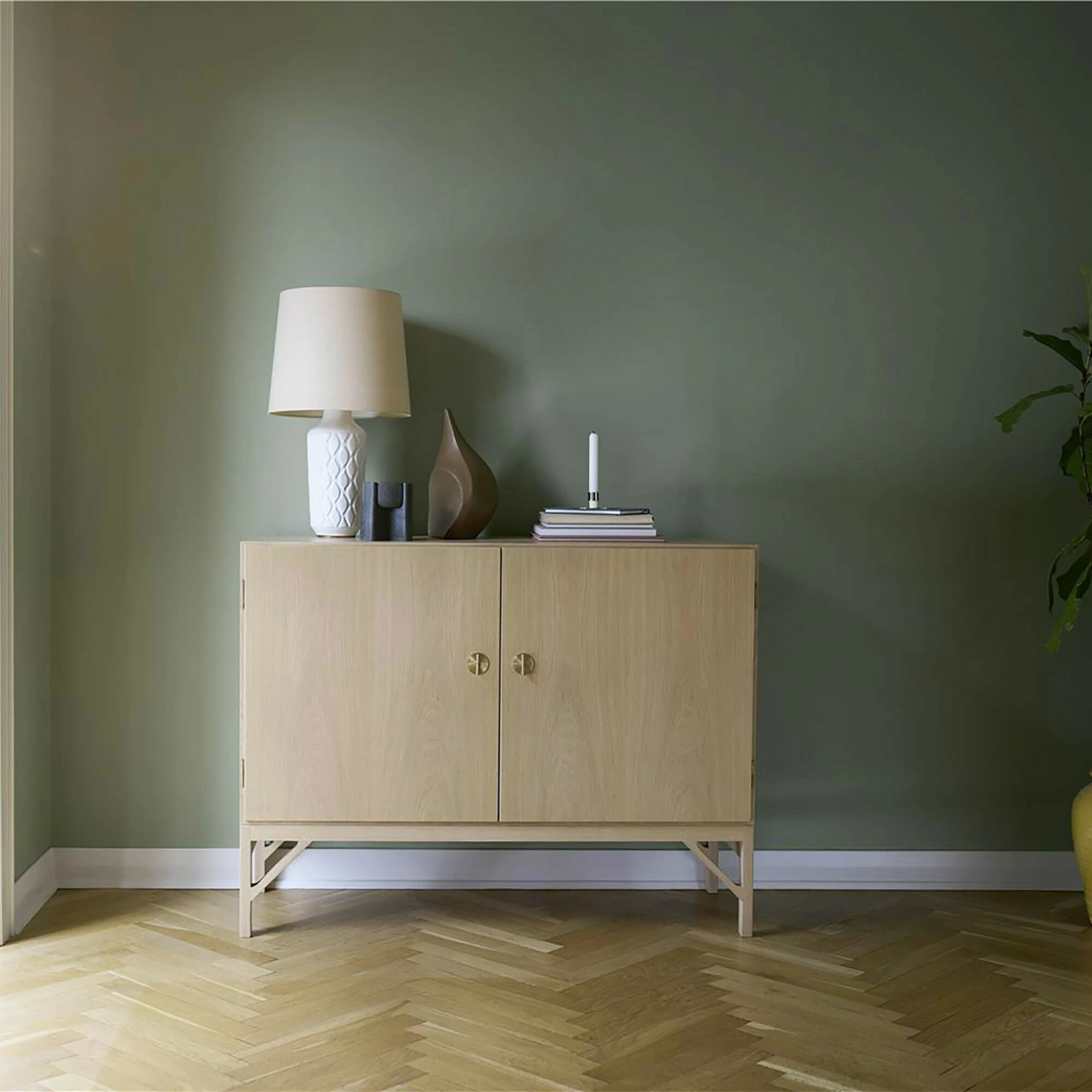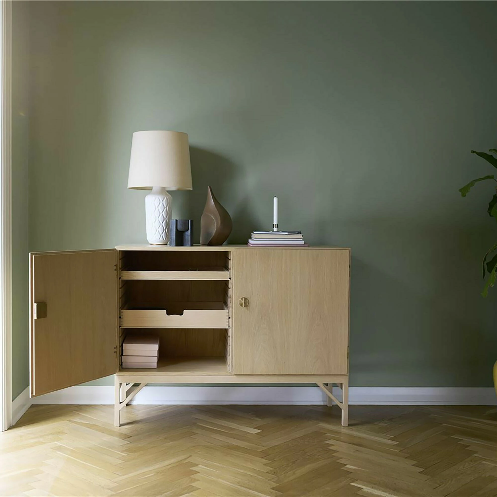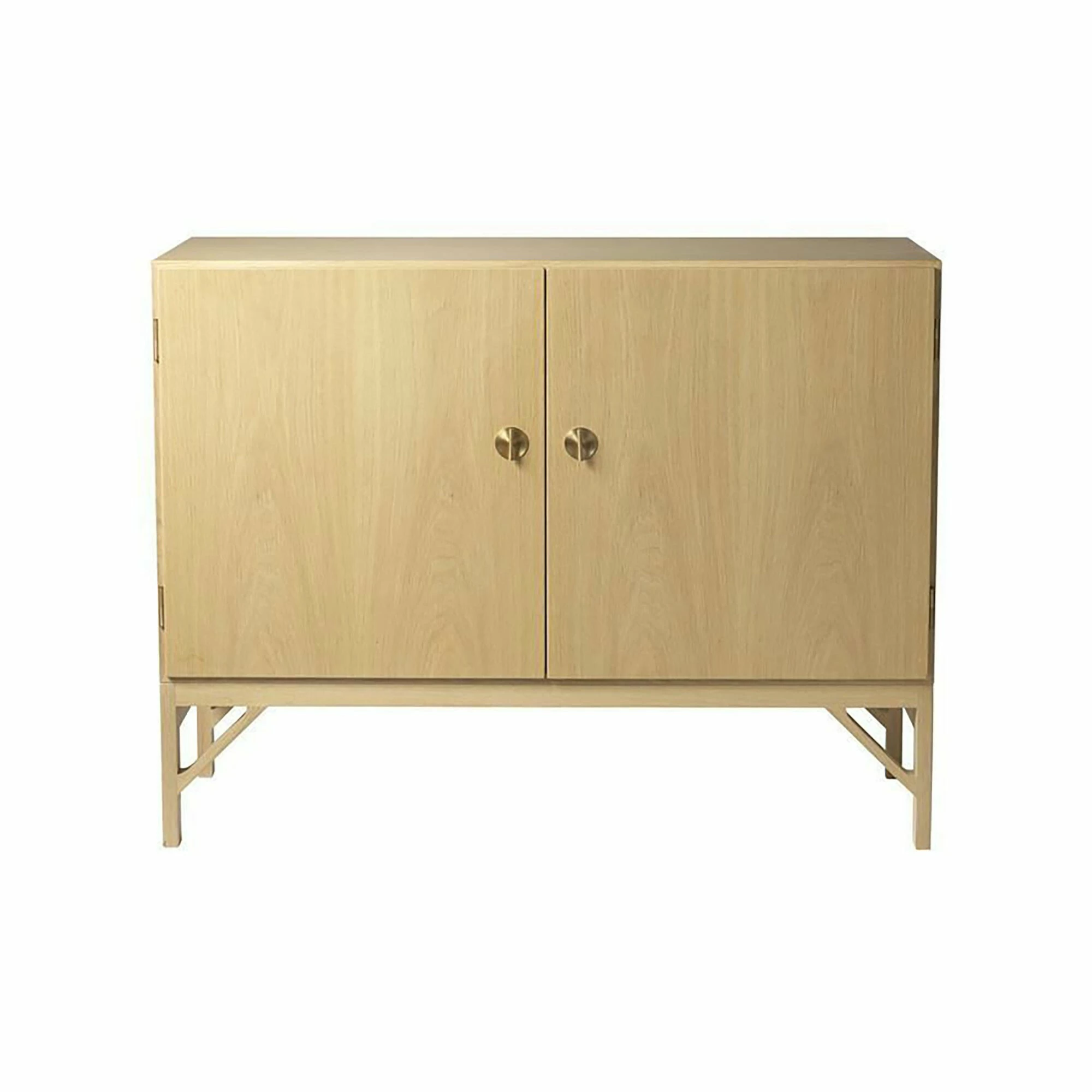 Erstmals war das A232 Skænk Sideboard im Jahr 1964 im Produktkatalog von FDB Møbler zu finden. Es bereichert jeden Raum: Die Kommode kann im Wohn- und Schlafzimmer zu Hause, im Büro oder in einem Hotel eingesetzt werden. Das Design ist typisch nordisch: Zurückhaltung ist das Motto. Vier gerade geformte Füße sichern festen Stand. Diagonal angesetzte Streben verbinden sie mit dem Rahmen, der den Korpus trägt. Das A232 Skænk Sideboard besteht aus Eichenholz. Dass es das FSC-Siegel trägt bedeutet, dass das Material aus nachhaltiger Forstwirtschaft stammt. Die beiden Türen werden mit Griffen aus Messing geöffnet. Das Innere des A232 Skænk Sideboards ist mit vier Einlageböden strukturiert. Darin können nach Belieben Dekorationsartikel, Bücher, Büromaterial und viele weitere Gegenstände abgelegt werden. Das Möbelstück kann mit einem feuchten Tuch gereinigt werden.