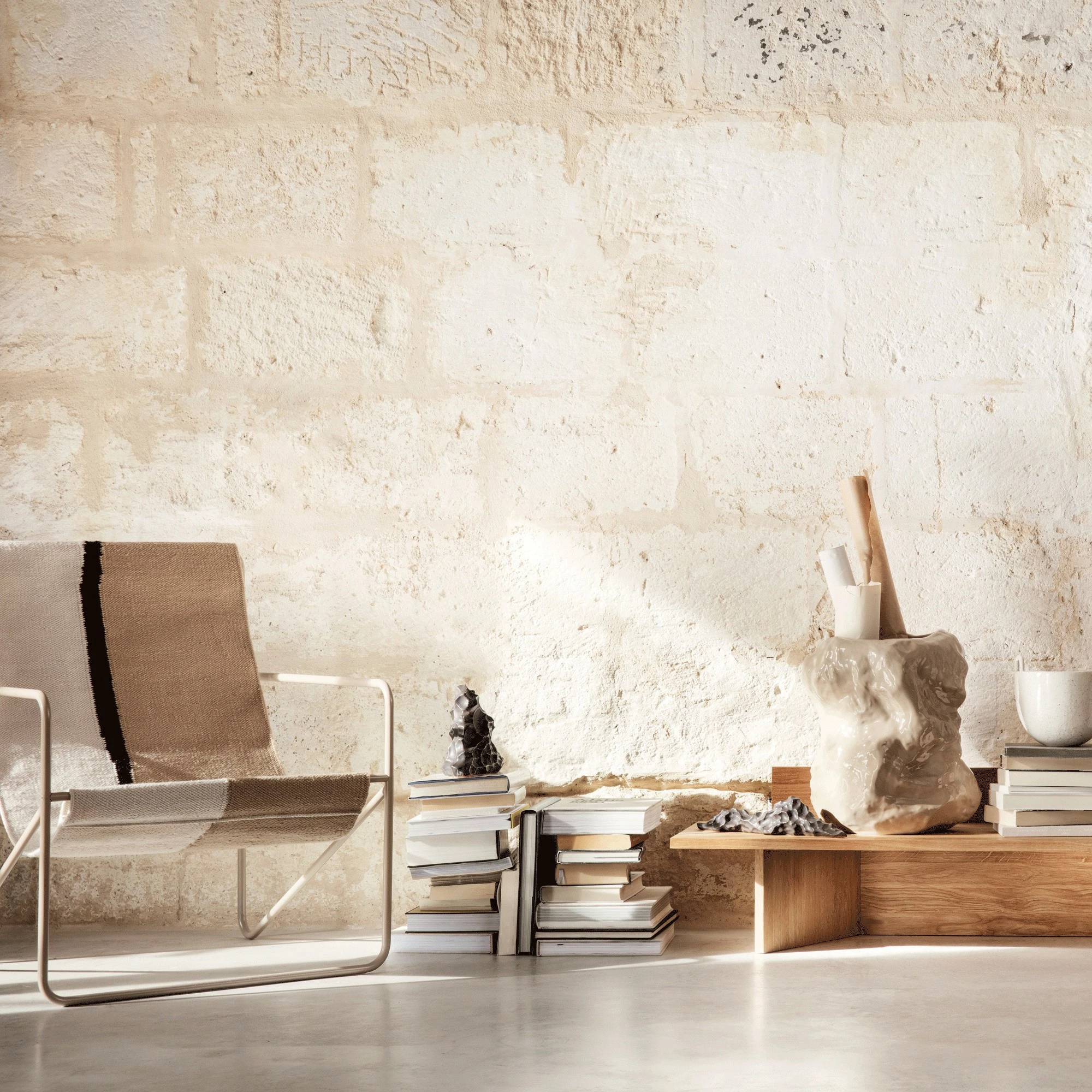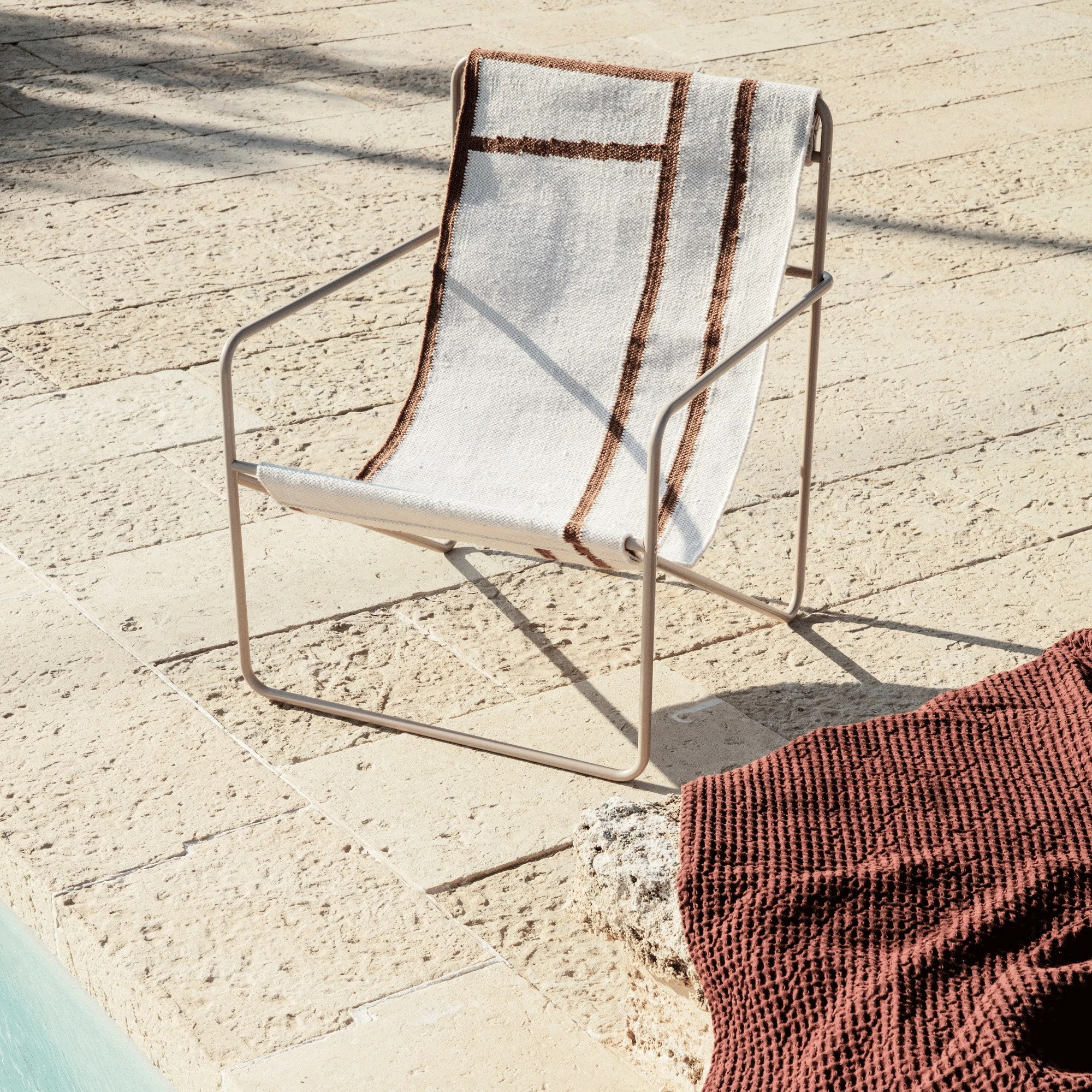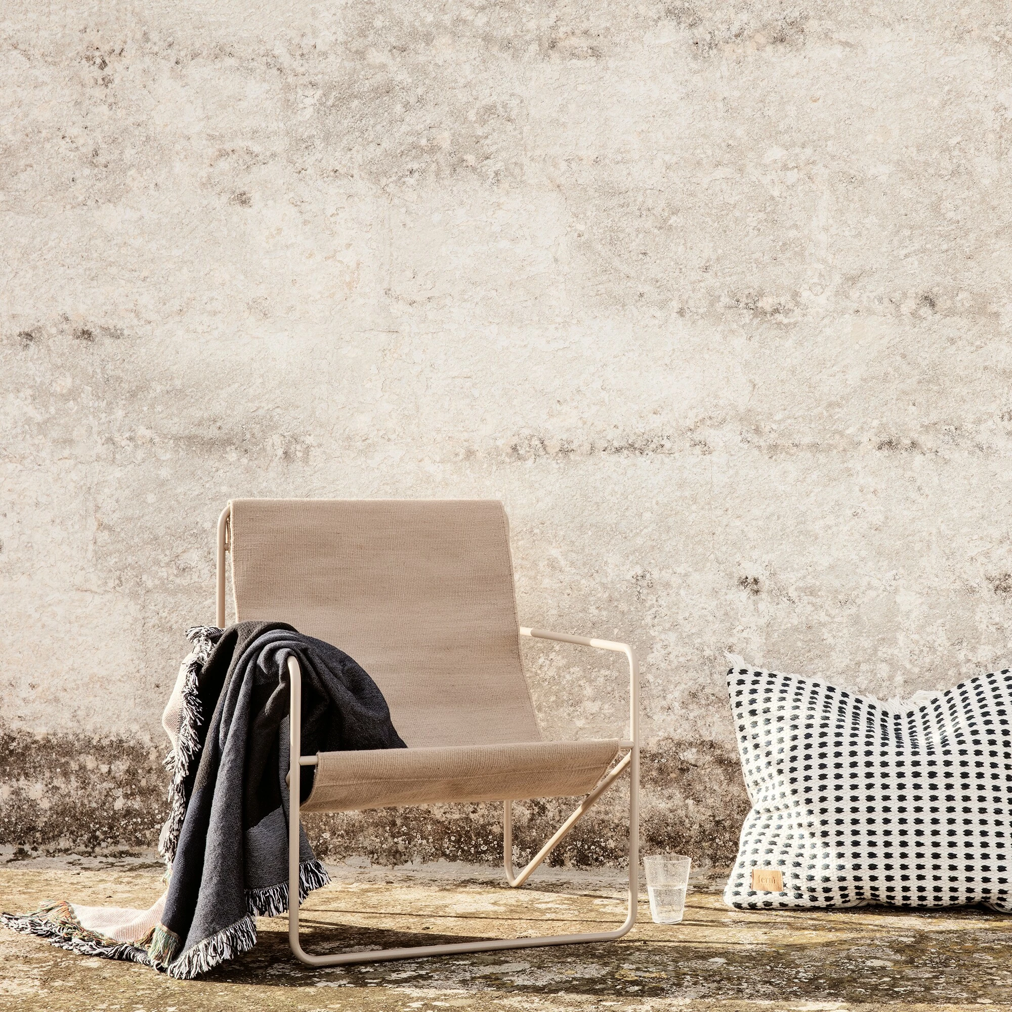 Mit dem Desert Loungestuhl Gestell Kaschmir wird die Marke ferm LIVING dem Ruf nach Klimaschutz gerecht. In einem innovativen Verfahren entsteht aus Müll ein hochwertiges und gleichzeitig stilvolles Möbelstück, das ein wenig an einen Regiestuhl erinnert. Wird die Sitzfläche einmal schmutzig, kann sie ganz einfach abgenommen und in der Waschmaschine bei 30 Grad Celsius gereinigt werden. Außerdem ist das Material wetterfest: Somit ist der Desert Loungestuhl Gestell Kaschmir perfekt für den Garten oder den Balkon geeignet. Sollte er nass werden, trocknet er im Nu. Doch auch für das Wohn- oder Kinderzimmer ist er ein gemütliches und gleichzeitig umweltfreundliches Möbelstück.