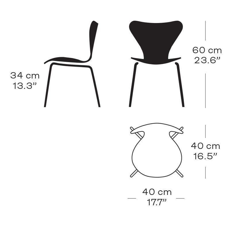 Der Serie 7™ Kinderstuhl ist 40 cm breit und 60 cm hoch. Mit einer Sitzhöhe von 34 cm kann er mit jedem beliebigen Kindertisch kombiniert werden. Die Tiefe beträgt 40 cm. Aus derselben Kollektion sind auch Modelle in Normalgröße erhältlich. Somit erfreut der Klassiker Groß und Klein und überzeugt außerdem mit Stil und ausgezeichnetem Sitzkomfort.