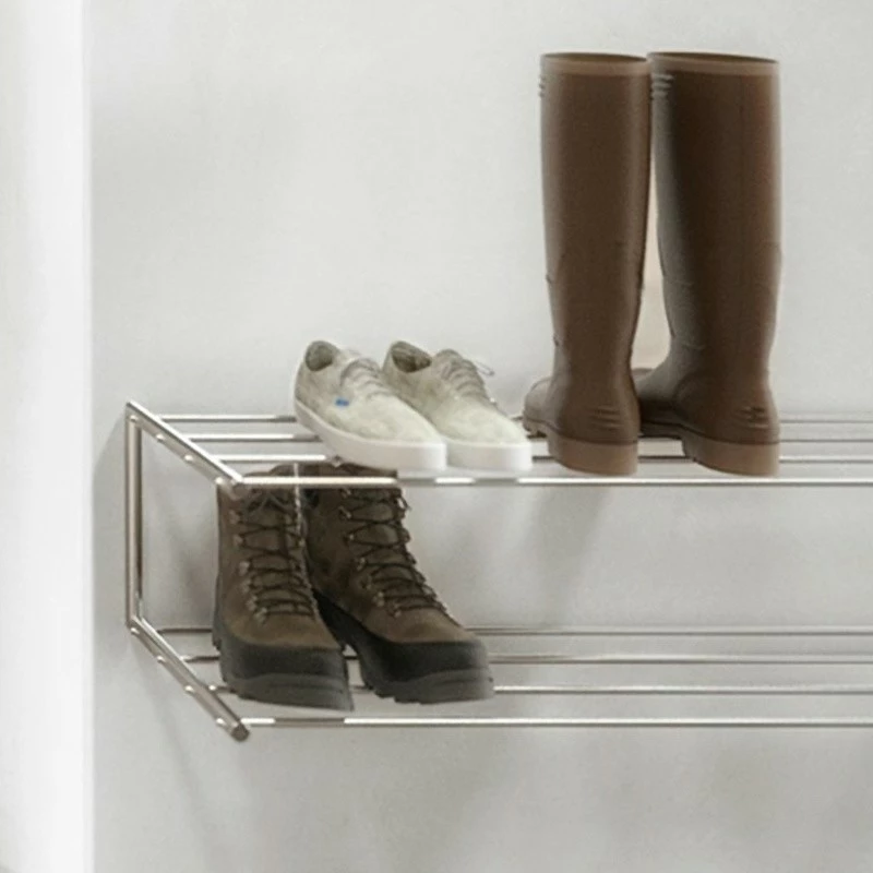 Das Nova Schuhregal 100cm von Frost überzeugt mit einem klaren Design und ausgezeichneter Funktionalität. Der Designer Bønnelycke MDD entwickelte diese Serie mit gerader Linienführung und gut durchdachtem Konzept für den bekannten Hersteller. Das Schuhregal wird in beliebiger Höhe an der Wand montiert. Sie können mehrere Regale miteinander kombinieren und die Ablageflächen gut auch für Taschen, Sportgeräte oder dekorative Objekte benutzen. Die offene Bauweise verleiht dem Modell Leichtigkeit und Transparenz. Das ist bei kleinen Räumen von Vorteil, um ein harmonisches Bild zu erzielen.