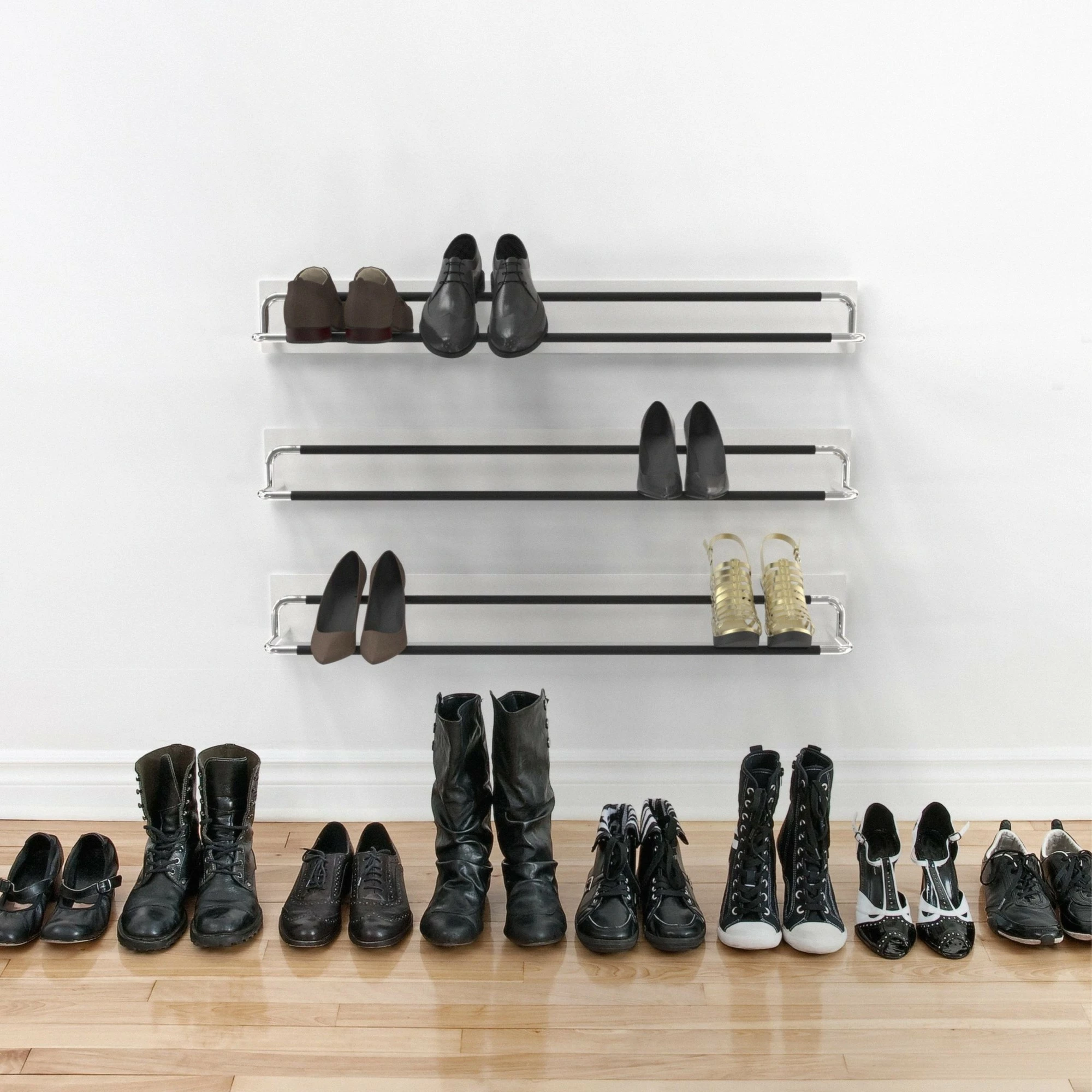 Eine Platte und zwei Stangen – mehr braucht ein Schuhregal nicht, um seinen Zweck voll zu erfüllen. Im Rada Schuhregal stehen die Schuhe wahlweise vorwärts oder rückwärts, es kann beliebig kombiniert werden und ist aus robustem Stahl gefertigt. Nicht zuletzt spart es durch die Wandaufhängung wertvollen Platz in kleinen Fluren oder Ankleidezimmern. Durch die ausgeklügelte Befestigung schwebt das Regal scheinbar über dem Boden, was das klare Design zusätzlich unterstreicht. Das Schuhregal ist in zwei Größen und zwei Farben – Schwarz und Weiß – erhältlich.