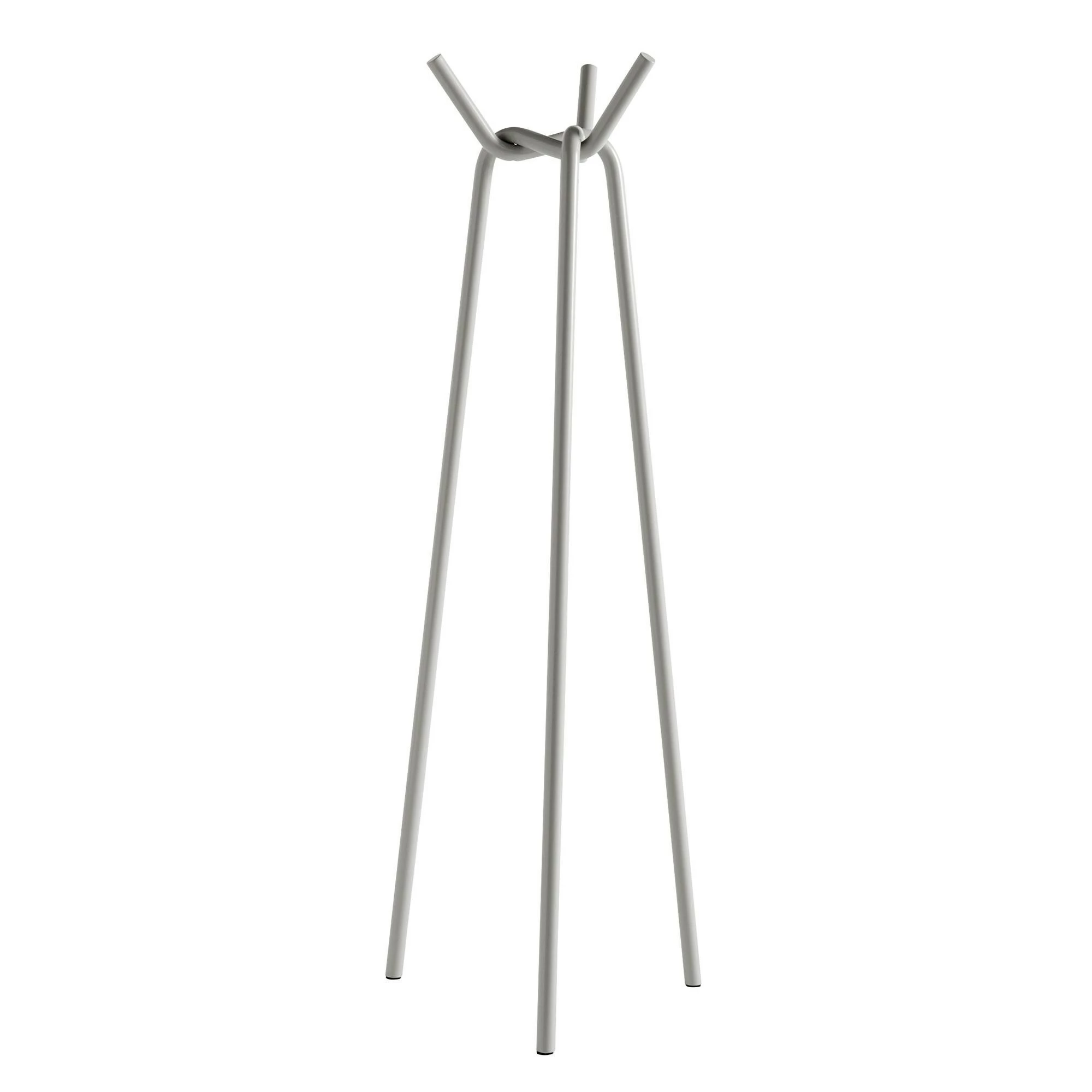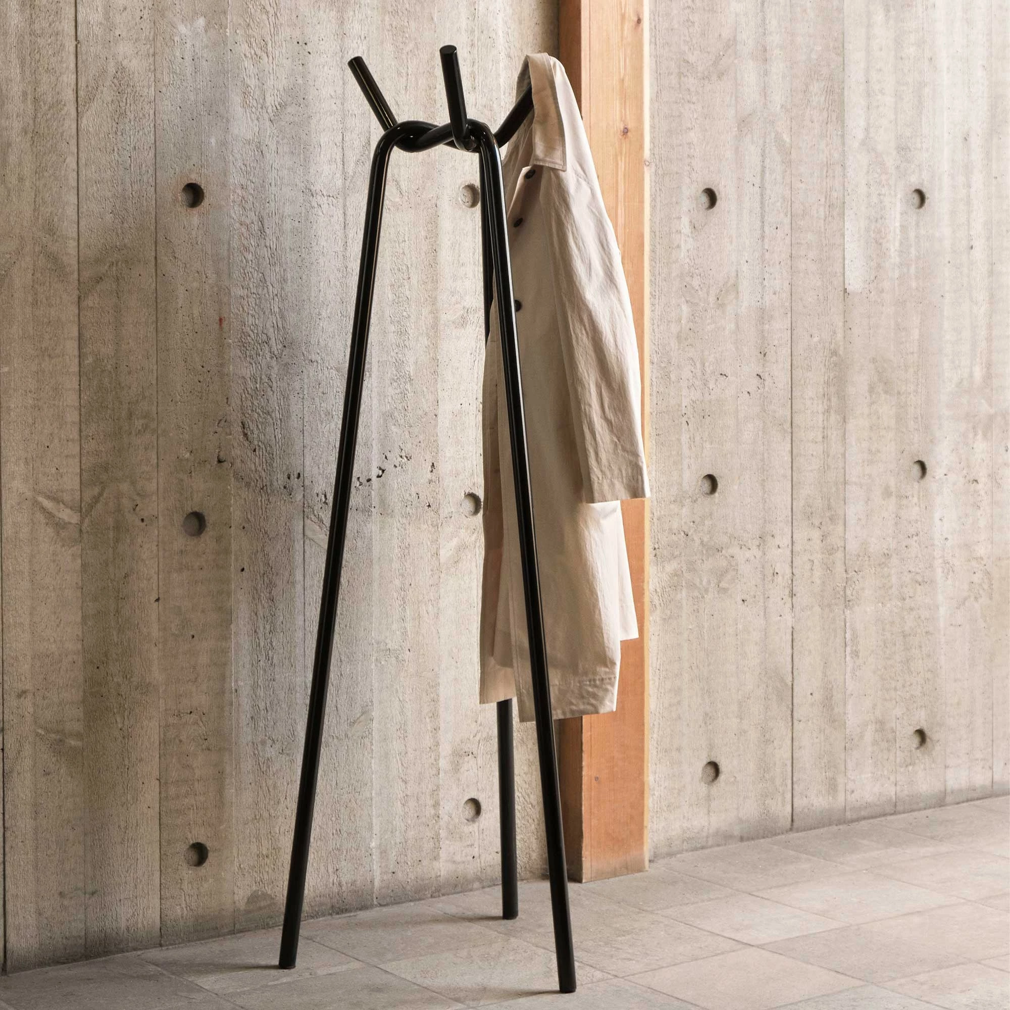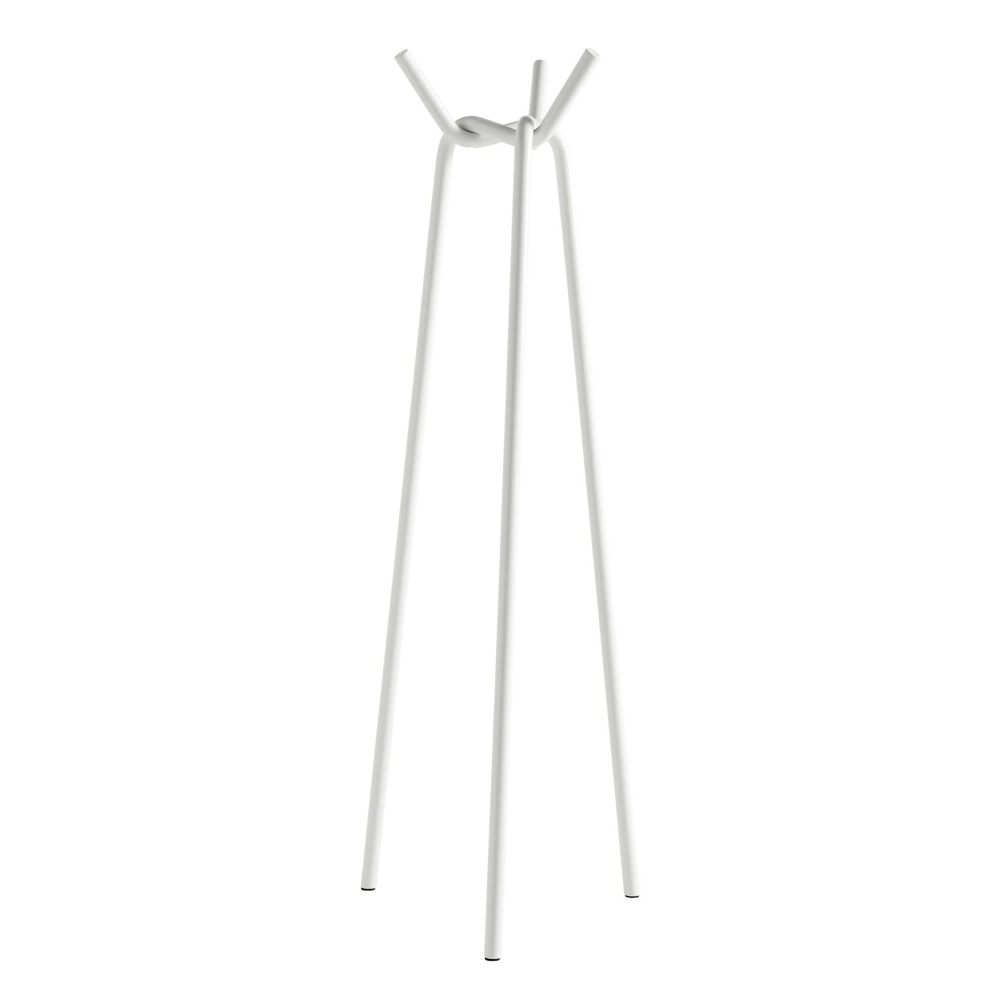 Knit bedeutet auf Deutsch stricken. Der Name bezieht sich auf den kunstvollen Knoten, den die drei pulverbeschichteten Stahlrohre des Garderobenständers bilden. Jedes ist im oben leicht s-förmig im rechten Winkel gebogen. Dadurch finden die Rohre miteinander halt wie Maschen beim Stricken. Die oberen geraden Enden dienen als Haken zum Aufhängen der Kleidungsstücke. Nach unten hin verlaufen die drei Rohre gerade und leicht ausgestellt und geben dem Knit Garderobenständer festen Stand. Die spezielle Form verleiht dem Knit Garderobenständer einen dreidimensionalen Charakter.