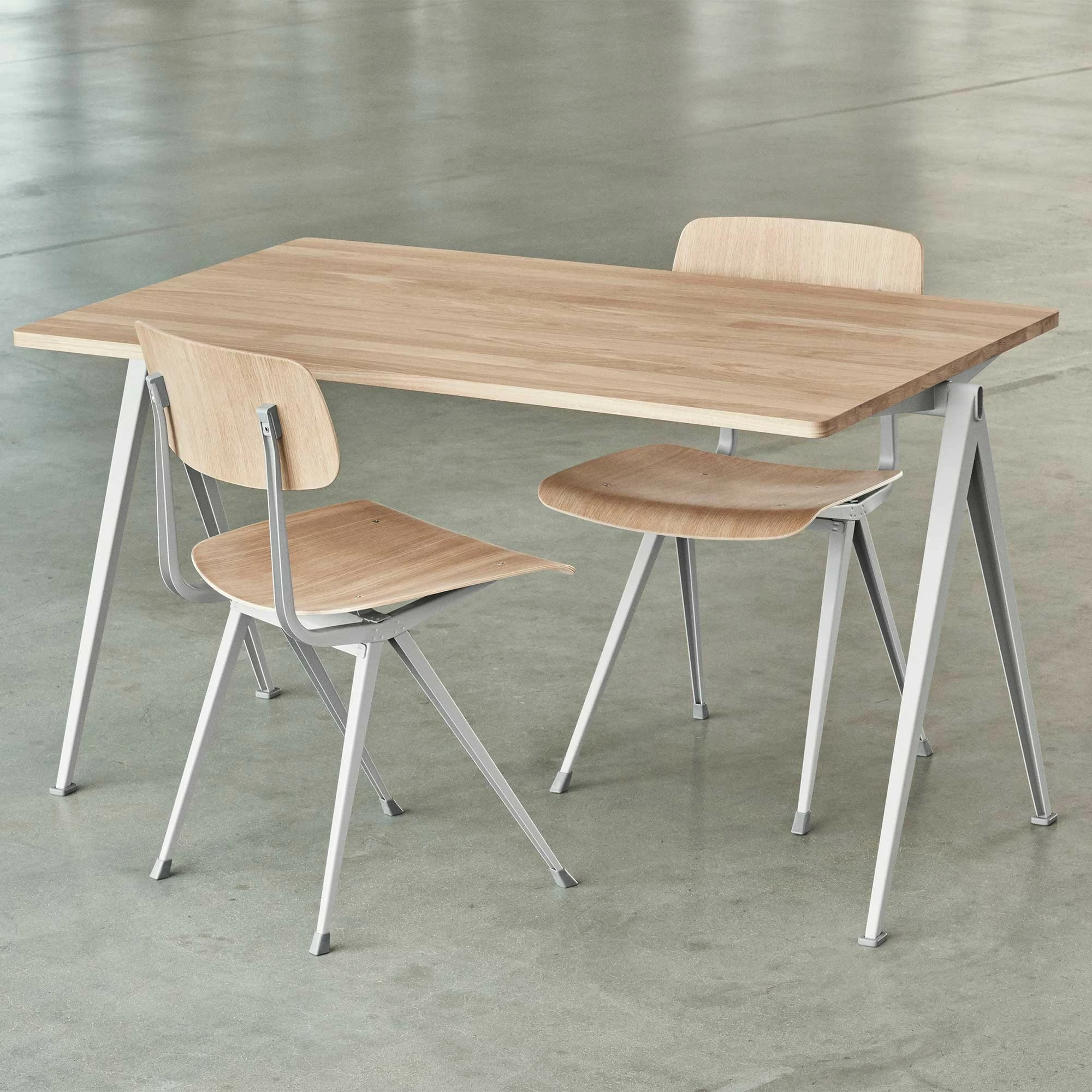 Passend zu diesem Klassiker des Industrie-Designs sind auch Stühle und Bänke erhältlich. Mit diesen Möbeln können Sie Ihr Esszimmer auf extravagante und doch schlichte Weise einrichten. Da die Platte aus Eichenholz lackiert ist, ist der Tisch sehr pflegeleicht. Sie benötigen nur ein feuchtes Tuch, um Schmutz und Staub einfach wegzuwischen. Das pulverbeschichtete Gestell aus Stahl sorgt für ausgezeichneten Halt und Robustheit.