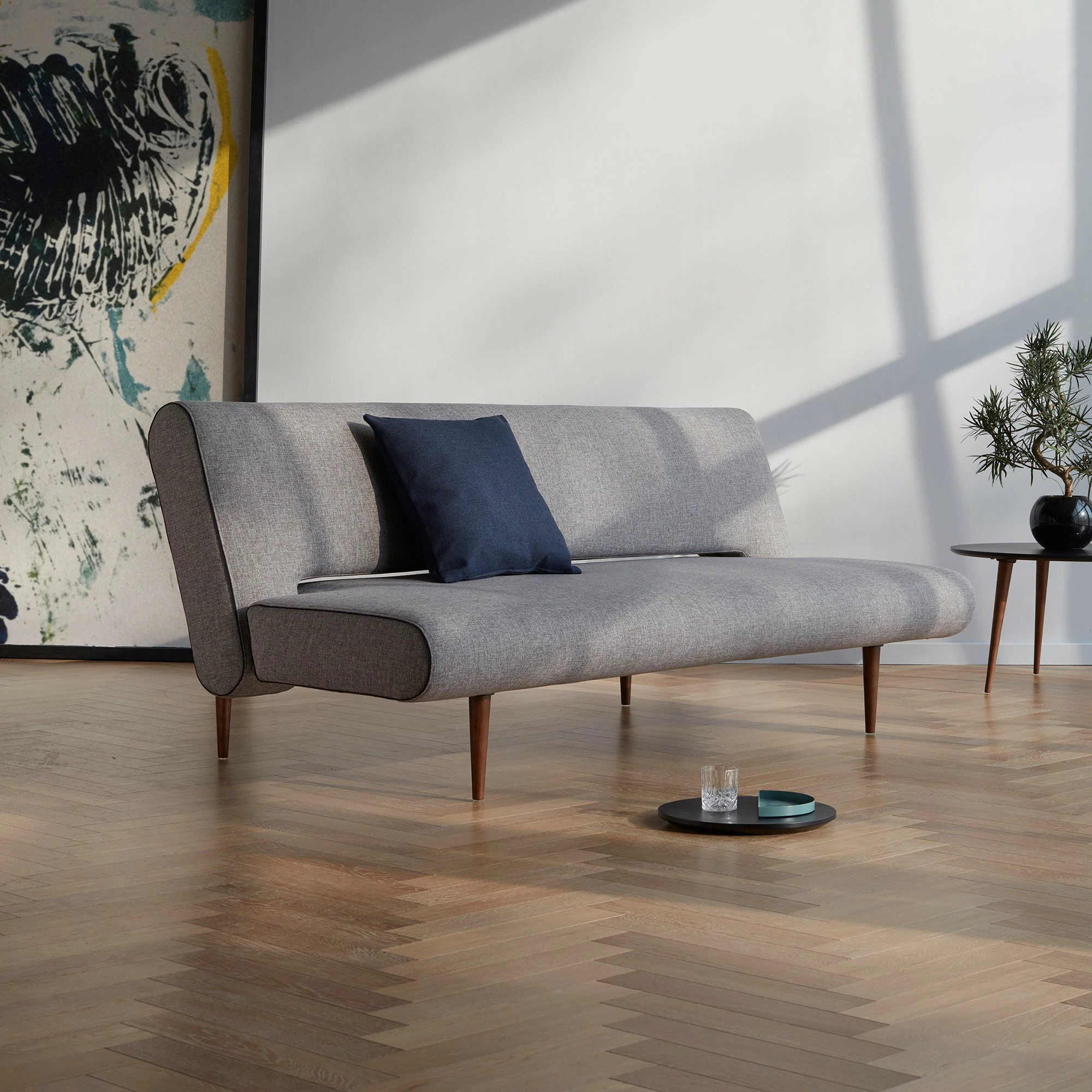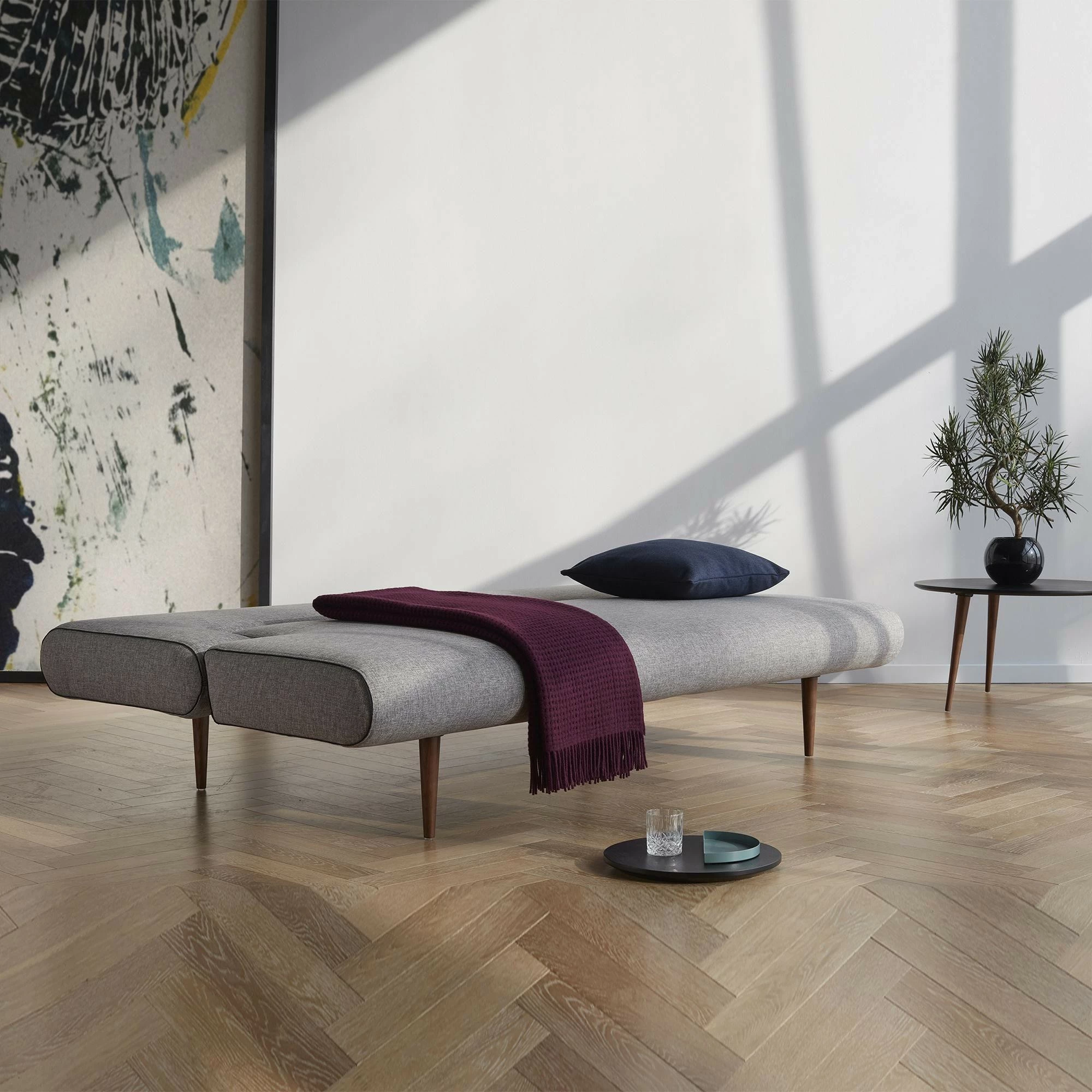 Vom Design her bewegt sich das Unfurl Schlafsofa im Mid-Century-Stil. Die Kombination aus gepolsterter Sitzfläche und Rückenlehne mit elegantem Stoffbezug und dunklen Holzfüßen verleiht Unfurl seinen stylisch-modernen Look. Das Unfurl Schlafsofa ist dank seiner 2-in-1-Funktion also nicht nur praktisch, sondern auch absolut chic – und dabei auch noch platzsparend, perfekt für Gäste oder kleine Appartements.