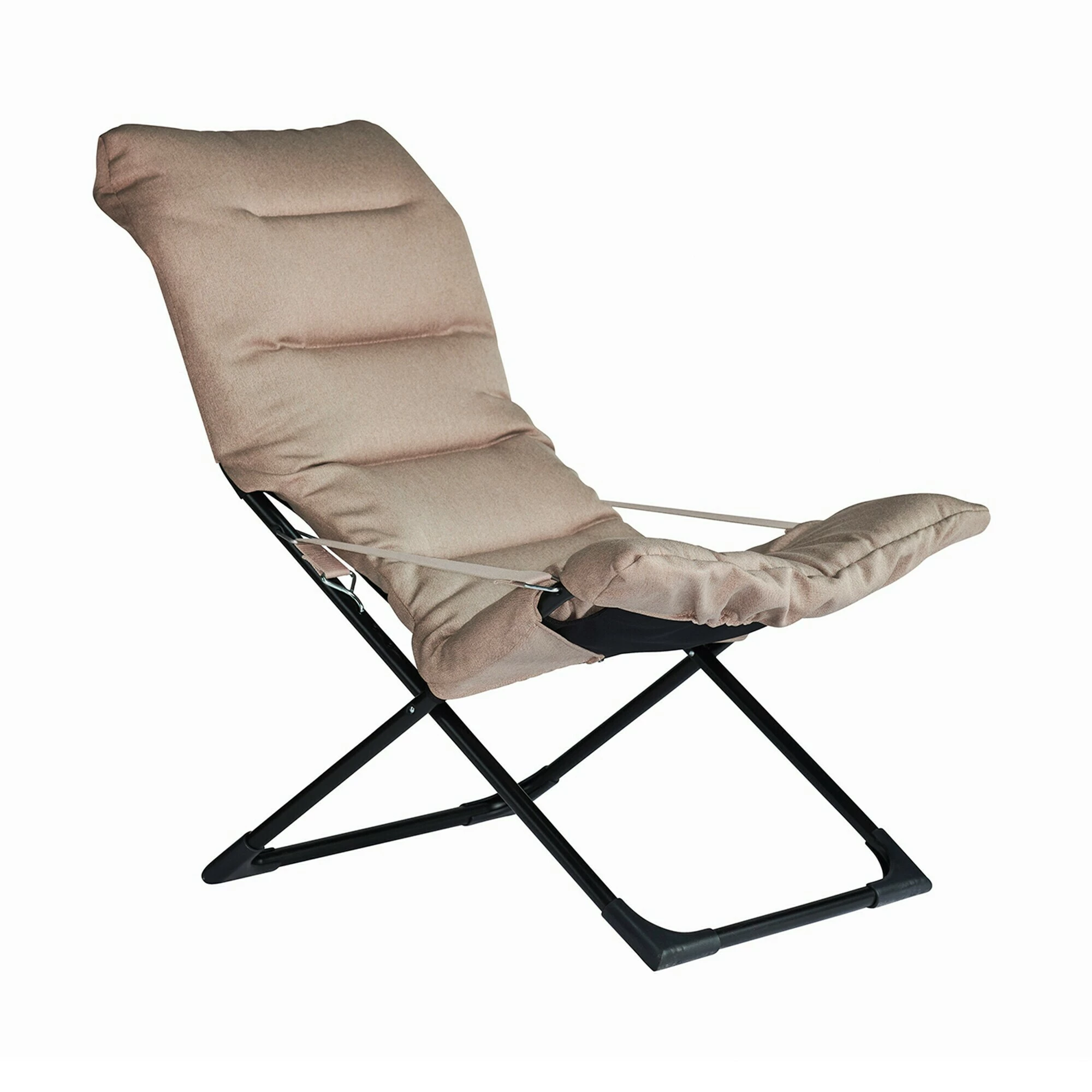 Für den Fiesta Sessel verwendet der Designer aus Italien eine Basis aus pulverbeschichtetem Stahl. Die geschwungene Rückenlehne lädt dazu ein, es sich bequem zu machen. Zum hervorragenden Sitzkomfort tragen die Armlehnen bei, die aus breitem Gurtband bestehen. Sie halten außerdem das dicke Sitzpolster an der richtigen Position. Das Polster ist mit Vlies gefüllt und hat einen Bezug aus Polyester. Der Fiesta Sessel ist mit bis zu 120 kg belastbar. Wird er nicht mehr gebraucht, kann man ihn wie einen Liegestuhl für den Garten zusammenklappen. Je nachdem, ob man lesen oder einen Mittagsschlaf halten möchte, kann man die Lehne verstellen.