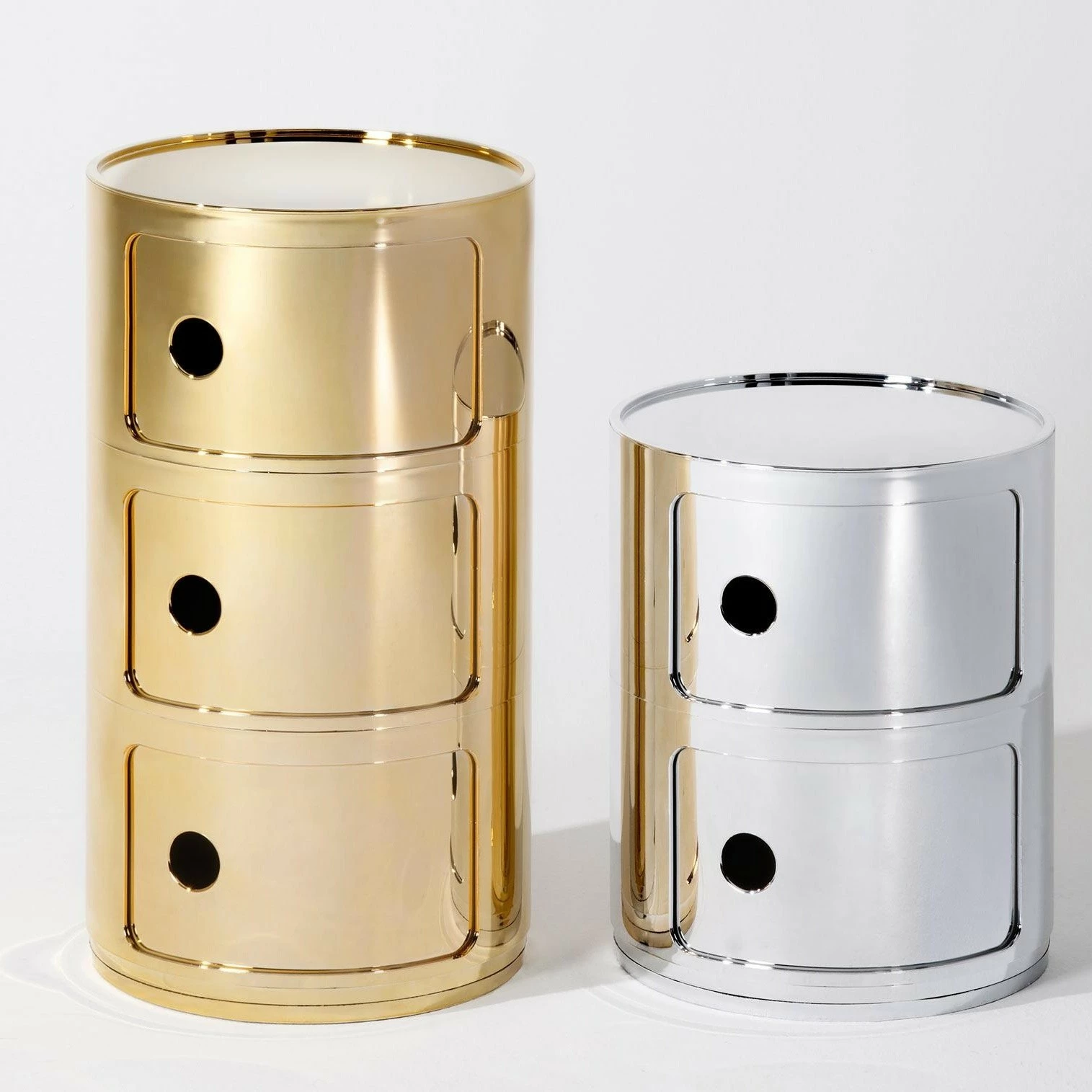 Der Componibili 3 Metallic Container wurde von Anna Castelli Ferrieri für die Marke Kartell entworfen. Er gehört zu einer Kollektion von stylishen Aufbewahrungs-Accessoires. 1967 als Modulsystem für verschiedene Verwendungsmöglichkeiten konzipiert, lassen sich die einzelnen Container einfach übereinander türmen.