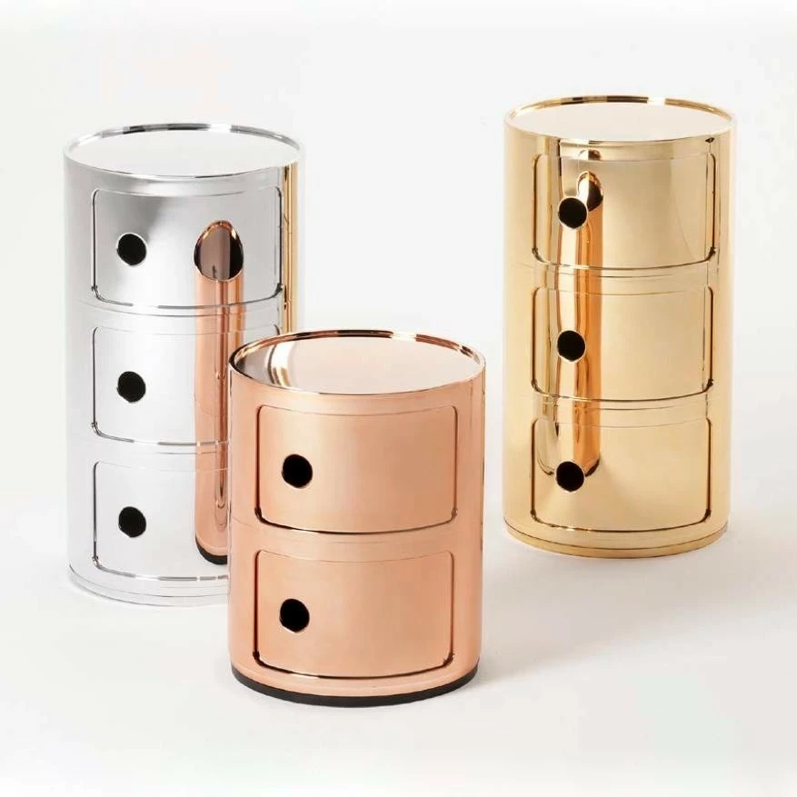 Dank seiner simplen zylindrischen Form ist der Componibili 3 Metallic Container beliebig erweiterbar. Er lässt sich nicht nur auf den Boden stellen und als praktisches Ablagetischchen mit drei separaten Fächern verwenden. Auch als Container auf dem Schreibtisch oder in einem Regal lässt er sich platzieren und zusammen mit weiteren Componibili-Modulen zu einer raumhohen Aufbewahrungssäule stapeln. Kleine Überstände unten und oben verhindern, dass die einzelnen Elemente verrutschen. Geöffnet wird jedes Fach seitlich über ein Schiebetürchen, das mit einem kreisrunden Griffloch versehen ist. Damit besticht das Modulsystem nicht nur durch seine Funktionalität, sondern auch durch sein formschönes Design, das gut in jeden Wohn- oder Arbeitsraum passt. Aus metallisiertem ABS-Kunststoff gefertigt, zeichnet sich der Componibili 3 Metallic Container durch eine stabile Robustheit aus.