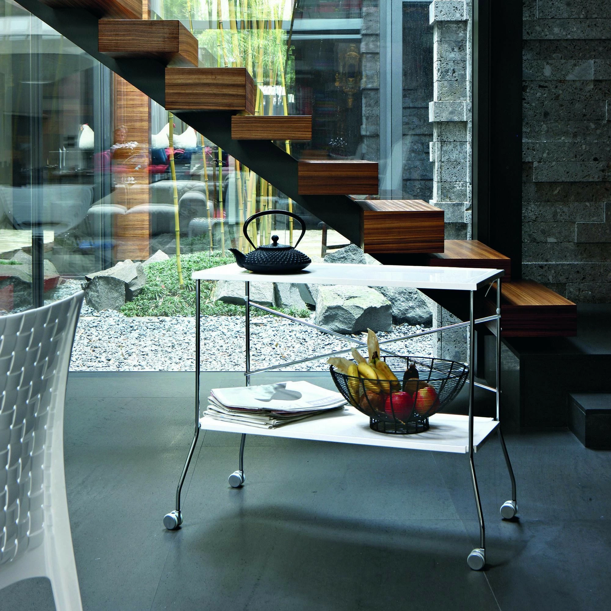 Der Flip Rollwagen wurde von Antonio Citterio und Toan Nguyen für die Marke Kartell entworfen. Dabei überraschen die beiden Designer mit einem funktionalen Möbelstück, das den Alltag der Menschen erleichtert.