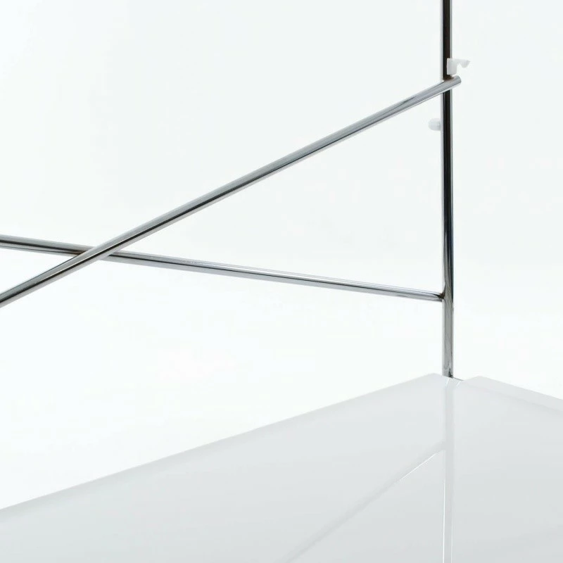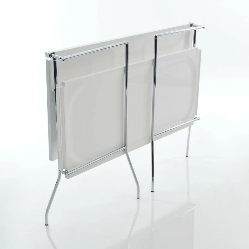 Im unteren Drittel des Rollwagens ist eine Ablagefläche aus Polymethylmethacrylat befestigt. Die Platte an der Oberseite besteht aus demselben, pflegeleichten Material. Es lässt sich mit einem feuchten Tuch reinigen. Der Flip Rollwagen ist 80 cm lang und 42 cm breit. Die Höhe beträgt 71 cm. Wird der Rollwagen nicht benötigt, lässt er sich mit wenigen Handgriffen zusammenklappen und platzsparend verstauen. Das schmale Gestell passt dann auch in kleine Abstellräume oder Nischen.