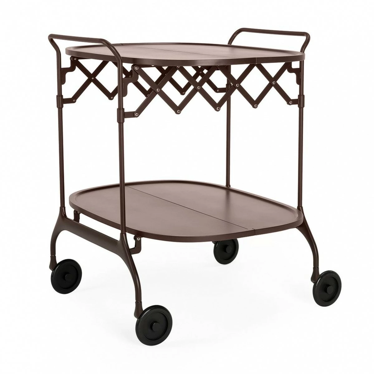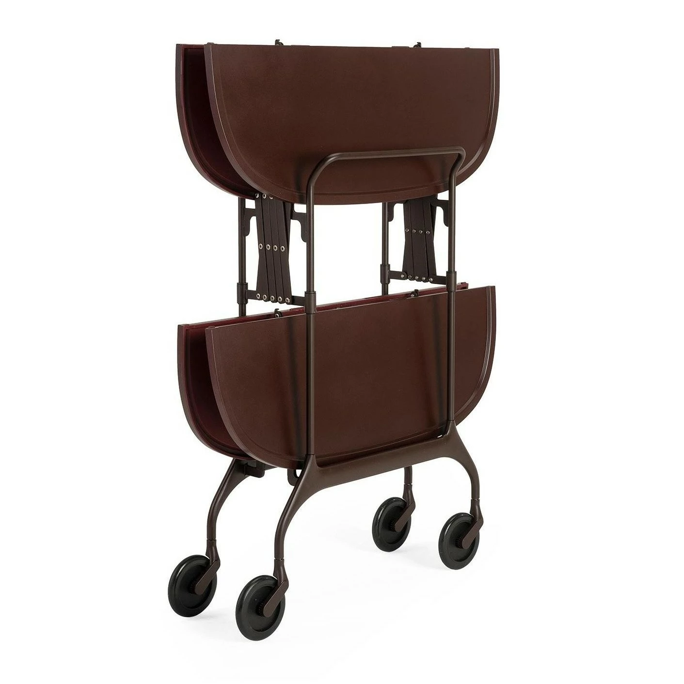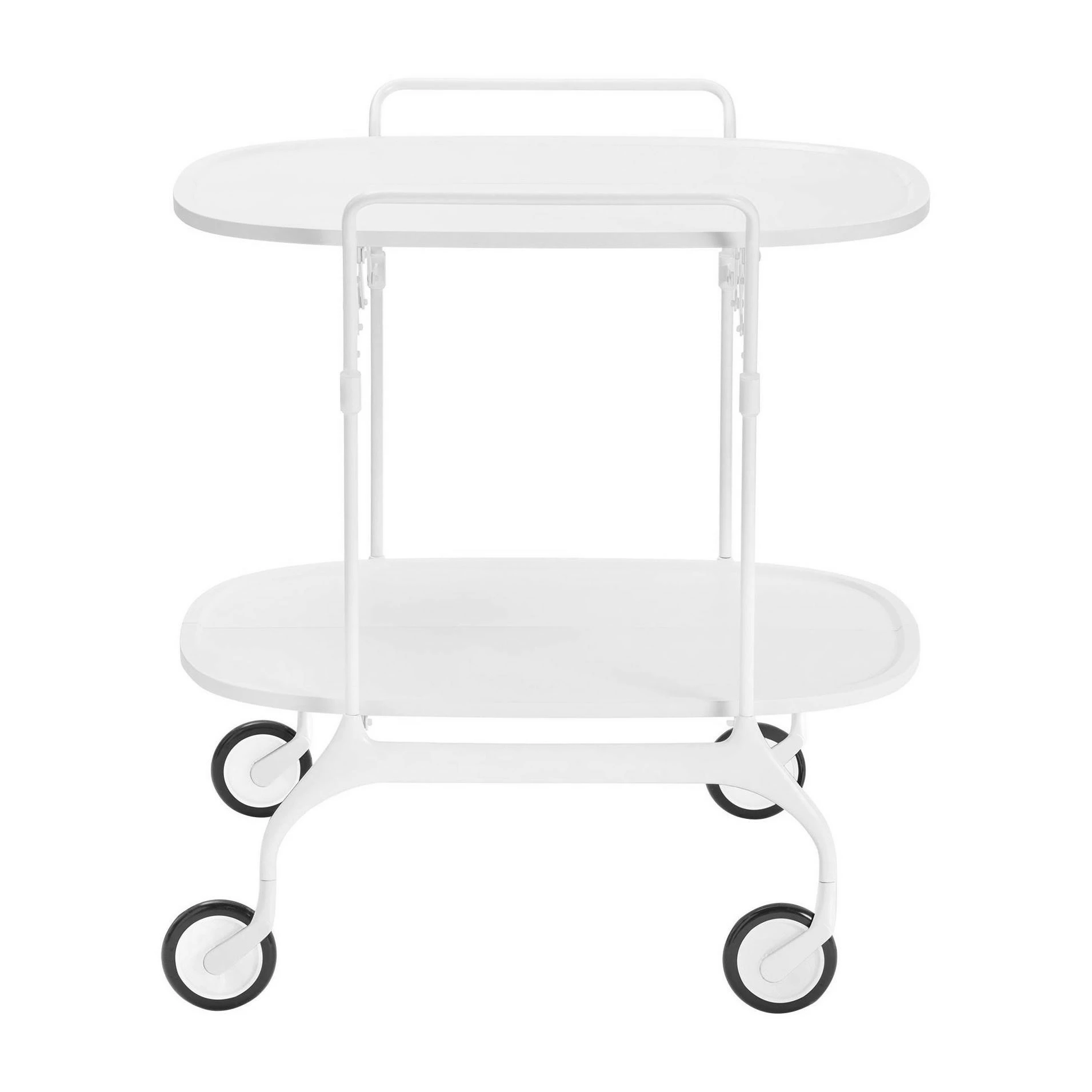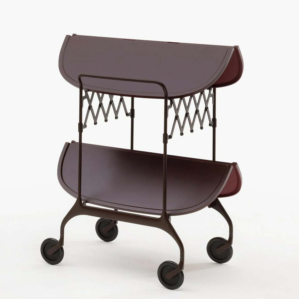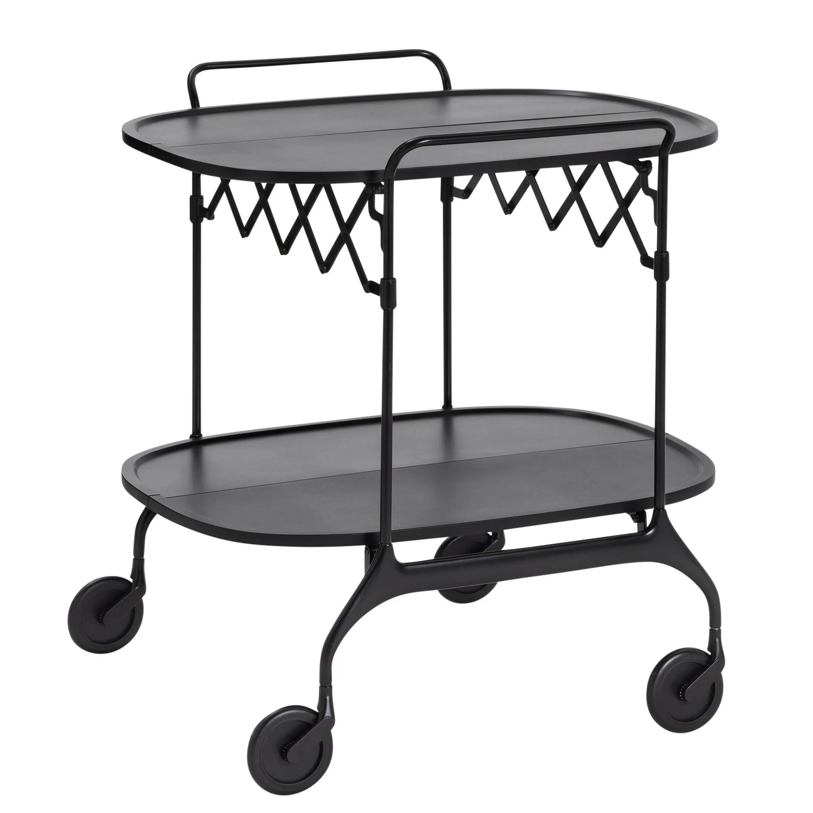 Der Gastone Servierwagen klappbar matt wurde von Glen Oliver Löw und Antonio Citterio für die Marke Kartell entworfen. Beide Designer haben sich dem zeitlos eleganten Stil mit einem gewissen Hang zum Minimalismus verschrieben. Sie stehen für klare Formen und Funktionalität, was sich auch am Gastone Servierwagen klappbar matt zeigt. Das Modell vereint Funktionalität und edles Design. Die Materialkombination aus Kunststoff und dem metallenen Trägerrahmen macht ihn zum Hingucker. Für all jene Haushalte, die in der Küche und am Esstisch wenig Platz zur Verfügung haben ist der Servierwagen eine richtige Bereicherung. Wenn er nicht gebraucht wird, lässt sich der 62 cm tiefe Servierwagen auf eine Tiefe von 23 cm zusammenklappen. Mit einer Höhe von 70 cm lässt es sich auf der zusätzlichen Stellfläche gut arbeiten. Insgesamt bietet der Gastone Servierwagen klappbar matt zwei Ablagefächen aus Kunststoff. Vier hochwertige Rollen sorgen dafür, dass sich der Servierwagen mühelos schieben lässt. So gelangt er ohne Anstrengung von der Küche in das Ess- oder Wohnzimmer. Zwei Handgriffe an den Seiten erleichtern das Navigieren. Auch bei Grillfesten im Garten ist er ein hilfreicher Begleiter. Die Ablageflächen aus lackiertem Kunststoff sind kratzfest und lassen sich bequem mit einem feuchten Tuch abwischen.