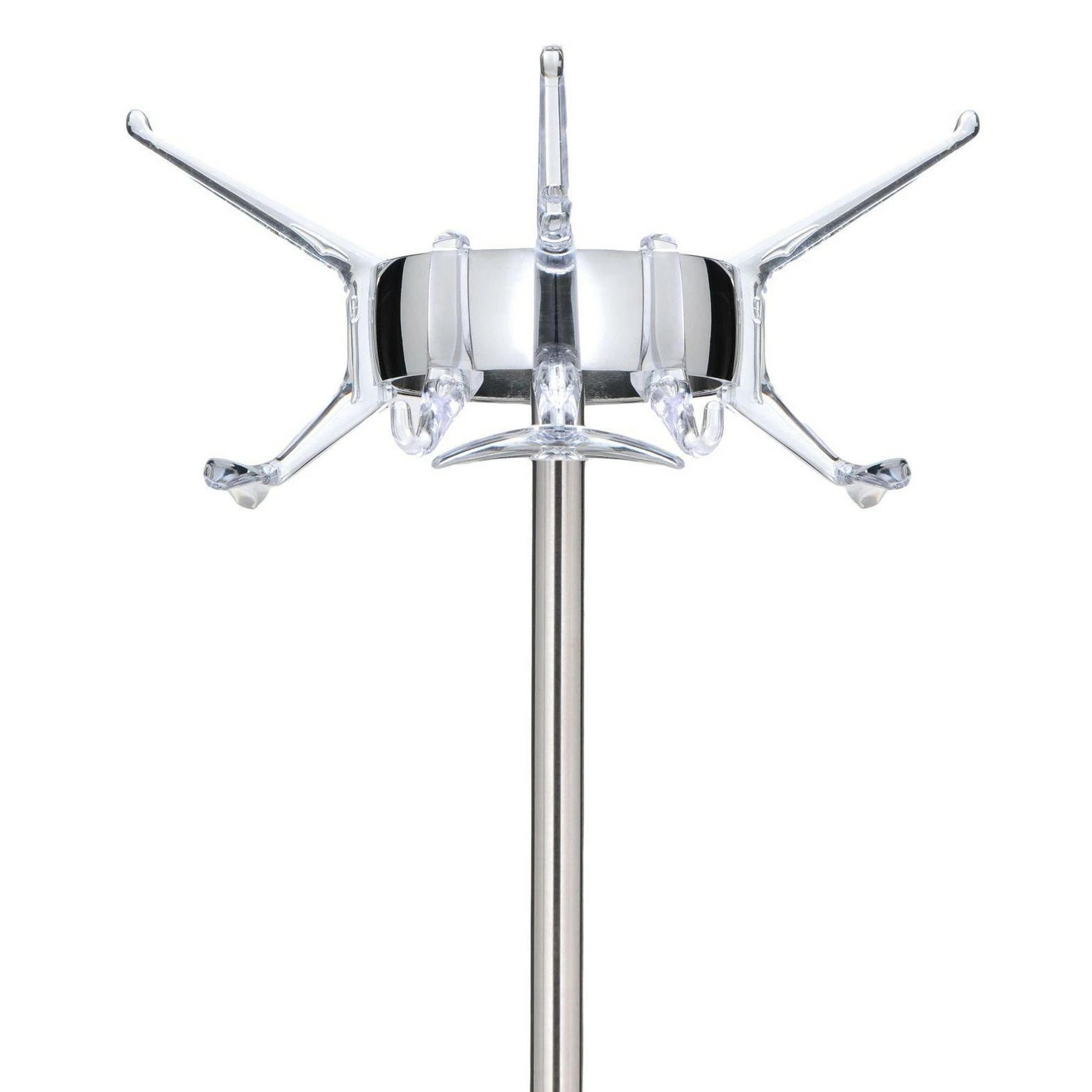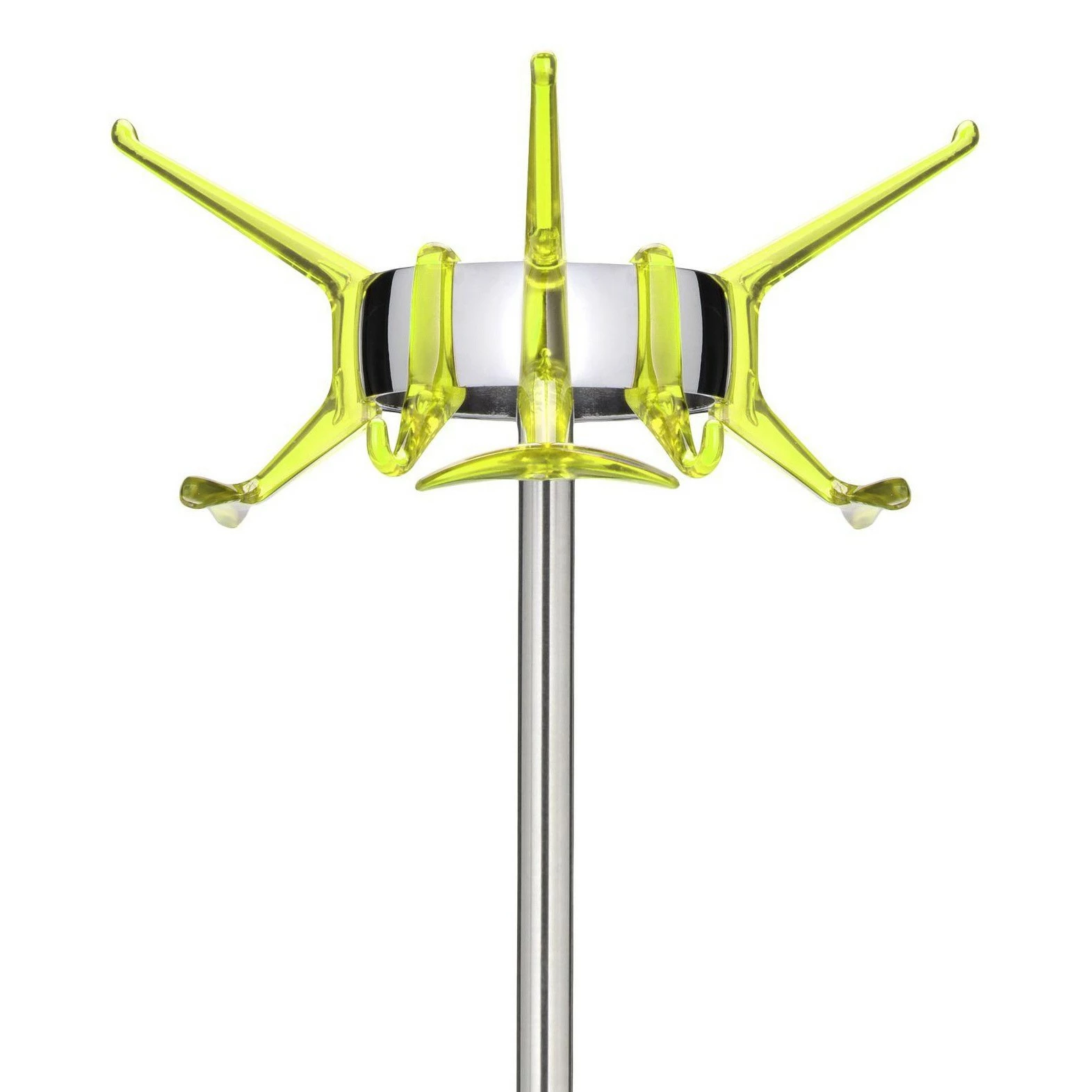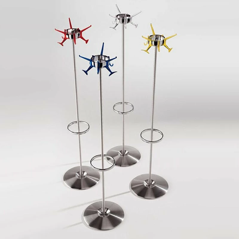 Schon alleine das Material macht den Hanger Kleiderständer zum optischen Blickfang. Meda entschied sich nämlich für poliertes Aluminium für das Gestell. Einen interessanten Kontrast zu dem glänzenden Material bilden die sechs an der Oberseite des Kleiderständers befestigten Haken. Sie sind in verschiedenen Farben erhältlich. So schafft man sich einen interessanten Farbtupfer in den Flur oder die Garderobe. Sicheren Stand gewährleistet dem Hanger Kleiderständer ein runder Fuß. In seinem Mittelpunkt entspringt ein dünnes Stahlrohr. Im unteren Drittel ist ein Ring befestigt, der als Schirmständer fungiert. Am Ende der Stange ist ein breiter Ring befestigt, der wiederum die Kleiderhaken trägt. Mindestens sechs Mäntel oder Jacken finden auf dem Kleiderständer Platz.