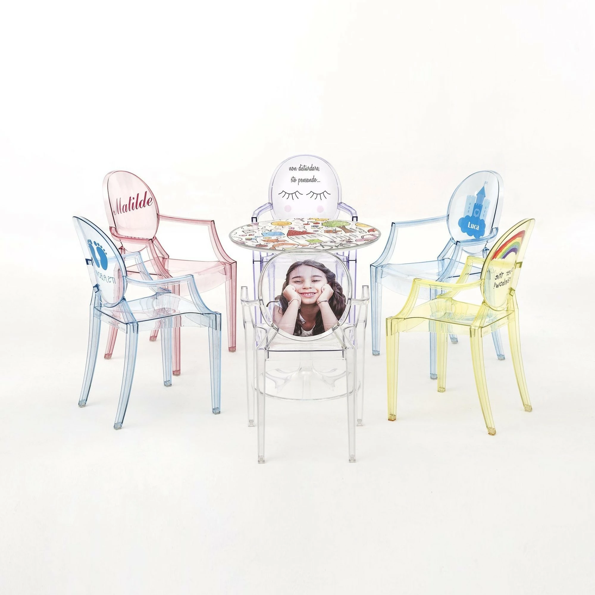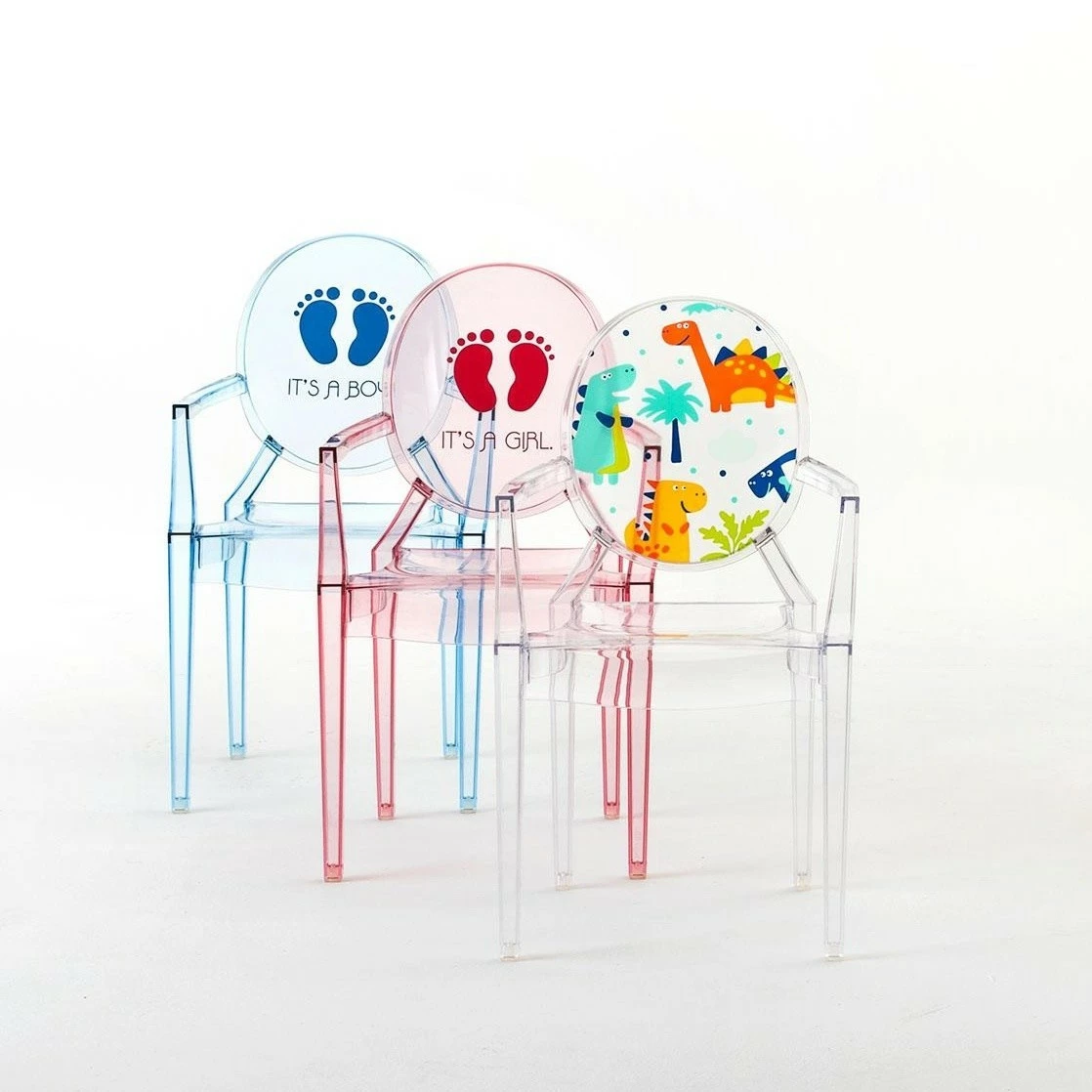 Kinder haben geschmacklich ihre eigenen Vorlieben. Deshalb steht Ihnen eine breite Auswahl an Farben und Motiven zur Verfügung. Neben transparent mit einem Herz, Dinosaurier oder Sketch-Motiv können Sie den Lou Lou Ghost Kinderstuhl mit Motiv auch in Gelb mit einer Sonne, in Hellblau mit einem Prinzen oder der Aufschrift It’s a boy sowie in Pink mit einer Prinzessin oder der Aufschrift It’s a girl wählen.