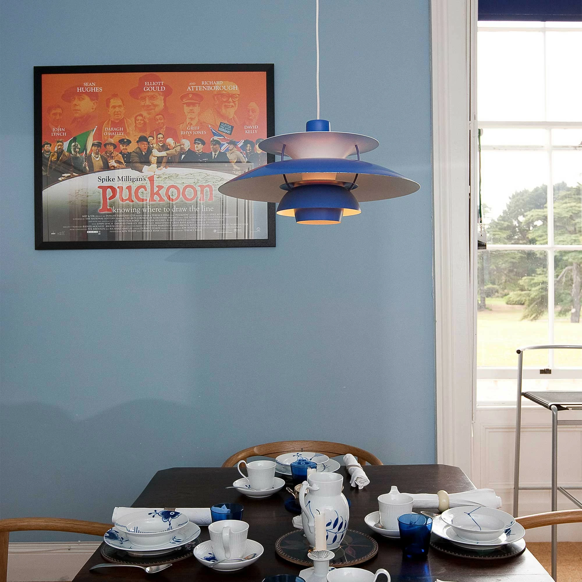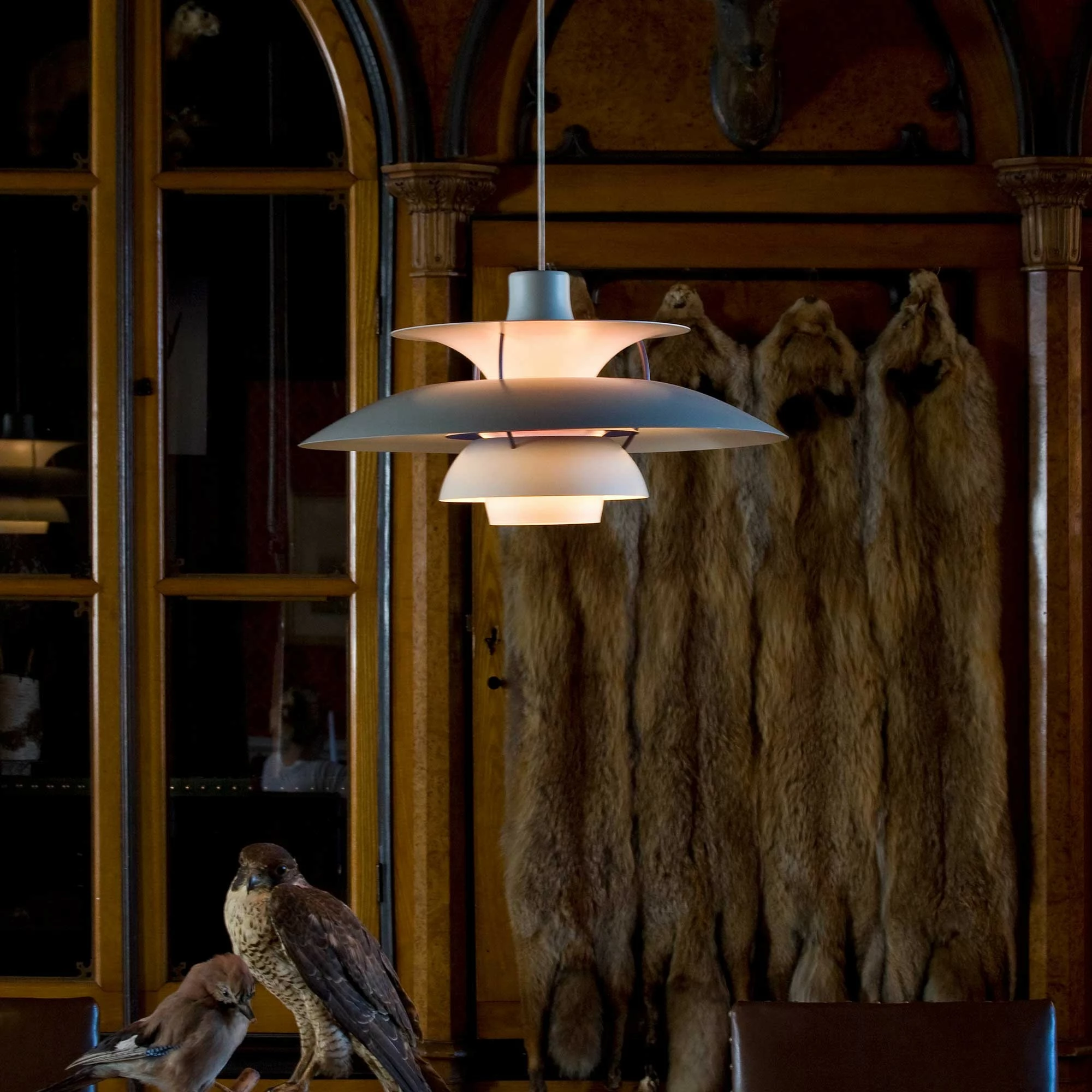 Weiches diffuses Licht, das von mehreren Lampenschirmen sowohl waagrecht als auch senkrecht abstrahlt, sorgt für eine angenehme Beleuchtung. Die Schirmform der PH 5 Hängelampen baut auf einer logarithmischen Spriale auf, in deren Mittelpunkt das Leuchtmittel platziert ist.