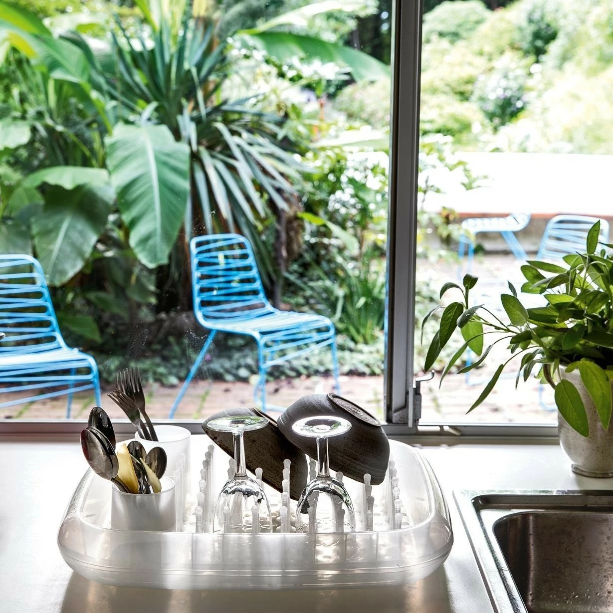 Im Gegenteil: Der Flux Stuhl ist aus polyesterlackiertem Stahlrohr gefertigt und dank Rostschutzbehandlung auch draußen nutzbar. Da Flux gestapelt werden kann, ist der Stuhl zudem super platzsparend aufzubewahren.