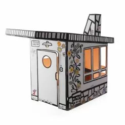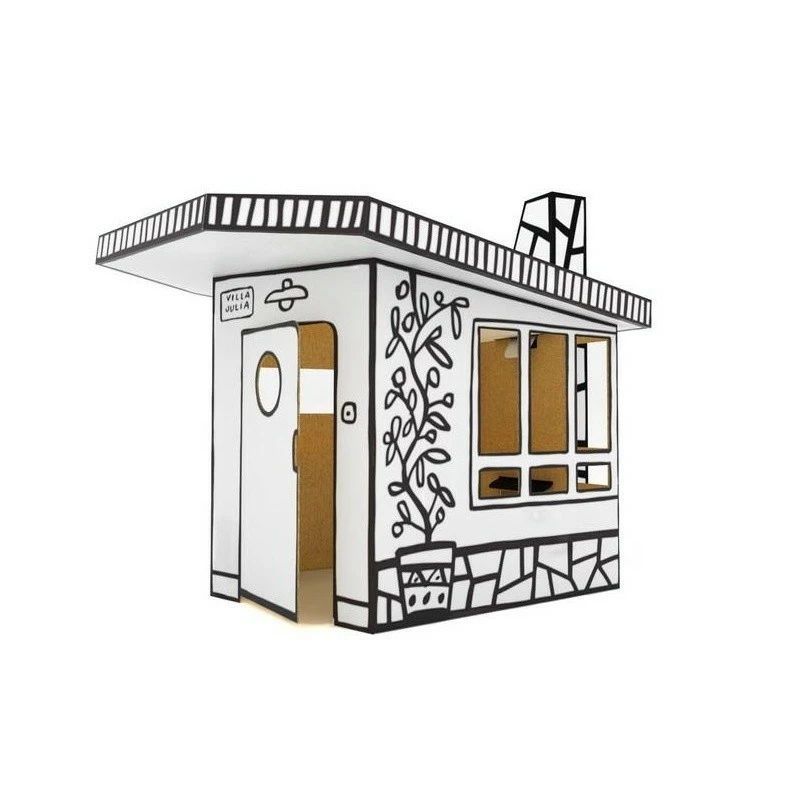 Das Me Too Villa Julia Kinder-Spielhaus besteht aus schwarz-weißem Karton. Dazu gibt es Sticker, mit denen die Kinder das Spielhaus individuell dekorieren können. Das Spielhaus hat eine asymmetrische Form und einen originellen Kamin an der hinteren Hauswand. Durch eine Haustür mit Bullaugen-Fenster gelangt man hinein und kann durch verschieden große Fenster nach draußen sehen. Die äußere Hauswand wird von hübschen Blumen geschmückt. Ein Wasserhahn, eine Schlange, die frech über dem Fenster kriecht und in deren Maul geradewegs ein Trupp Ameisen spaziert, ein Vogelnest… Wer möchte, kann all die hübschen Schwarz-Weiß-Dessins auch mit Buntstiften ausmalen.