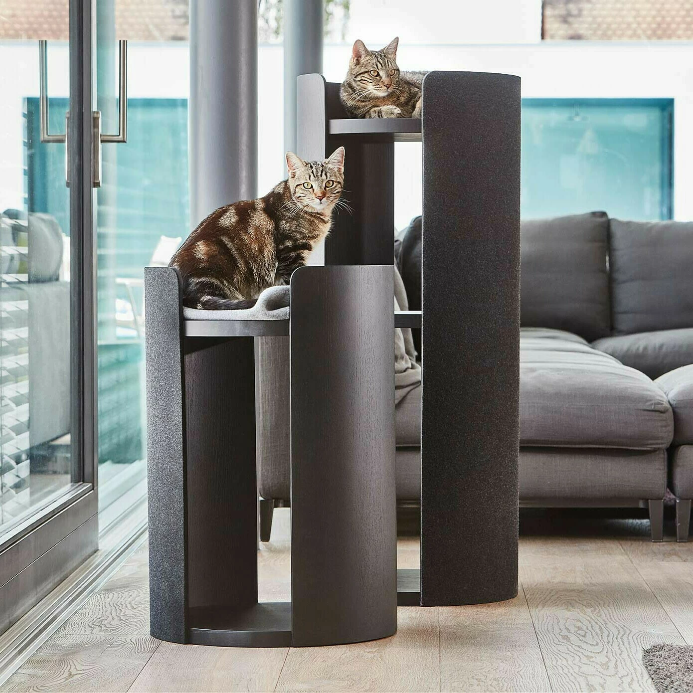 Während der eine Stubentiger genüsslich seine Krallen wetzt, kuschelt sich der andere ins Innere des Torre Kratzturms S. Ein Dritter überblickt derweil von seinem Aussichtspodest die Lage. So kann das vielseitige Katzenmöbel gleich eine ganze Katzenfamilie beschäftigen. Eine kreisrunde Holzscheibe bildet den Boden, eine weitere dient dem Torre Kratzturm S als Plattform. Seine Wände werden von zwei Schalenflächen aus Formschichtholz gebildet, die sich exakt an die runde Grundfläche schmiegen. Zwei spaltartige Öffnungen ermöglichen den Zugang in die behagliche Katzenhöhle. Zum Kratzen und Wetzen der Katzenkrallen dient ein Filzbezug, der sich ganzflächig über eine der Außenwände zieht. Die gegenüberliegende Seite fügt sich ebenso wie die horizontalen Flächen des Torre Kratzturms S dank des gemaserten Eichenfurniers gut in das Interieur in Ihrem Wohnzimmer.