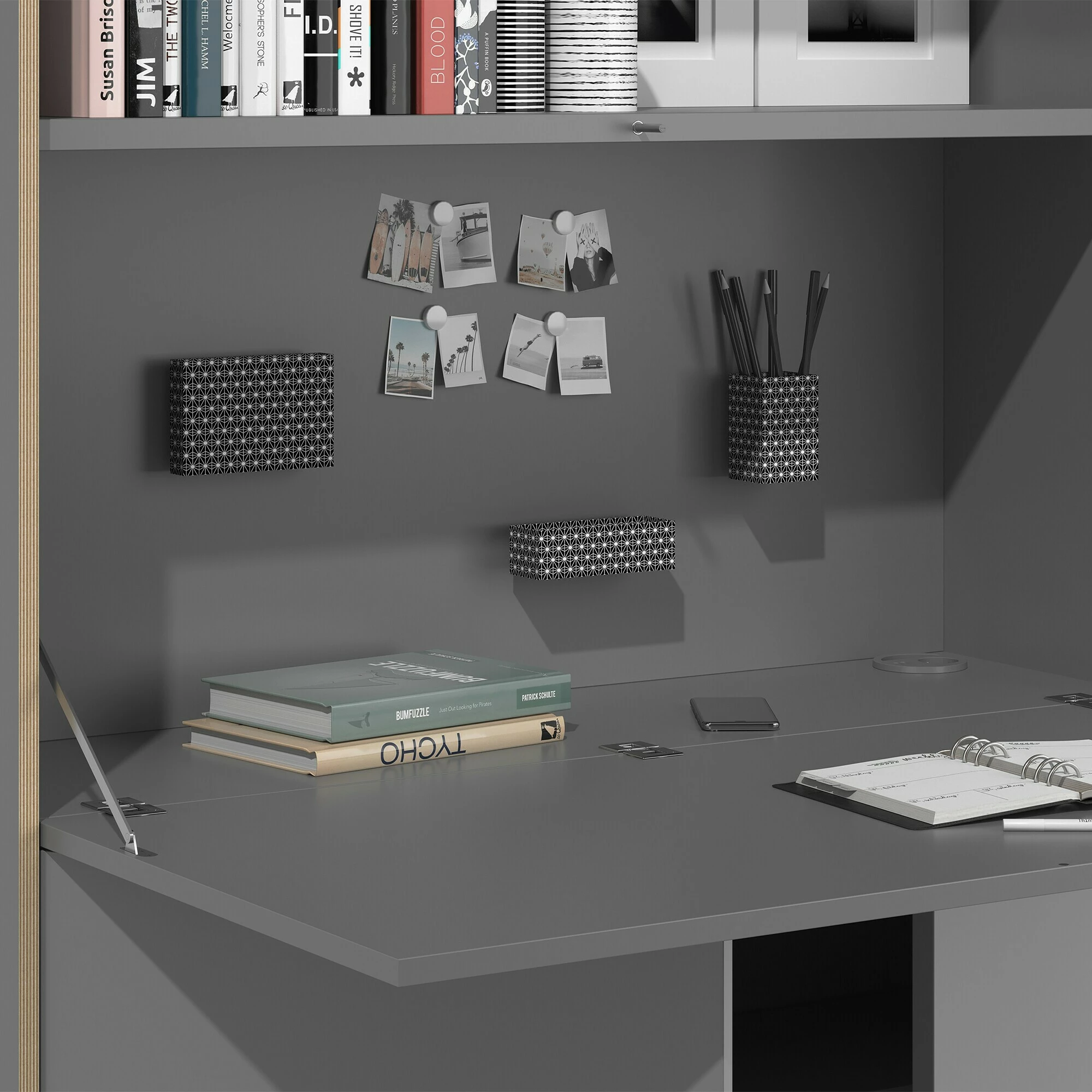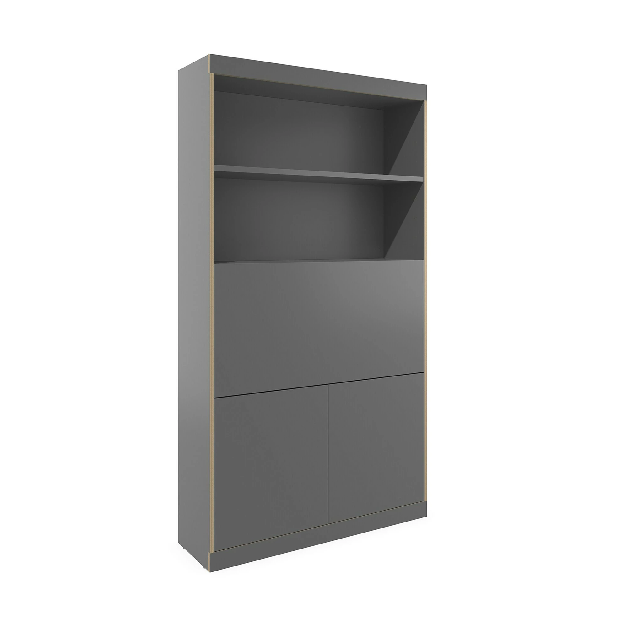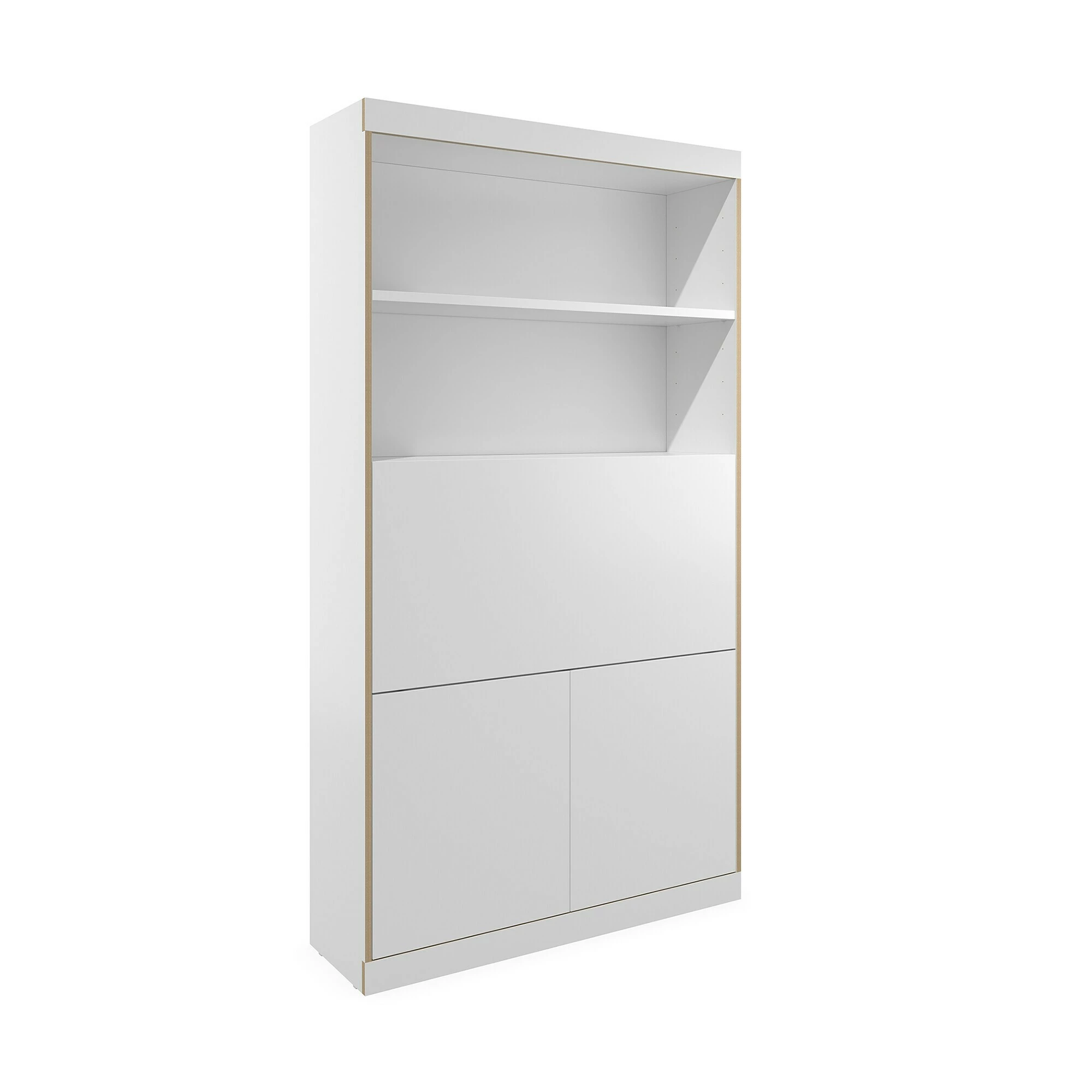 Mit dem Flai Home-Office Sekretär magnetisch 118x36x216,8cm stellen die Designer ein praktisches Möbelstück her, das im Homeoffice zum unverzichtbaren Begleiter wird. Damit wird es dem Ruf nach funktionalen Möbeln gerecht. Der untere Bereich ist als Stauraum gestaltet, der mit Türen verschlossen ist. Mit einem innovativen Magnetsystem lassen sich die Türen per Push-to-Open öffnen. Der mittlere Bereich wird als kleiner Schreibtisch verwendet. Die Arbeitsfläche kann nach Gebrauch eingeklappt werden. Für die Montage ist zu beachten, dass der Flai Home-Office Sekretär magnetisch 118x36x216,8cm an einer tragfähigen Wand befestigt werden muss. Im Arbeitsbereich ist hinten eine praktische Kabelauslassdose integriert. Auch eine Leuchte ist im Lieferumfang enthalten. Der Flai Home-Office Sekretär magnetisch 118x36x216,8cm besteht aus Birkenschichtholz mit einer Stärke von 1,9 cm. Das Oberteil bietet mit zwei Regalfächern viel Stauraum.