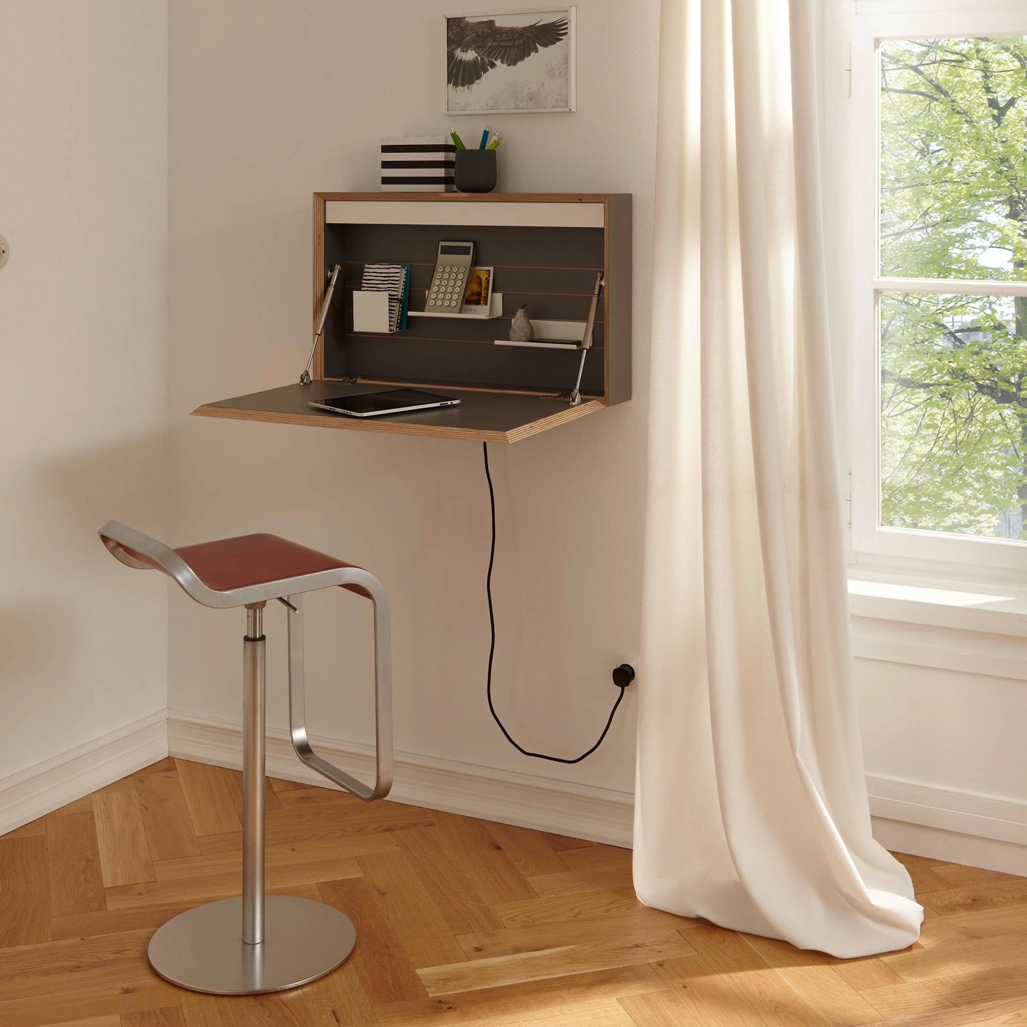 Der Flatbox LED Wandsekretär mit An/Aus Schalter überzeugt mit vielen Details: Im Lieferumgang enthalten ist eine LED-Leuchte, die beim Arbeiten, Basteln oder Schreiben für optimale Lichtverhältnisse sorgt. Außerdem ist in dem modernen Möbel eine Steckdose integriert. Die Steckdose befindet sich rechts oben im Inneren des Sekretärs.