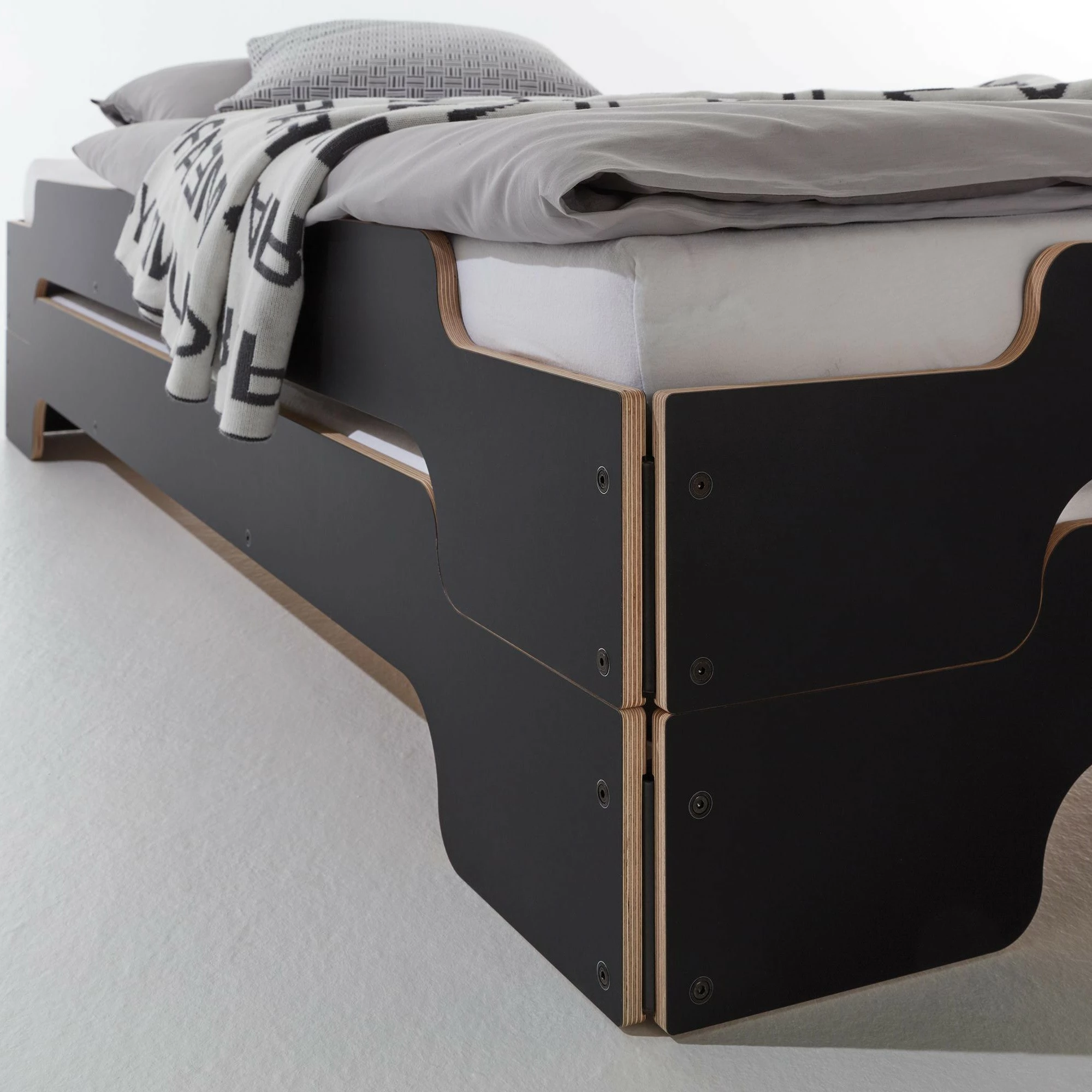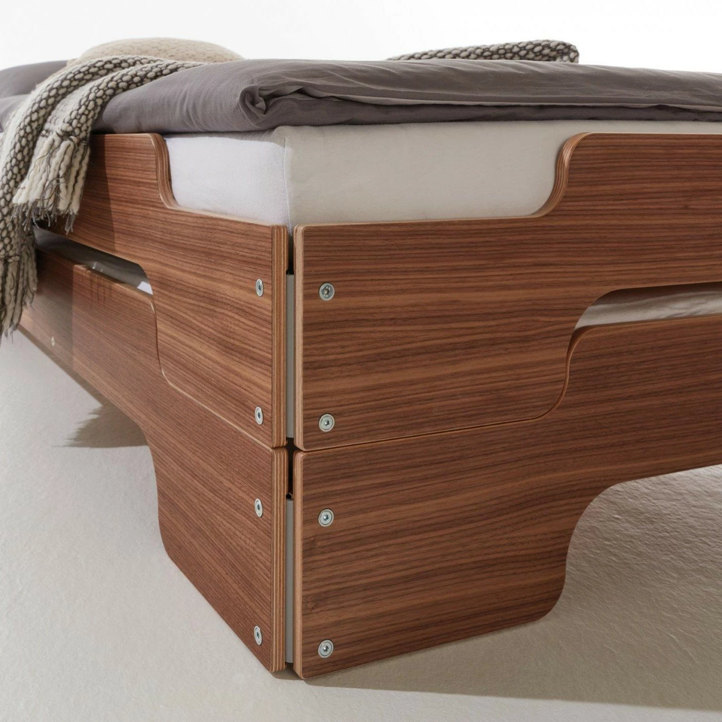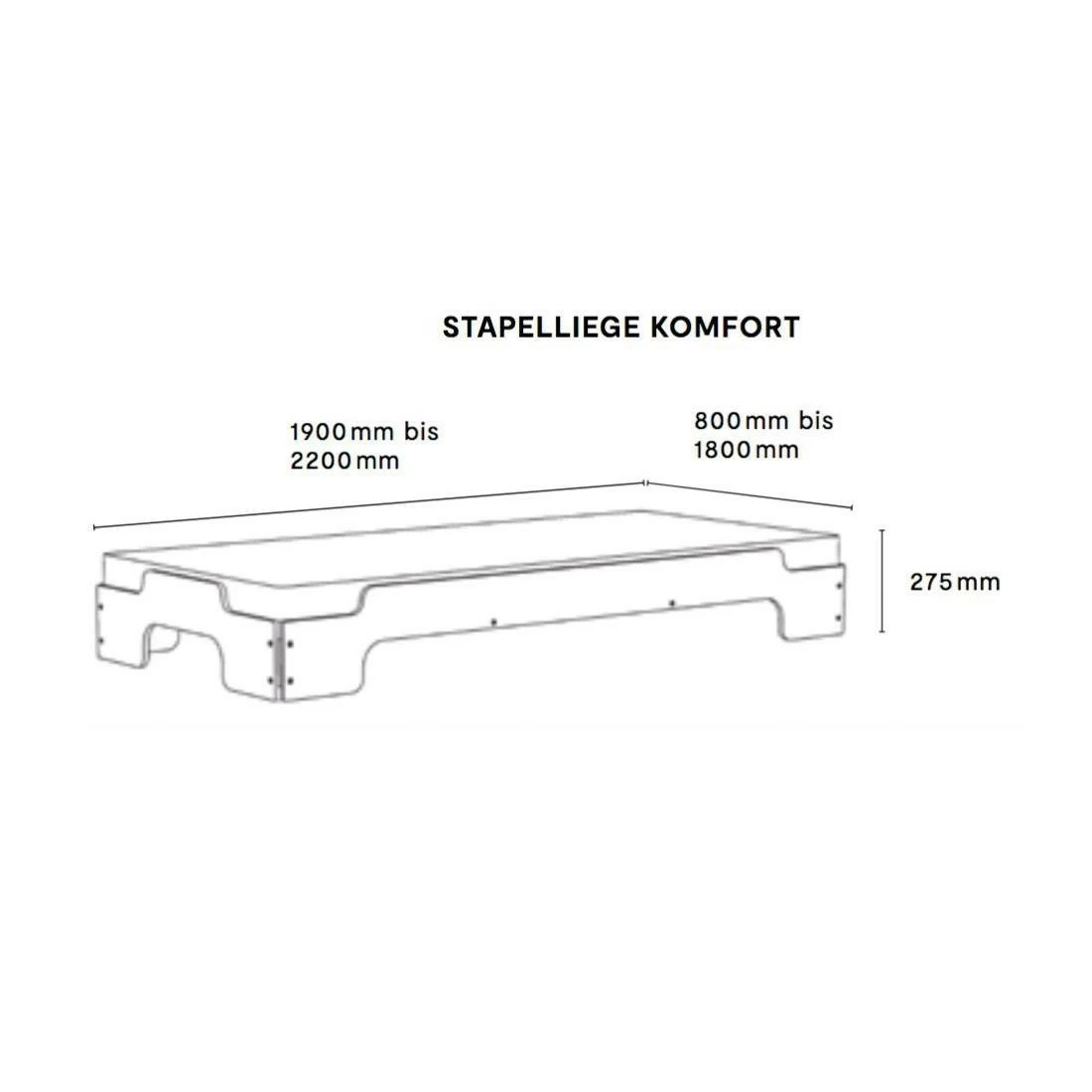 Grundsätzlich basiert die Stapelliege Komfort 90x200cm auf dem Entwurf aus den 1960er Jahren. Der Unterschied liegt in der Höhe: Die Komfortvariante ist um 4 cm höher als die Klassikausführung. Der Rahmen misst an der Außenkante 930 mm in der Breite und 2030 mm in der Länge. Für die Stapelliege Komfort 90x200cm wird stabiles, 9-fach verleimtes Schichtholz verwendet, das eine Stärke von 15 mm aufweist. Sie lässt sich perfekt mit handelsüblichen Lattenrosten und Matratzen mit einer Länge von 200 cm und einer Breite von 90 cm kombinieren.