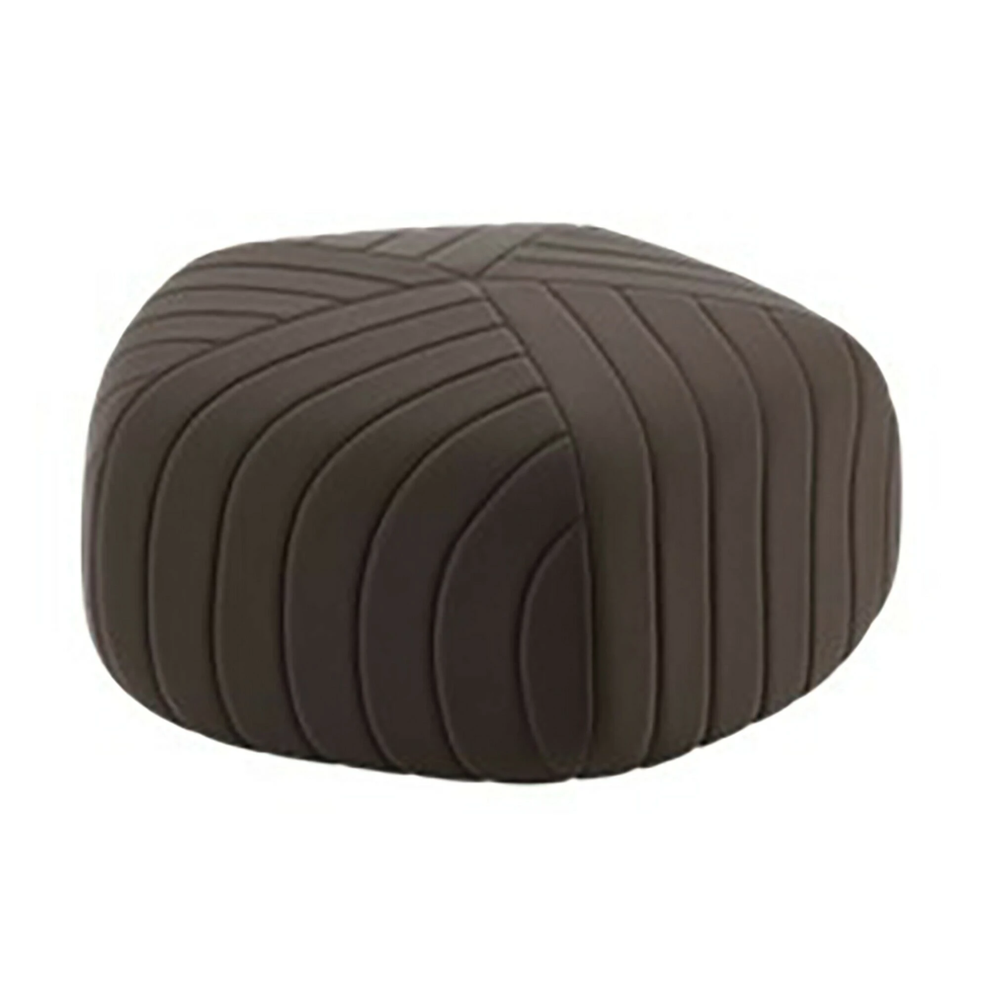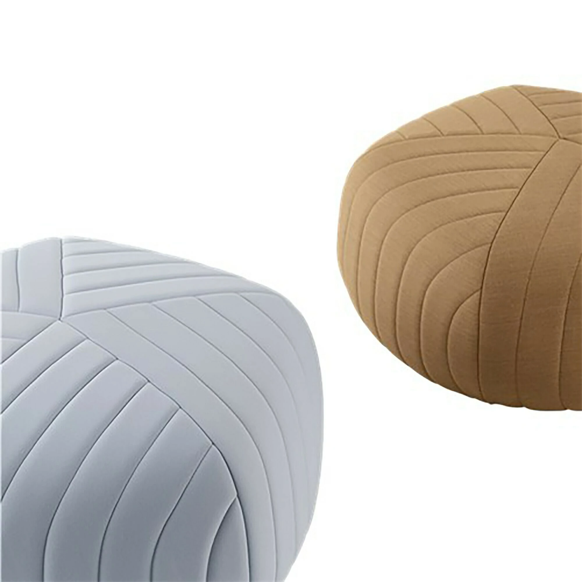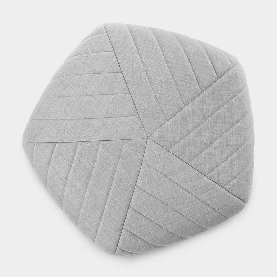 Der fünfeckige Five Pouf wirkt sowohl von der Seite als auch von oben betrachtet als reaktives Element eines Ganzen, das der Raum darstellt. Die auf jeder Seite angeordneten, quer zueinander verlaufenden monochromen Stoffbahnen des Bezugs wirken auf den ersten Blick skandinavisch schlicht und erwecken Bilder von gepflügten Feldern vor dem geistigen Auge. Bei genauerem Hinsehen entpuppt sich die Stoffstruktur mit der graphischen Positionierung der gleichartigen Elemente als eine nahezu organische Kombination, die in jedem Schlaf-, Wohn- oder Arbeitszimmer eine legere und zugleich elegante Sitzmöglichkeit bietet.