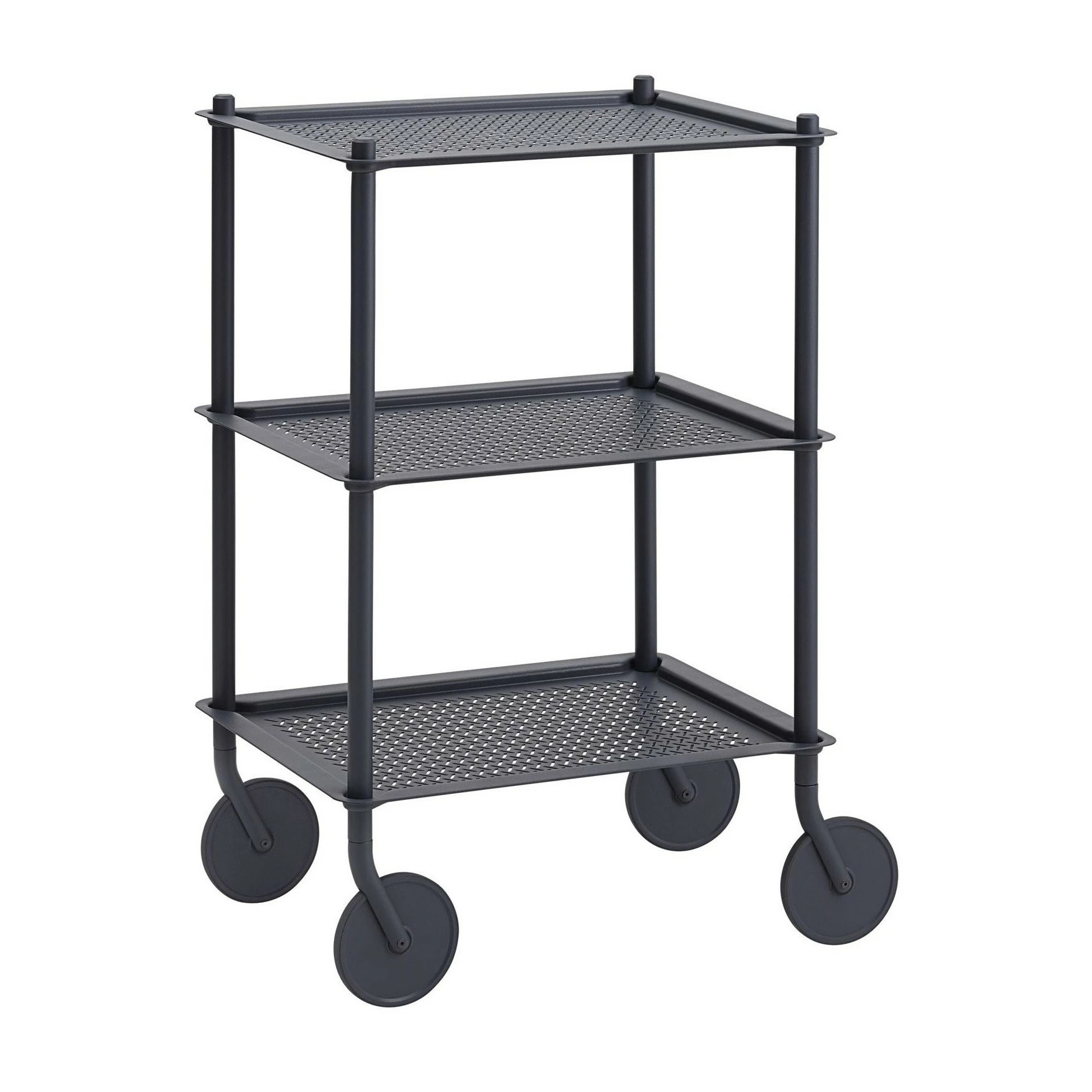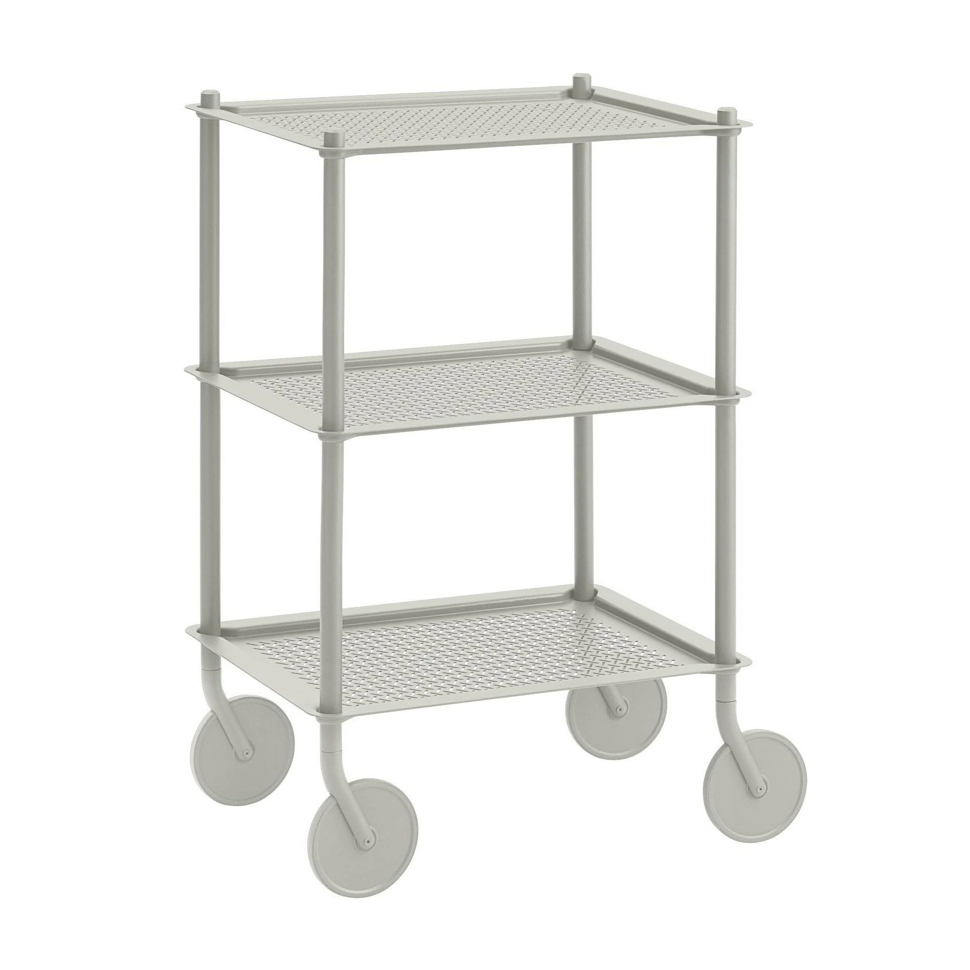 Dank der großen und robusten vier Rollen geht es mit dem Flow Servierwagen 57,4×88,3×41,8cm ganz bequem von der Küche in das Wohn- oder Esszimmer. Doch der Wagen wird nicht nur als Ablagefläche für Speisen und Getränke verwendet. Vielmehr eignet er sich auch für das Büro oder das Homeoffice. Praktisch ist er außerdem als zusätzlicher Arbeitsplatz in der Küche. Geometrische Formen prägen das Design vom Flow Servierwagen 57,4×88,3×41,8cm : Von den vier mit Gummi beschichteten Rädern führen runde Stangen senkrecht nach oben. Drei Tabletts mit einer geriffelten Oberfläche bieten viel Ablagefläche. Bis zu 50 kg halten sie aus.