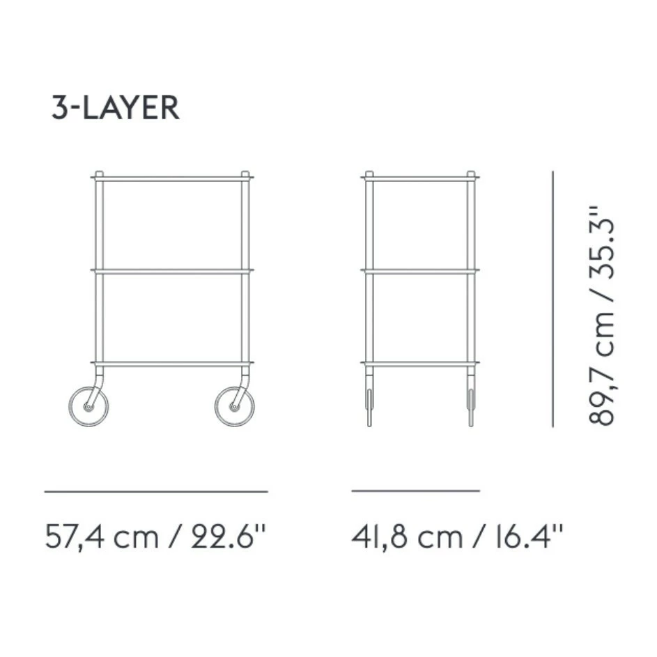 Für den Flow Servierwagen 57,4×88,3×41,8cm verwenden die Designer pulverbeschichteten Stahl. Er hat sich als pflegeleichtes Material bewährt und lässt sich einfach mit einem feuchten Tuch abwischen. Der Servierwagen ist 88,3 cm hoch, die Ablageflächen sind 41,8 cm tief und 57,8 cm breit. Das zeitlos elegante Design lässt sich mit jedem Einrichtungsstil kombinieren.