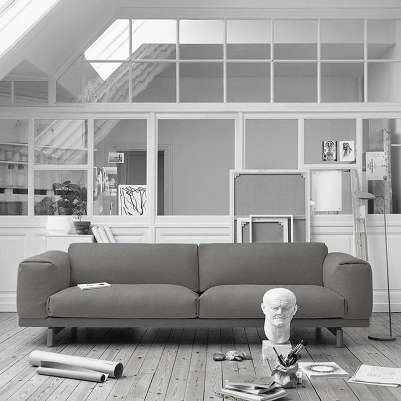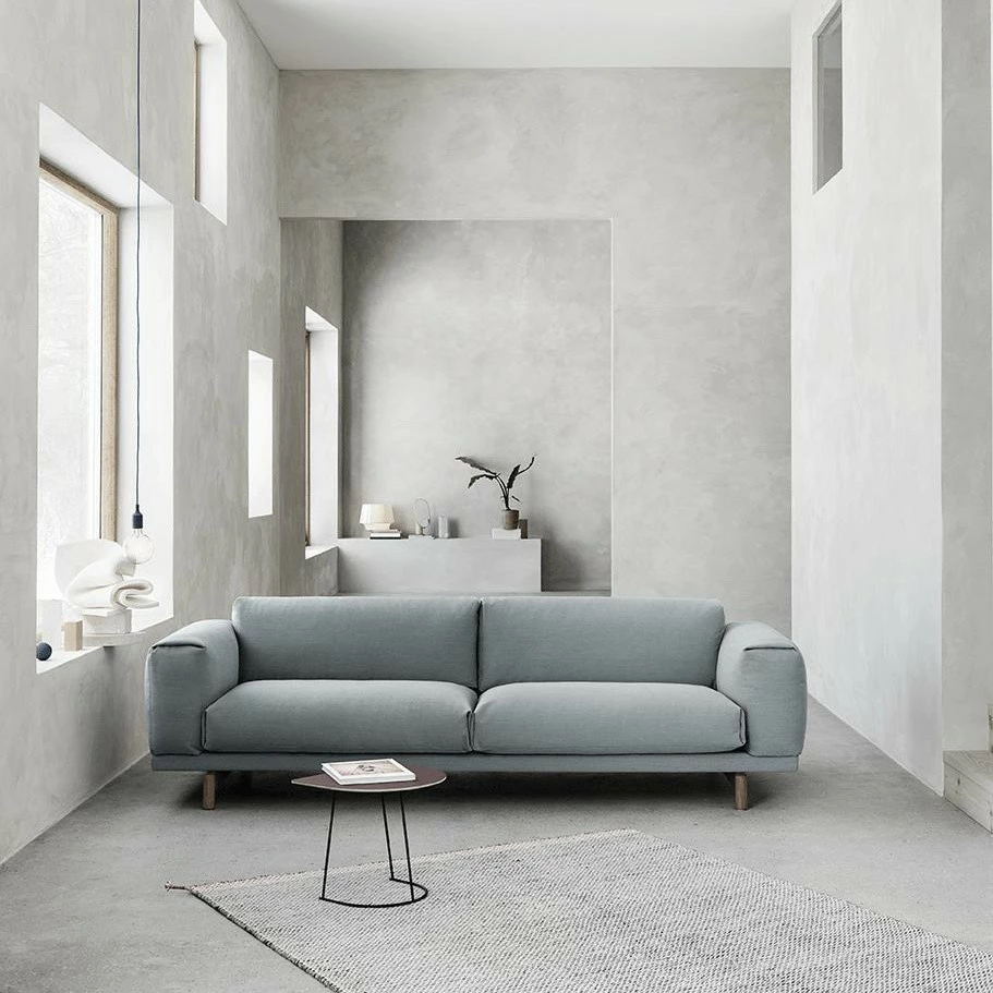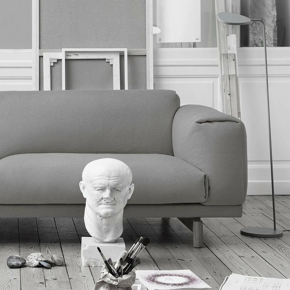 Die robusten Polster aus Kaltschaum und Daunenfüllung laden zum Hineinfallen und Entspannen ein. Der Bezug des Rest Sofas von Muuto besitzt einen Reißverschluss und ist abziehbar. Nach einiger Zeit kann er so bequem in der Waschmaschine gereinigt werden.