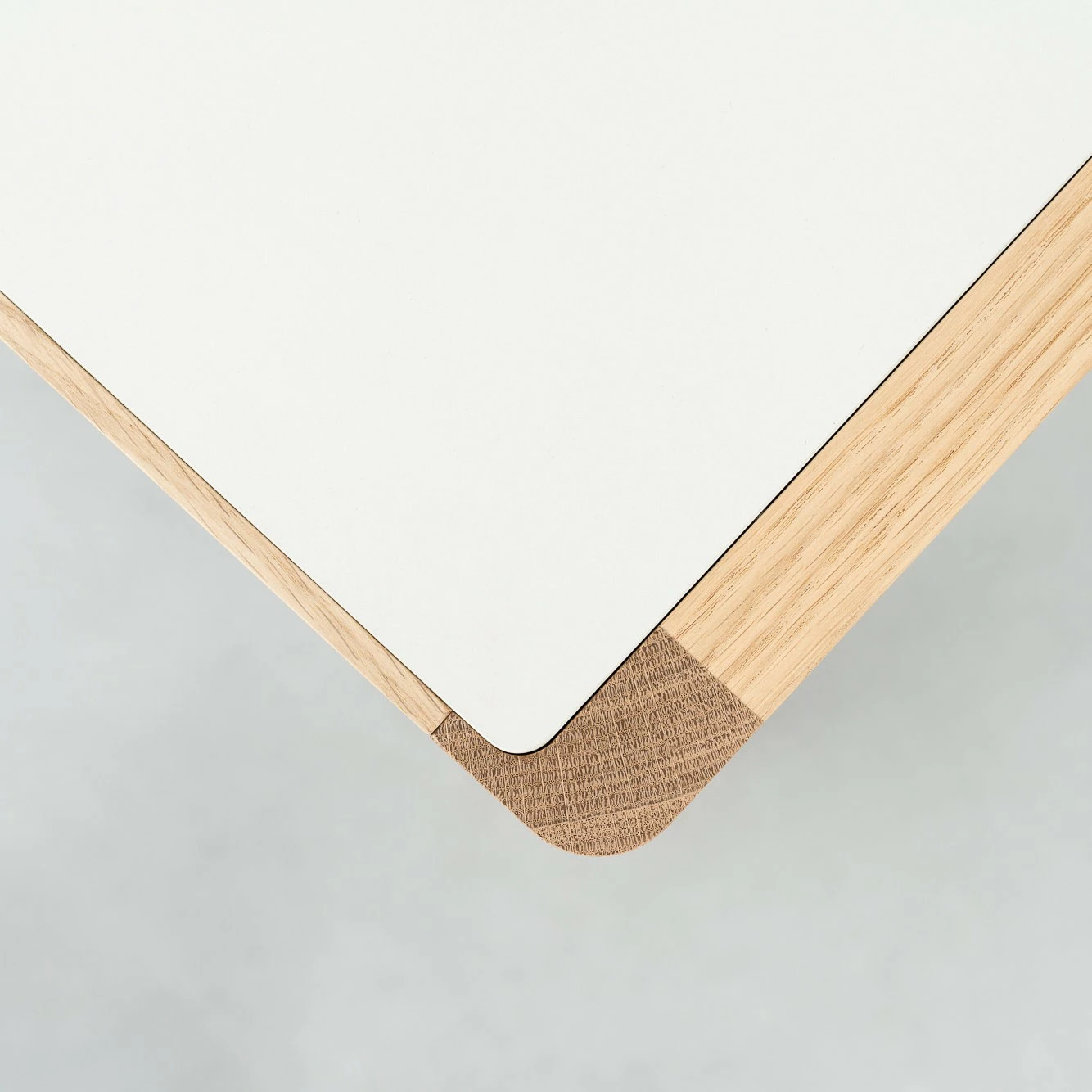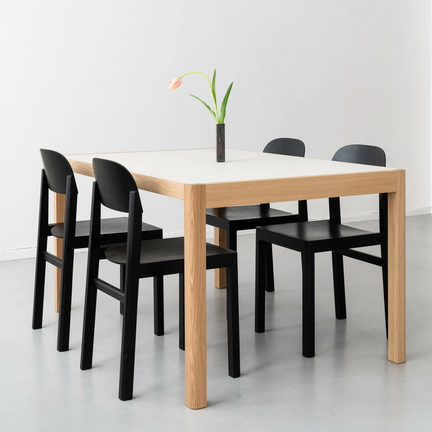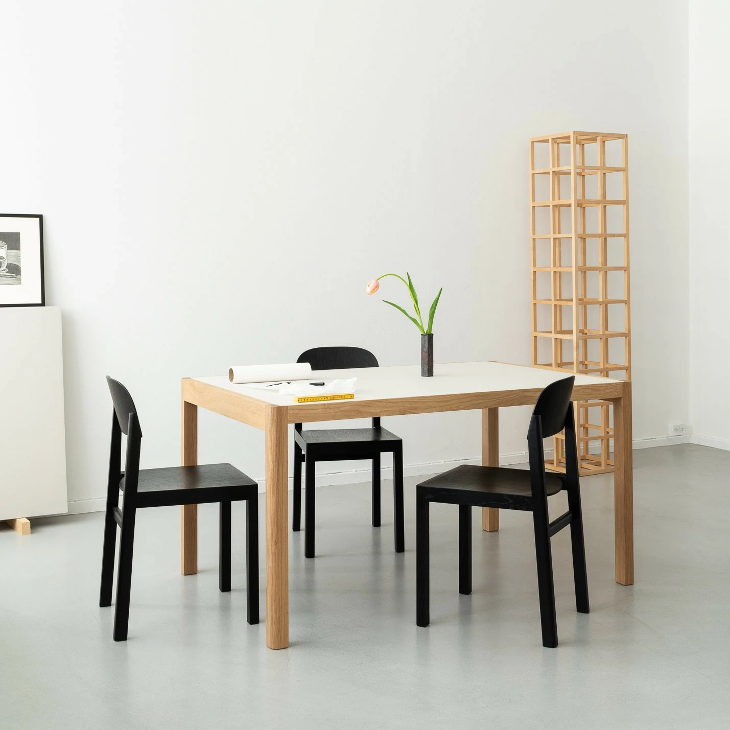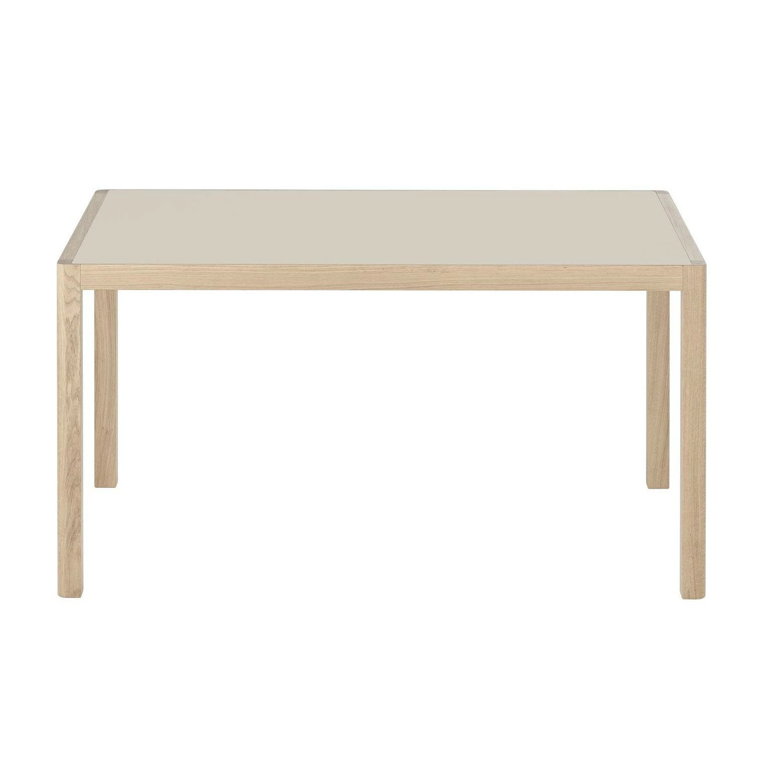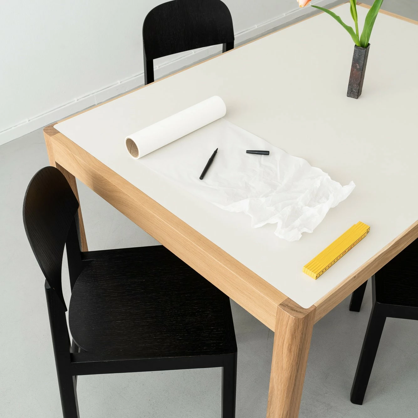 Die erfolgreiche Jungdesignerin Cecilie Manz kombiniert für den Workshop Tisch L 140cm das traditionelle Handwerk mit subtilen Details, die eine einfache und gleichzeitig expressive Optik kreieren. In dem 140cm langen Möbelstück wird die Essenz der Idee eines Tisches klar ersichtlich. Zurückhaltend in dem Gesamteindruck, dafür aber umso lauter in den Details und Verbindungen, ist dieser Esszimmertisch das perfekte Objekt für echte Kenner der skandinavischen Lebensart. Der aus massiver Eiche und Eichenfurnier gefertigte Workshop Tisch L 140cmist 92cm breit und 73cm hoch. Die Tischfläche ist mit einem hellen Linoleum überzogen, das sich im täglichen Einsatz als besonders pflegeleicht erweist. Elegante Details wie die gekonnt ineinandergreifenden Beinverbindungen machen aus dem Tisch den Mittelpunkt des Raumes. Mit klassischen Stühlen bleibt der Tisch im Fokus, während extravagante Sitzmöbel ihn als klare Bühne nutzen können.