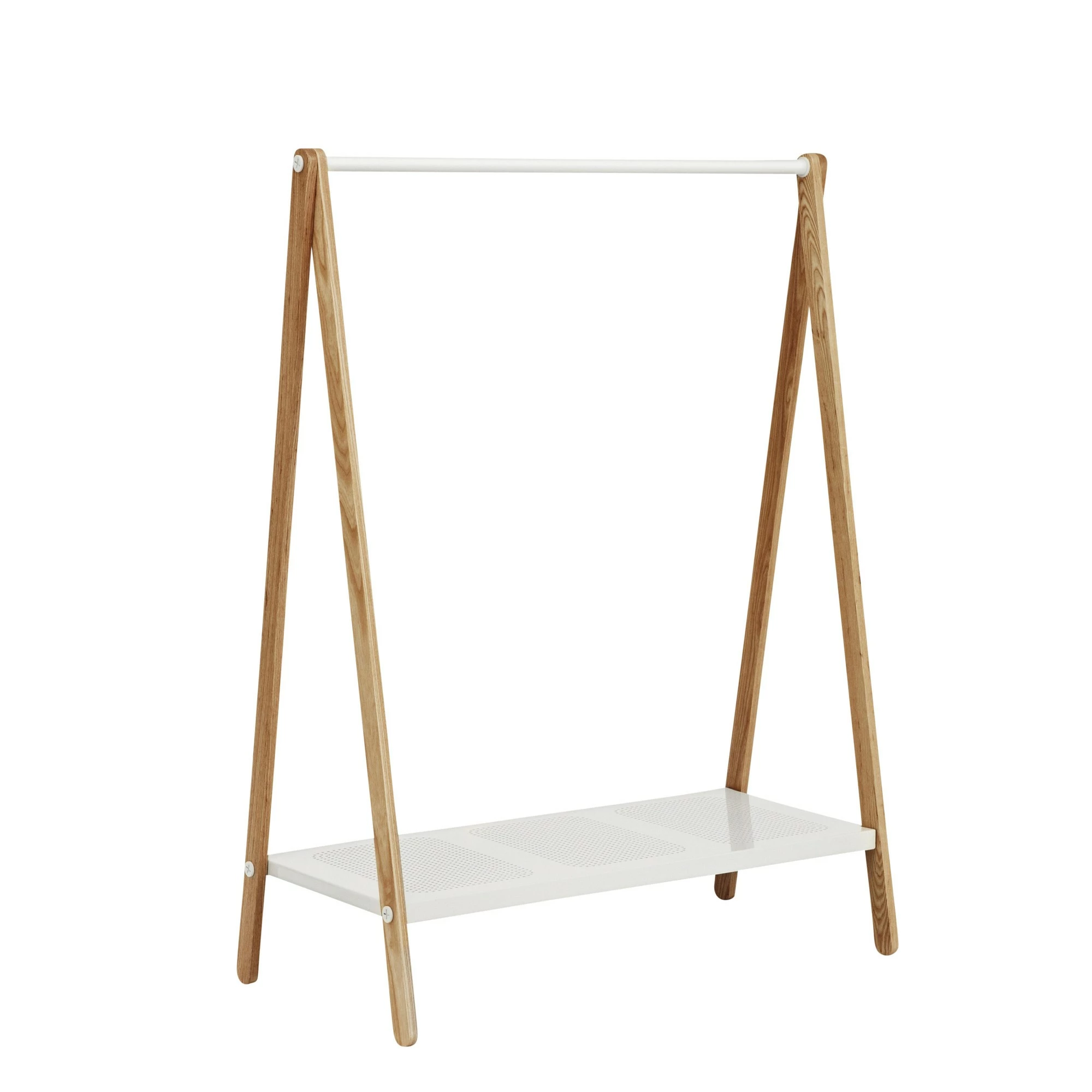 Für das Gestell wird hochwertige Esche verarbeitet. Das massive Holz besitzt stabile, robuste Eigenschaften. Besonders reizvoll wirkt die lebhafte Maserung, die die Natürlichkeit des Werkstoffs unterstreicht. Damit zieht auch ein Stück Behaglichkeit in den Raum ein. Als deutliches Kontrastelement zeigt sich der verwendete Stahl. Er kommt für die Kleiderstange sowie die untere Ablage zum Einsatz. Seine Oberflächen erhalten eine sorgfältige Pulverbeschichtung. Sie haben die Wahl zwischen einer weißen und einer schwarzen Veredelung.