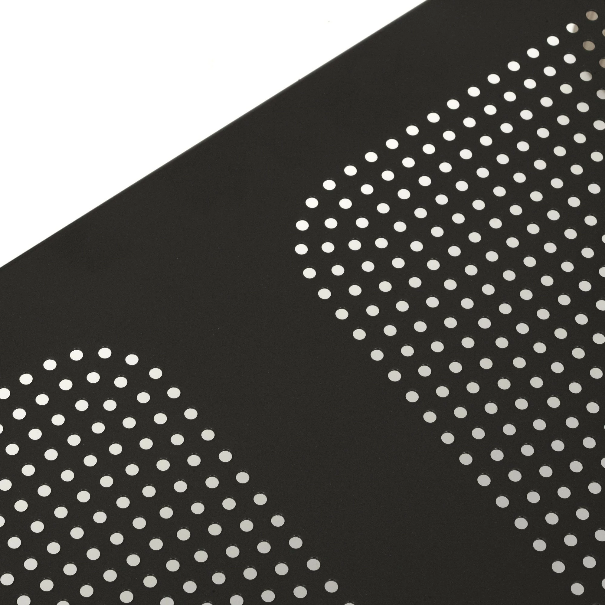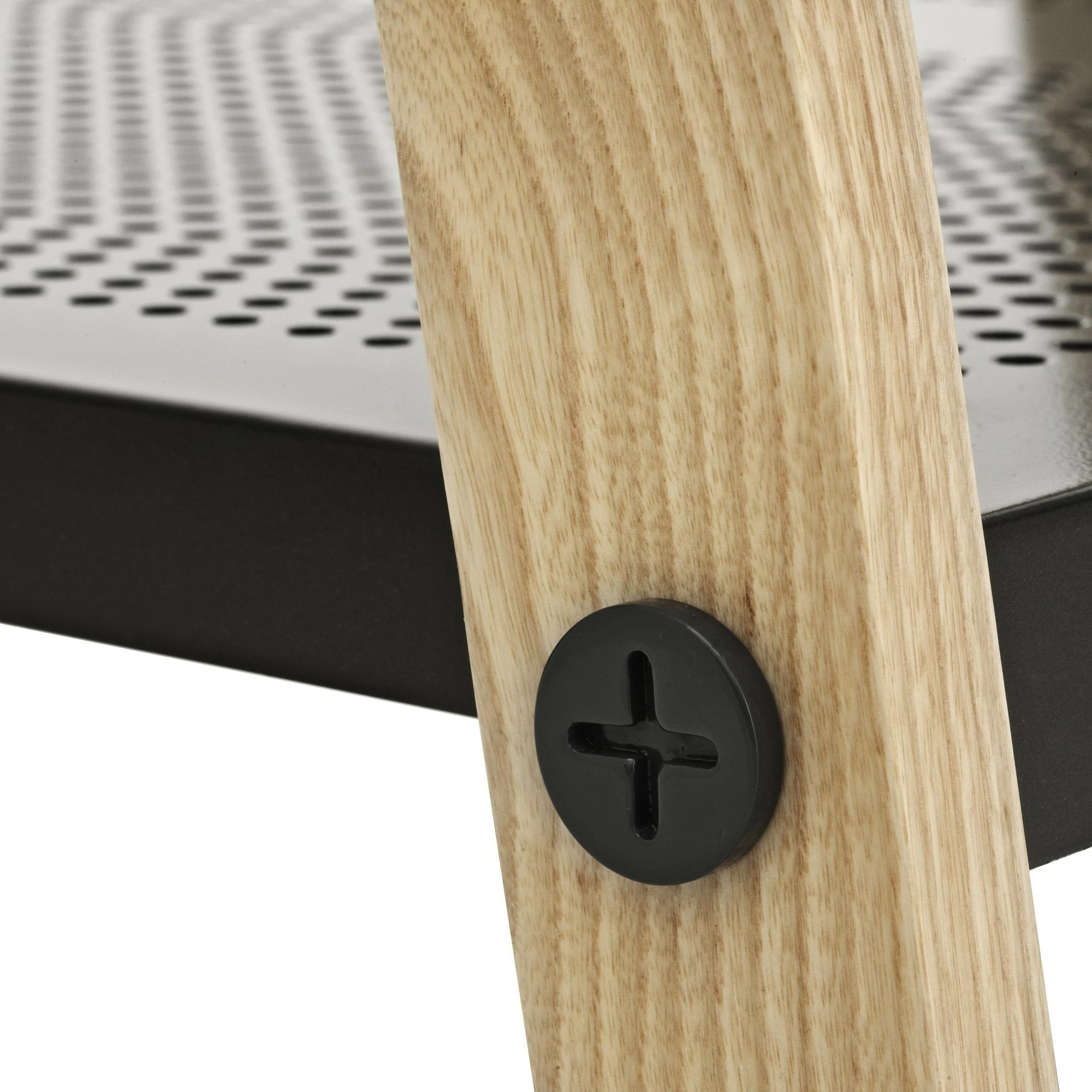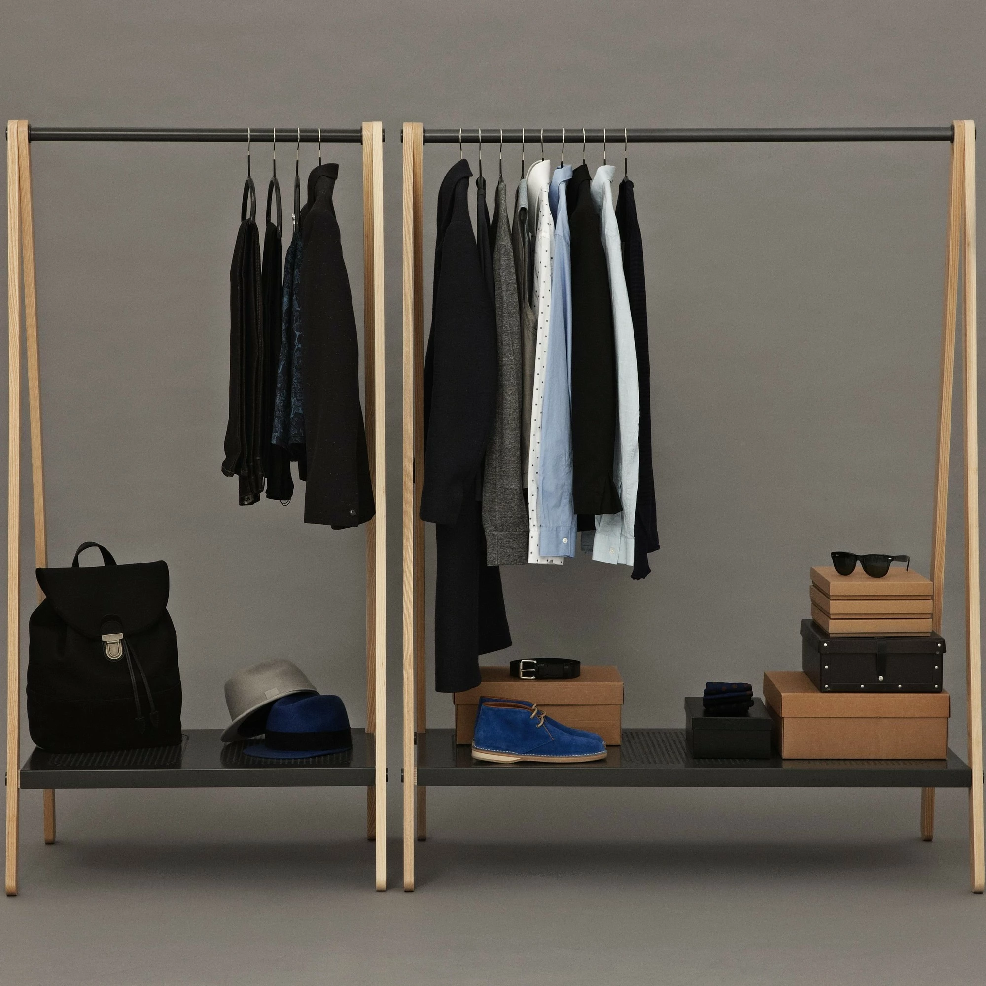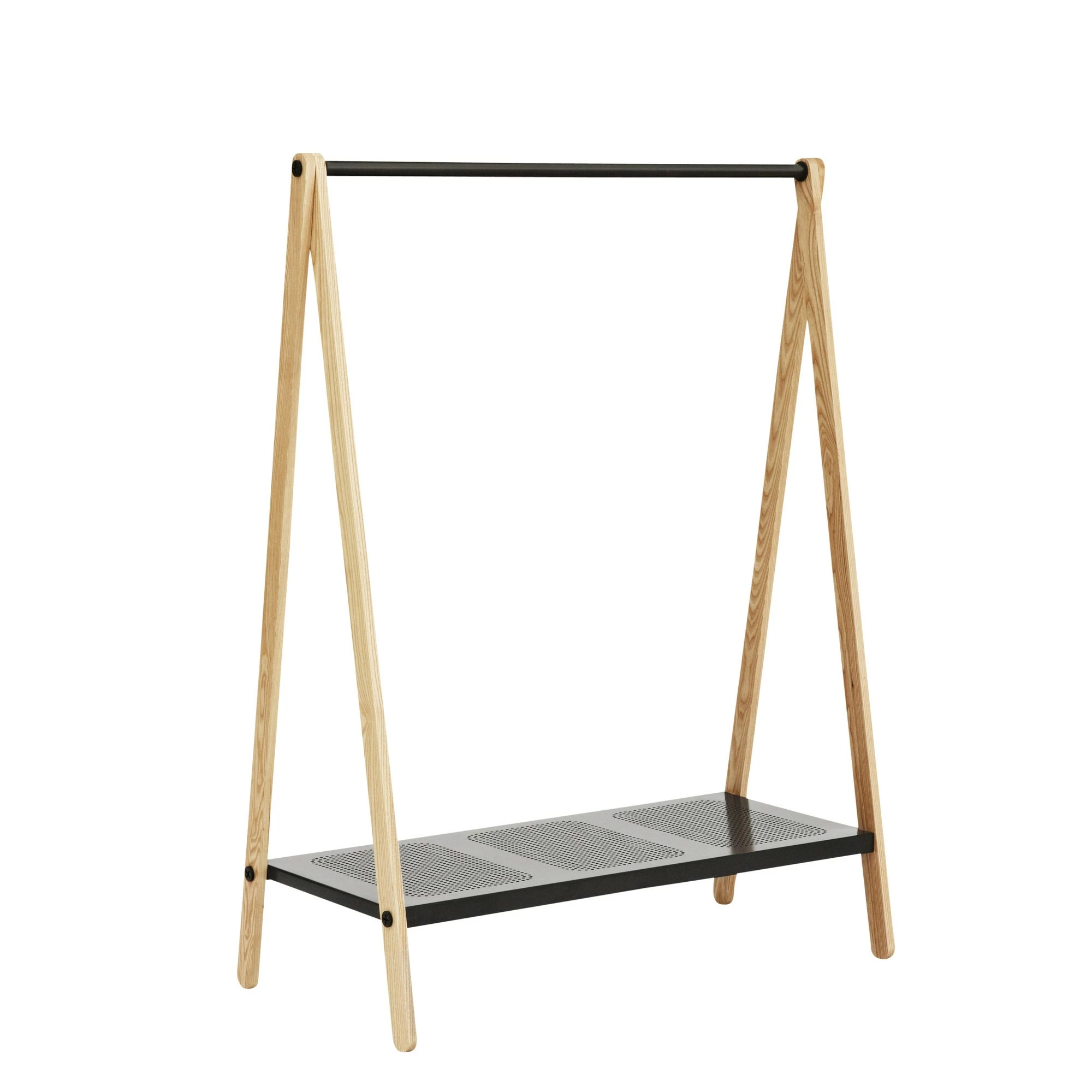 Insgesamt misst der Toj Kleiderständer 160 x 120 x 59,5 cm. Seine moderne Gestaltung lässt eine Nutzung im Schlafbereich, aber auch in einem Flur zu. An der Kleiderstange finden mithilfe von Bügeln Textilien sowie Taschen und andere Accessoires einen geeigneten Platz. Die großzügige Fläche aus gelochtem Stahlblech bietet sich zur Ablage verschiedener Schuhe an. Auf ihr können Sie ebenso entsprechende Boxen abstellen, in denen Sie Kleinigkeiten verstauen. Zur Ergänzung gibt es den Kleiderständer zusätzlich in einer kleineren Variante.