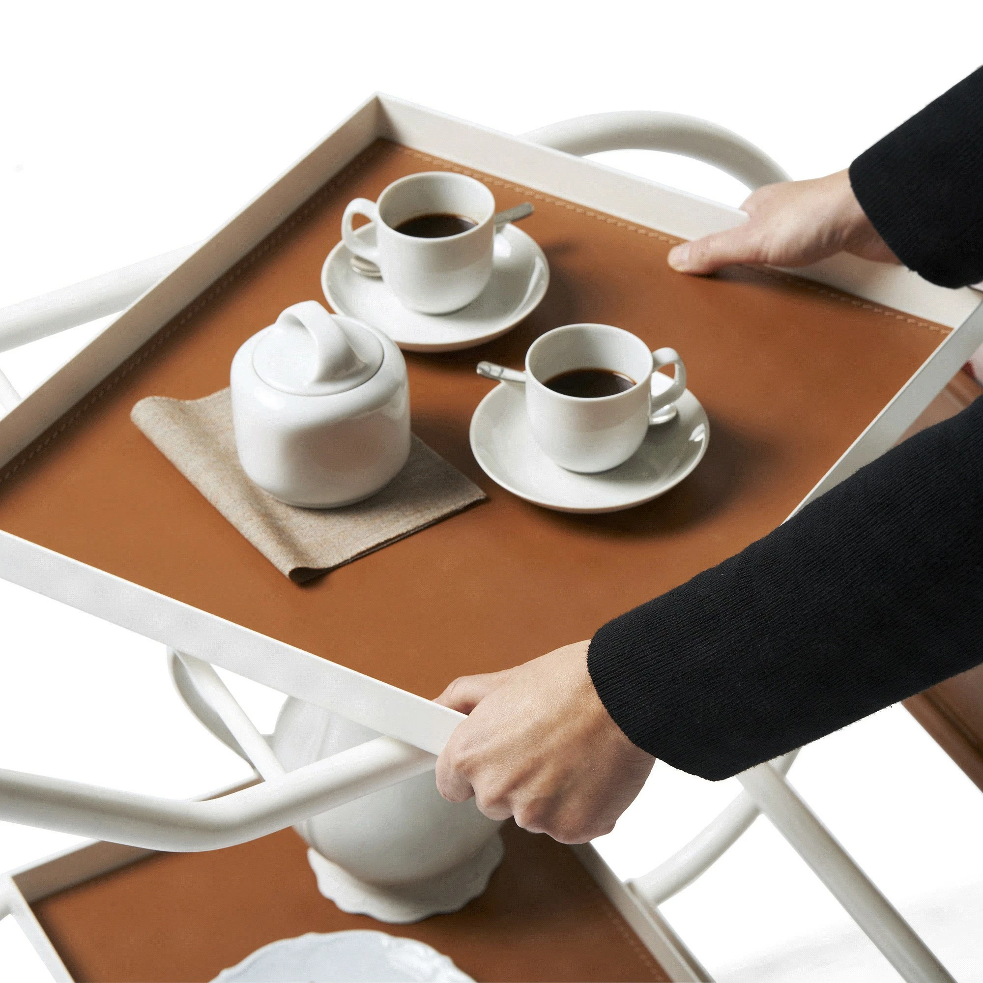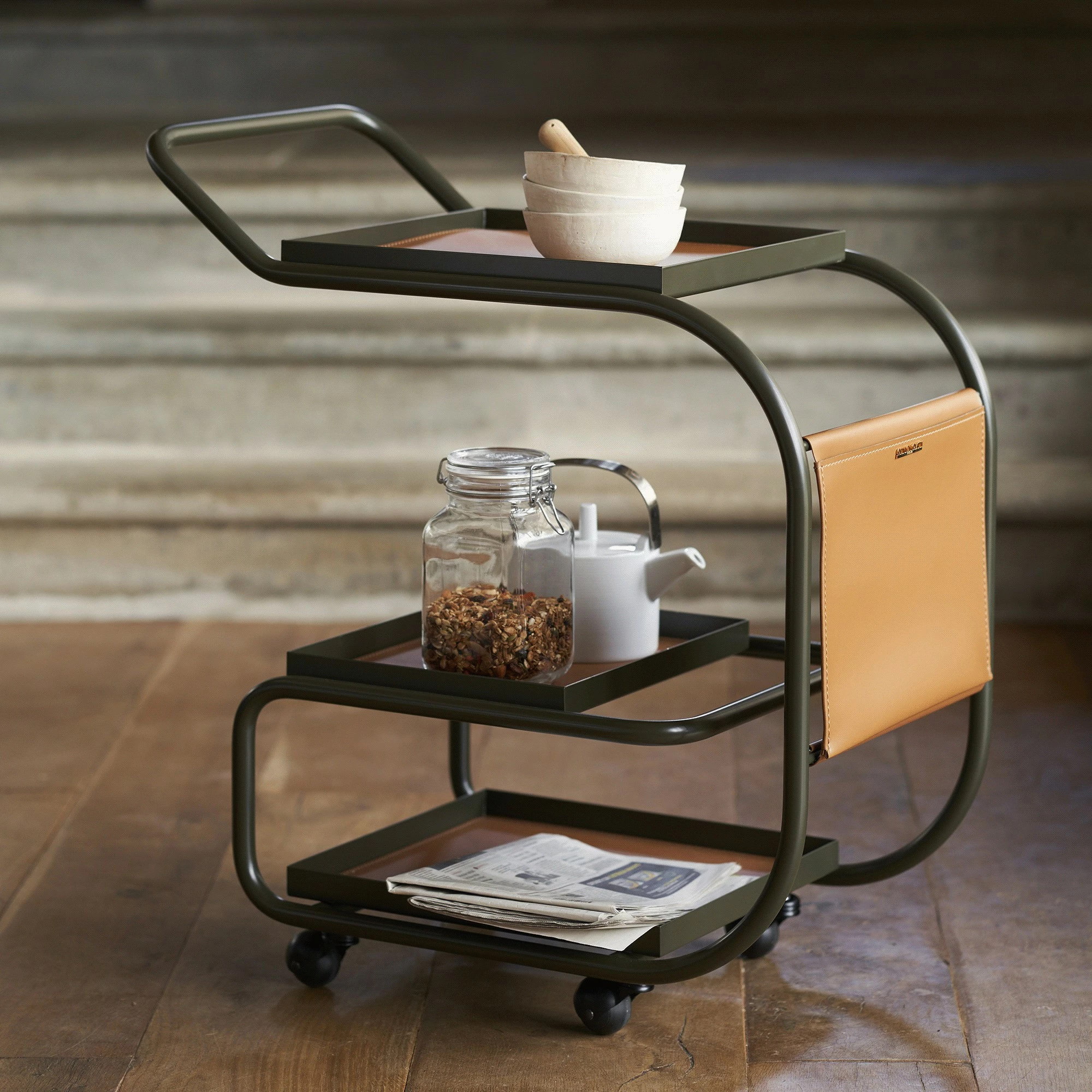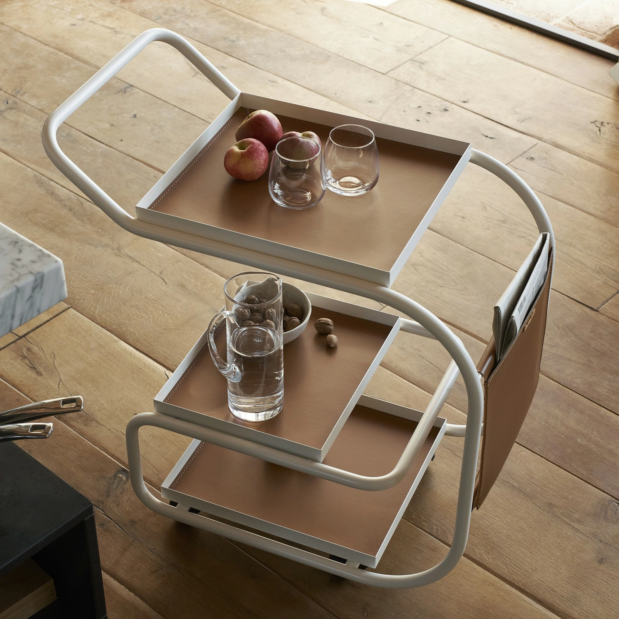 Der praktische Zenzero Servierwagen verläuft über drei Etagen, die durch ein harmonisch gebogenes Stahlrohrgestell entstehen. Auf jeder Etage befindet sich ein Tablett, das ebenfalls aus Stahl gefertigt ist. Zwei der Tabletts sind abnehmbar. So können sie zum Servieren oder als zusätzliches Dekorationsobjekt verwendet werden. Die Tabletts sind mit weichem Leder ausgekleidet. Aus dem gleichen Leder besteht die praktische Tasche, die an der Seite des Servierwagens zwischen den Stahlrohren angebracht ist. Hier können Zeitungen oder Bücher ideal verstaut werden. Auf dem Zenzero Servierwagen können Getränke, Speisen und andere Utensilien transportiert werden. Die vier schwenkbaren Lenkrollen an der Unterseite des Gestells lassen sich harmonisch über den Boden bewegen. Zur einfachen Handhabung trägt auch der handliche Griff bei.
