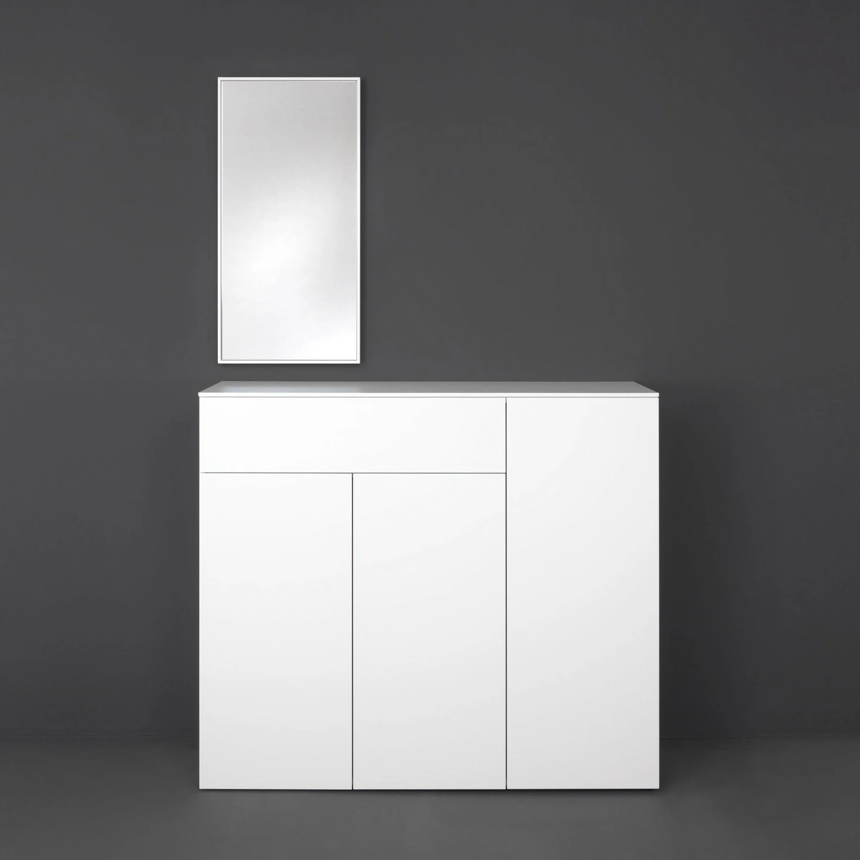 Das solide verarbeitete Möbelstück ist schneeweiß lackiert, die Füße sind pulverbeschichtet. Es ist 1,04 m hoch und misst in der Breite 1,20 m. Mit einer Tiefe von 39,1 cm stellt es reichlich Stauraum zur Verfügung. Zusätzliche Lochblech-Schuhböden können als Zubehör gewählt werden, genauso wie Fachböden unterschiedlicher Längen. Damit kann man die Kommode ganz nach seinen eigenen Wünschen individualisieren. Außerdem gibt es für die Urban 1074 Kommode mit Schuhablage auch ein Untergestell, das die Kommode auf Füße stellt und sie um ganze 12 cm wachsen lässt. Wer statt des Schubkastens lieber drei gleich große Türen möchte, entscheidet sich für die Version Urban 1073. Alle Teile der Kommode werden in Bad Königshofen in Bayern produziert, so wie beinahe das komplette Sortiment des deutschen Herstellers. Die Urban-Serie umfasst neben den praktischen Bodenkommoden auch eine schicke Truhe, einen dekorativen Wandspiegel und eine Wandkommode.