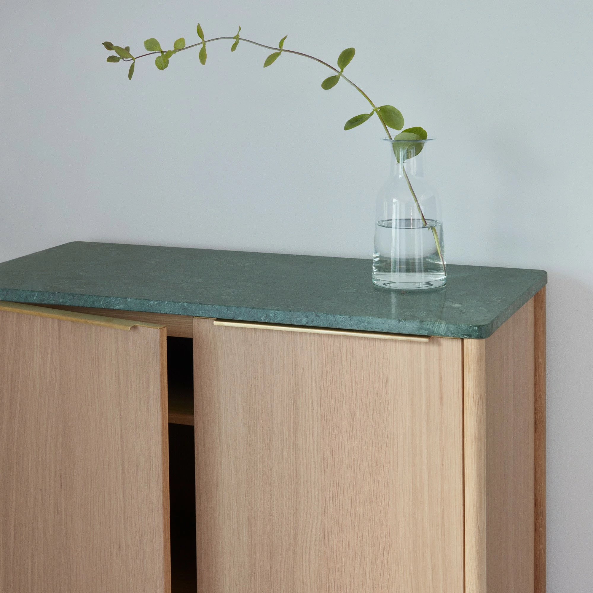 Gefertigt ist die Jut Kommode 86,5×39,5x114cm aus edlem Eichenholz. Es trägt das FSC-Siegel, was für nachhaltige Forstwirtschaft steht. Erhältlich ist die Kommode in zwei Varianten: Es gibt sie mit einer obigen Platte aus Eichenholz oder aus Marmor. Beide Naturmaterialien verbreiten wohnliches Flair in jedem Raum. Die beiden Türen der Jut Kommode 86,5×39,5x114cm sind mit schlichten Messinggriffen zu öffnen. Sie sind knapp unter der Tischplatte montiert. Drei Regalbretter sorgen im Inneren der Kommode für Ordnung. Somit wird das elegante Modell zum perfekten Aufbewahrungsort für den Wohnraum oder das Büro. Die Kommode harmoniert sowohl mit moderner als auch mit klassischer Einrichtung. Im selben Stil sind auch breitere und höhere Kommoden erhältlich.