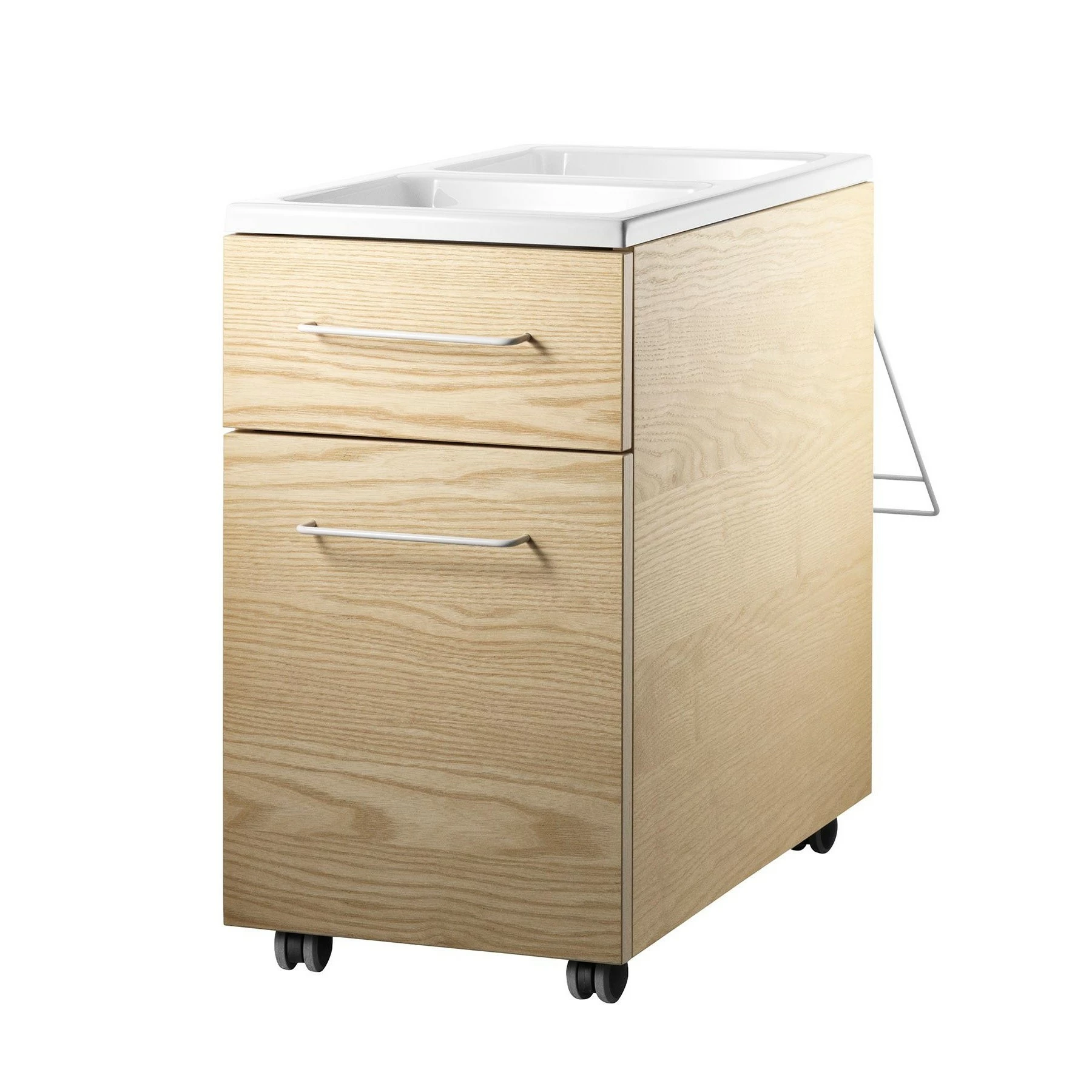 Beim String Works Schubladenelement handelt es sich um ein kleines Kästchen auf Rollen, das aus zwei unterschiedlich großen Schubladen besteht. Im unteren Fach können auch Ordner abgestellt werden, das obere und kleinere Fach eignet sich hervorragend für kleine Gegenstände. Auf dem Dach des Schränkchens befindet sich eine separate Ablage mit hohem Rand. Diese Ablage wurde in zwei Fächer unterteilt. Das naturbelassene Holz mit seiner Maserung passt perfekt zur weißen Dachablage, den weißen Griffen und den schwarzen Rollen. Sie können das String Works Schubladenelement in diversen Farben erhalten, darunter zwei Holzfarben und komplett in Weiß. Als Material wurden Holz und Metall verwendet. Das Aufregende an diesem Kästchen ist der an der Rückwand angebrachte große Griff, mit dem sich das Kästchen wie ein Trolley ziehen lässt. Die Abmessungen betragen: Breite 30 cm, Höhe 51 cm und Tiefe 58 cm.