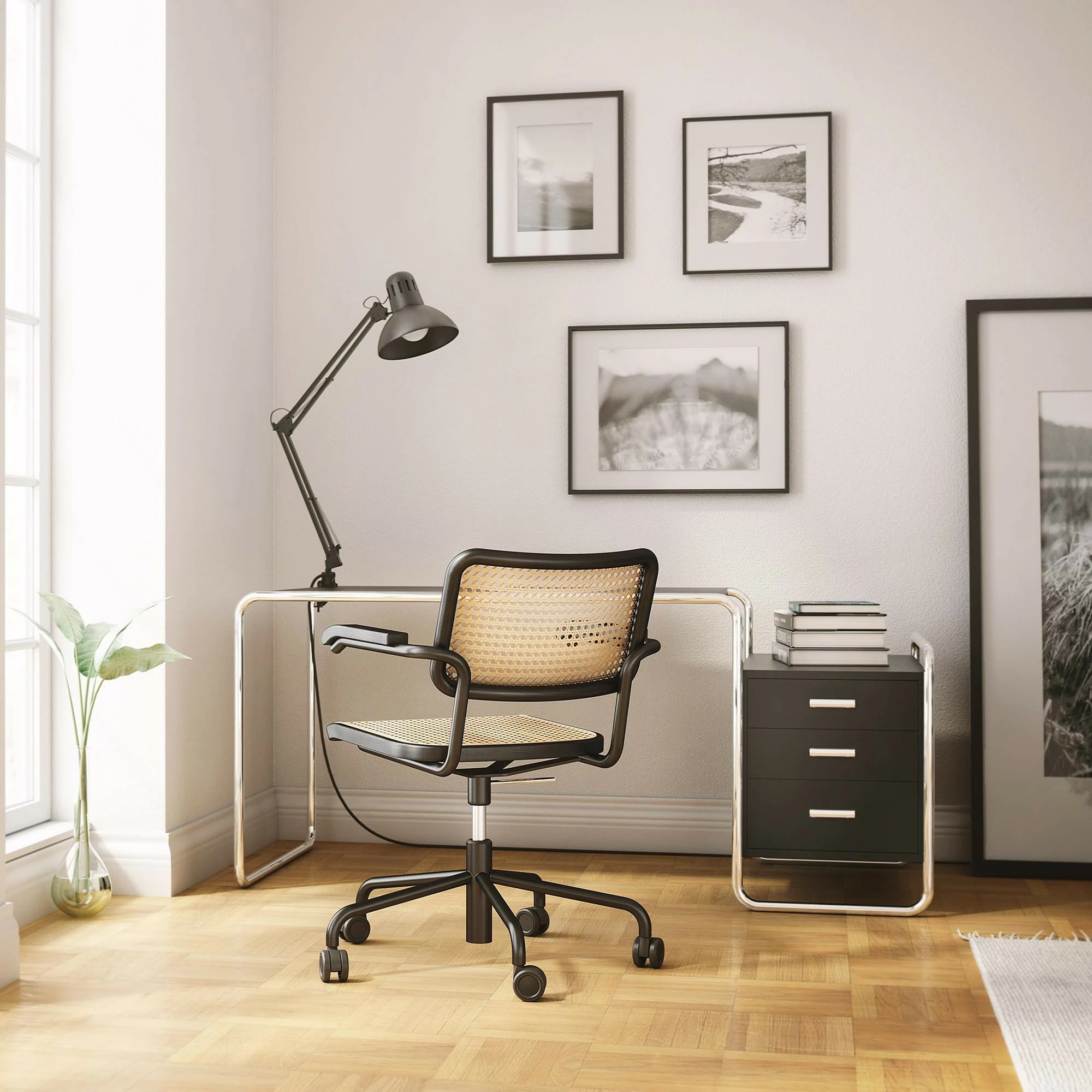 Mit den Maßen von 68 x 68 cm und einer Höhe von 77 cm passt der S 64 VDR Drehstuhl mit Rohrgeflecht in den klassischen Arbeitsbereich zu Hause wie auch ins moderne Büro. Er ist ein wunderbar vielseitiger Begleiter in jedem Raum. Deutlich an den Stil des Bauhaus erinnernd, den Marcel Breuer mit geprägt hat, fügt sich der Stuhl harmonisch in seine Umgebung ein. Hervorragend passt er zu minimalistischem Interieur mit einfacher Farbgebung und klaren Linien.