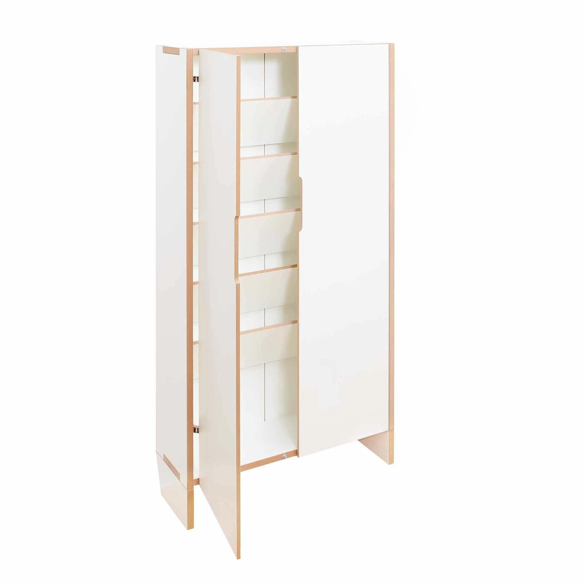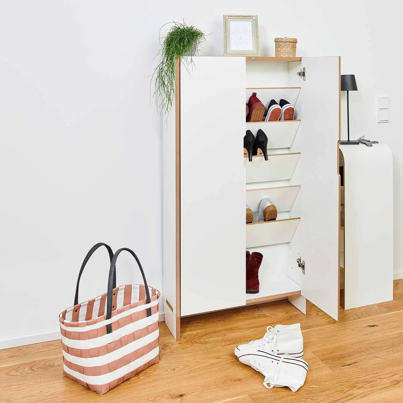 Mit seinen schlanken Maßen von gerade einmal 130,8 cm Höhe und 70 cm Breite passt der Flachmann Schrank/Schuhschrank klein auch in die kleinste Wohnung. Trotz seiner Tiefe von nur 23 cm schafft er es, bis zu 15 Paar große Männerschuhe ohne Probleme zu beherbergen. Das Möbelstück ist aus beschichtetem MDF in lakonischem Weiß gefertigt. Eine spannende optische Besonderheiten stellen die Kanten dar, an denen das naturfarbene Holz hervorschaut und die interessante Akzente in bester skandinavischer Tradition setzen.