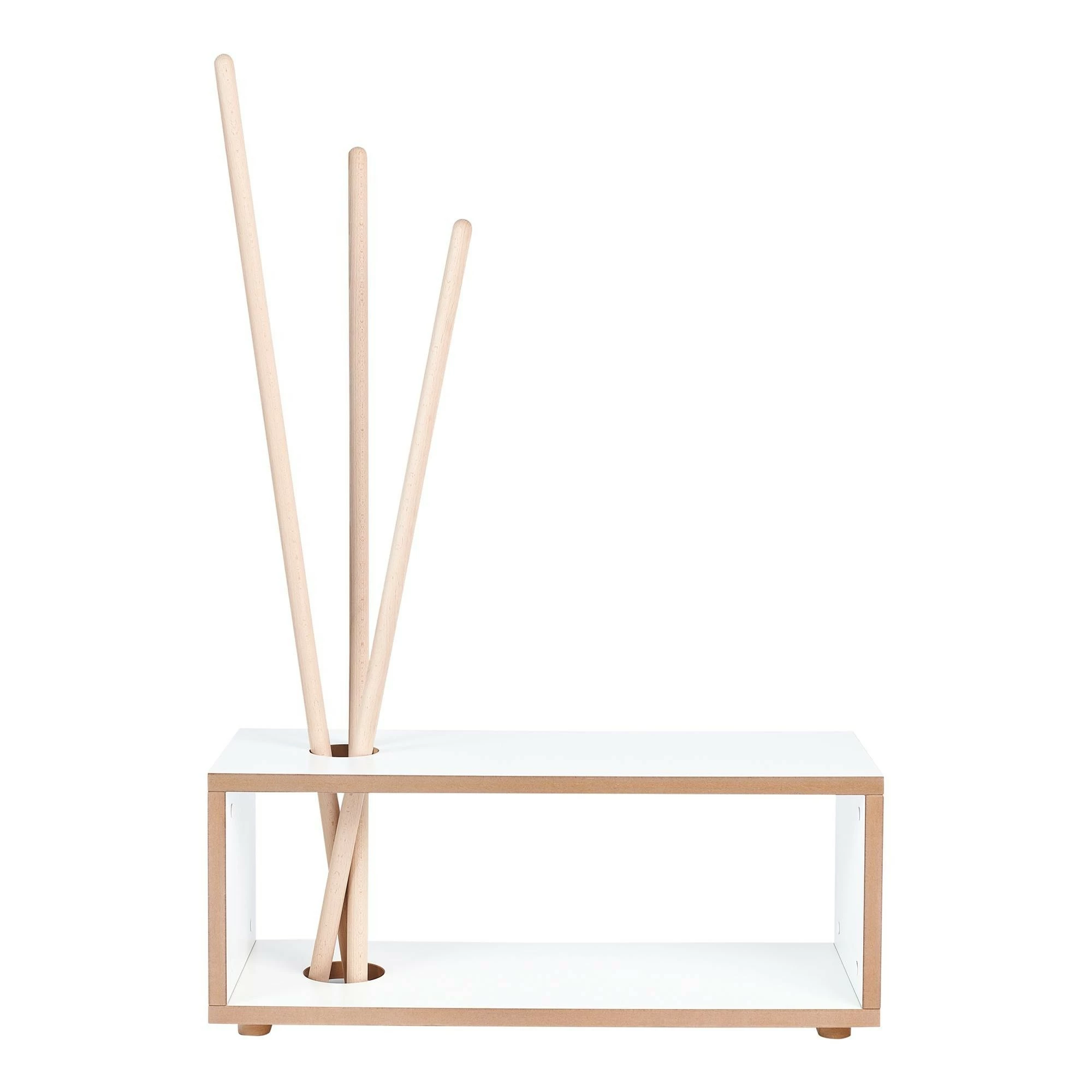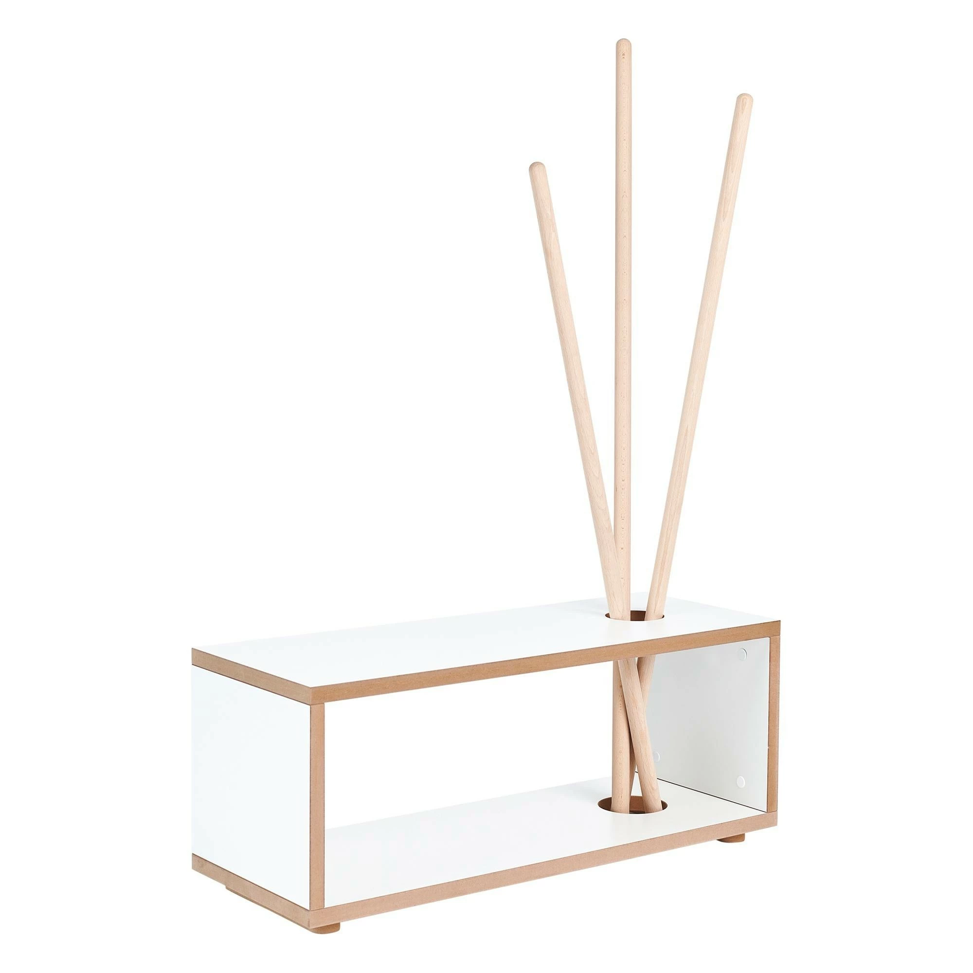 Bei der Ordnung Kindergarderobe handelt es sich um ein multifunktionales Möbelstück, das vielseitig eingesetzt werden kann. Dabei beschränkt sich die Ordnung Kindergarderobe auf ein Minimum: Es besteht im Prinzip aus einem rechteckigen Holzrahmen und kann somit auch als bequemer Hocker oder Sitzbank verwendet werden. Die Ordnung Kindergarderobe dient daher als Sitzgelegenheit und erleichtert kleinen Familienmitgliedern etwa das Schuhanziehen. Nach der Rückkehr nach Hause können die Schuhe ordentlich auf dem unteren Rahmenbrett abgestellt werden. In der Ober- und Unterseite des Gestells ist seitlich eine runde Aussparung vorhanden. Darin stecken drei mitgelieferte runde Stöcke aus Buchenholz in den Längen 100, 110 und 120 cm und je mit einem Durchmesser von 2,5 cm. Sie dienen zum Aufhängen von Jacken, Mänteln und anderen Kleidungsstücken. Die Ordnung Kindergarderobe ist aus weißem MDF gefertigt, das sich als pflegeleicht erweist. An der Unterseite sind niedrige Standfüße montiert.