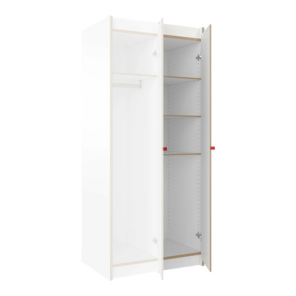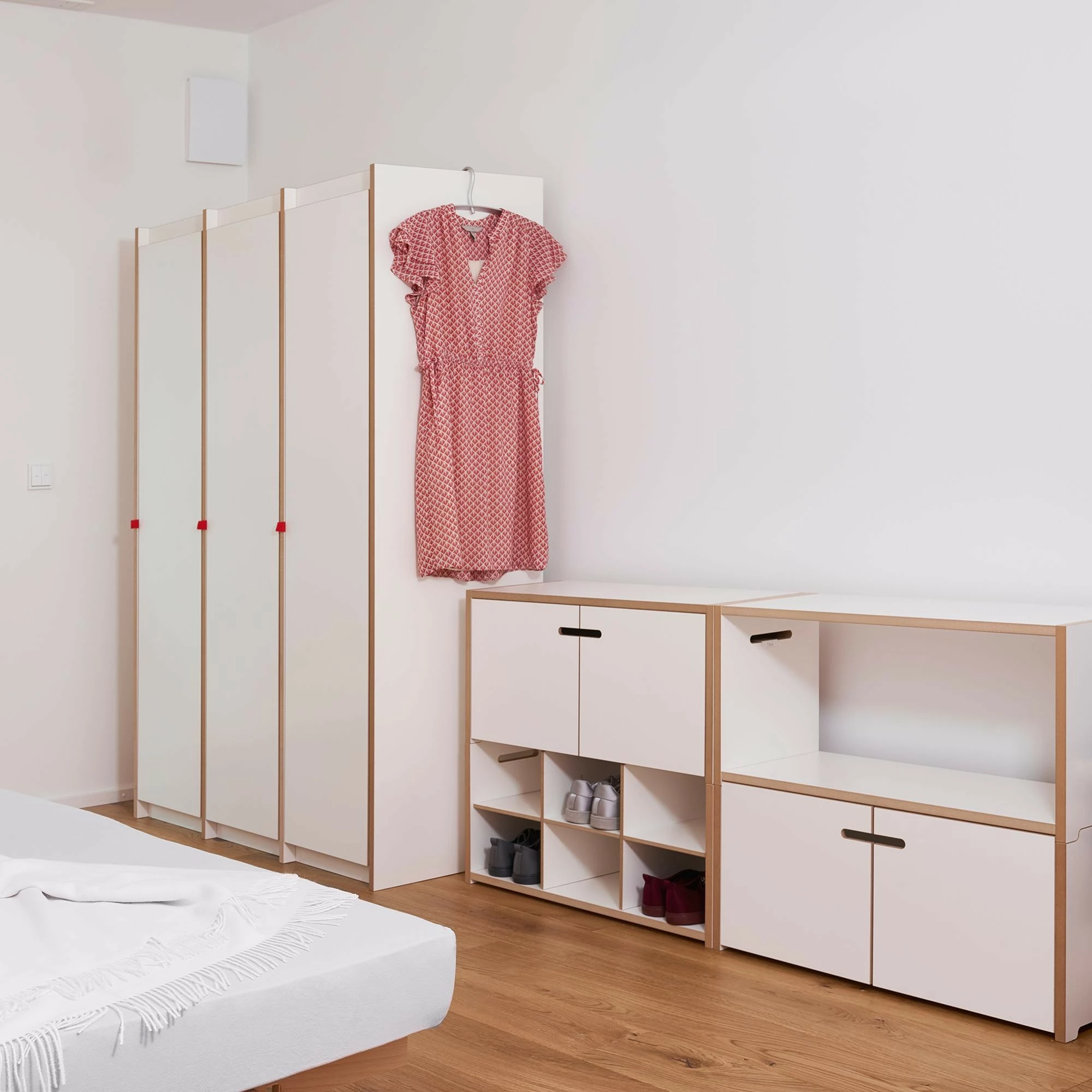 Das Designerstudio Eigenwert wurde mit dem Steh Schrank Anbaumodul als Erweiterung des Grundmoduls einmal mehr seinem Anspruch gerecht, funktionelle und gleichzeitig stilvolle Möbel zu entwerfen. Der kompakte Spind-ähnliche Schrank mit intelligenter Einrichtung schafft weiteren Stauraum in jedem Schlaf- oder Kinderzimmer oder im Flur. Auf den vier Einlageböden hinter der Tür können Pullover, Unterwäsche und viele andere Kleidungsstücke abgelegt werden oder auf der mitgelieferten Kleiderstange gehängt werden. Durch die kluge Erweiterungsmöglichkeit wächst der Schrank mit größerem Platzangebot oder bei Zuwachs der Familie einfach mit. Hergestellt wird das Steh Schrank Anbaumodul aus beständigem und unempfindlichem MDF, einer mitteldichten Holzfaserplatte.
