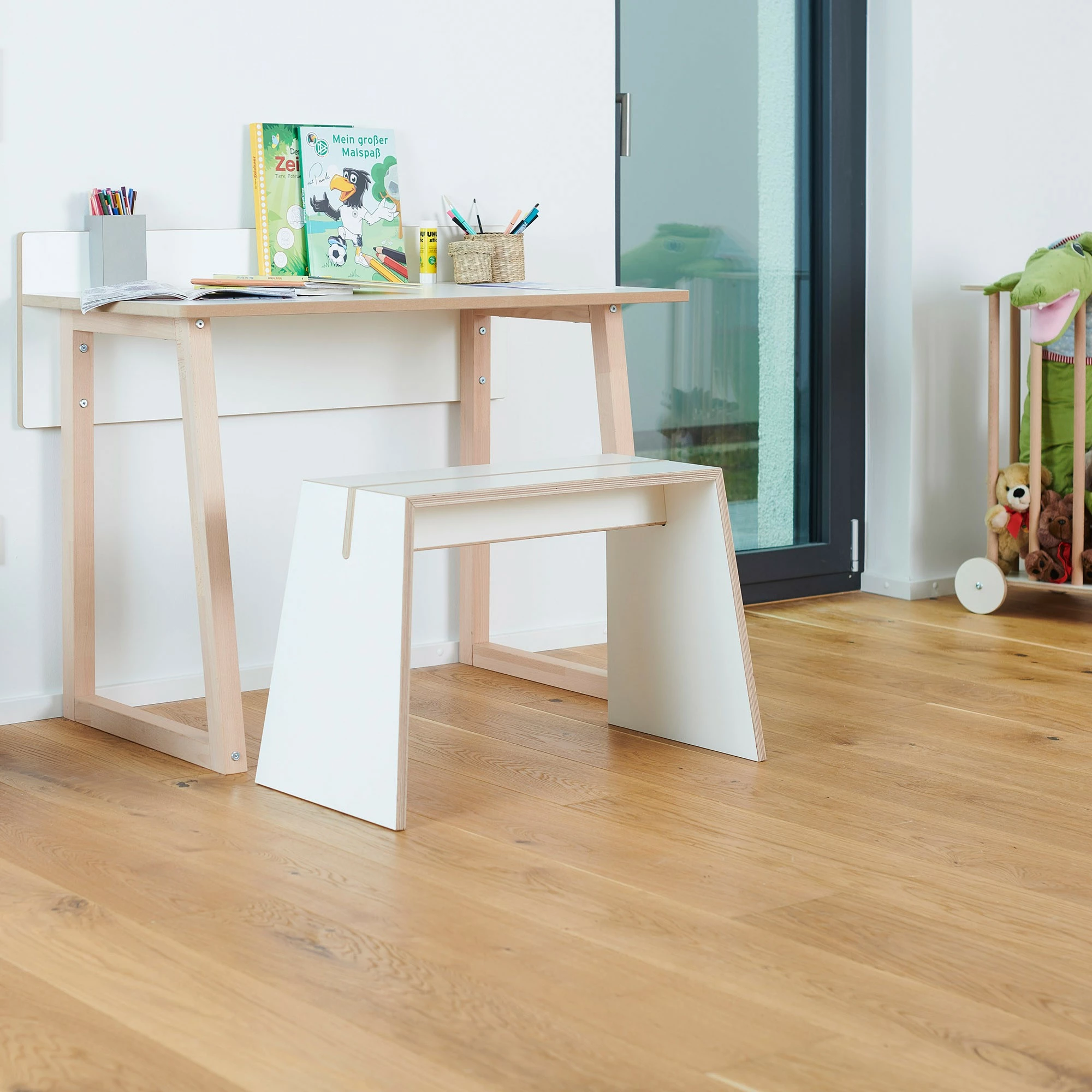 Der Werk Kinderschreibtisch wurde von Eigenwert für die Marke Tojo entworfen. Dank des schlichten Entwurfs passt er in jedes Kinderzimmer. Der Werk Kinderschreibtisch wird rasch zum Lieblingsplatz: Hier lässt es sich perfekt malen, Hausaufgaben machen und basteln.