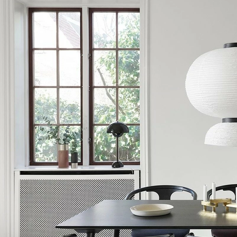 Verner Panton war eine Designer-Persönlichkeit in den Jahrzehnten nach dem 2. Weltkrieg. In dieser Zeit wurde dänisches Design international bekannt. Der Designer schuf Leuchten für den Tisch, für den Schreibtisch und als Deckenlampe, alle mit Elementen aus Halbkugeln. Die umgedrehte Halbkugel unter dem großen Lampenschirm verleiht der Lichtwirkung eine besondere Note. Die Glühbirne ist verdeckt und so entsteht eine indirekte, blendfreie Beleuchtung.
