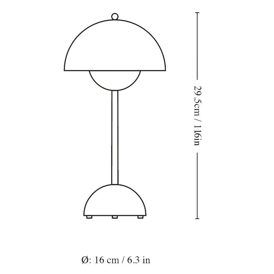 Die Flowerpot VP9 LED Tischleuchte mit Akku Ladekabel magnetisch glänzend wurde von Verner Panton für die Marke &Tradition entworfen. Sie ist ein Meisterwerk des Designers, der gerne Experimente macht.