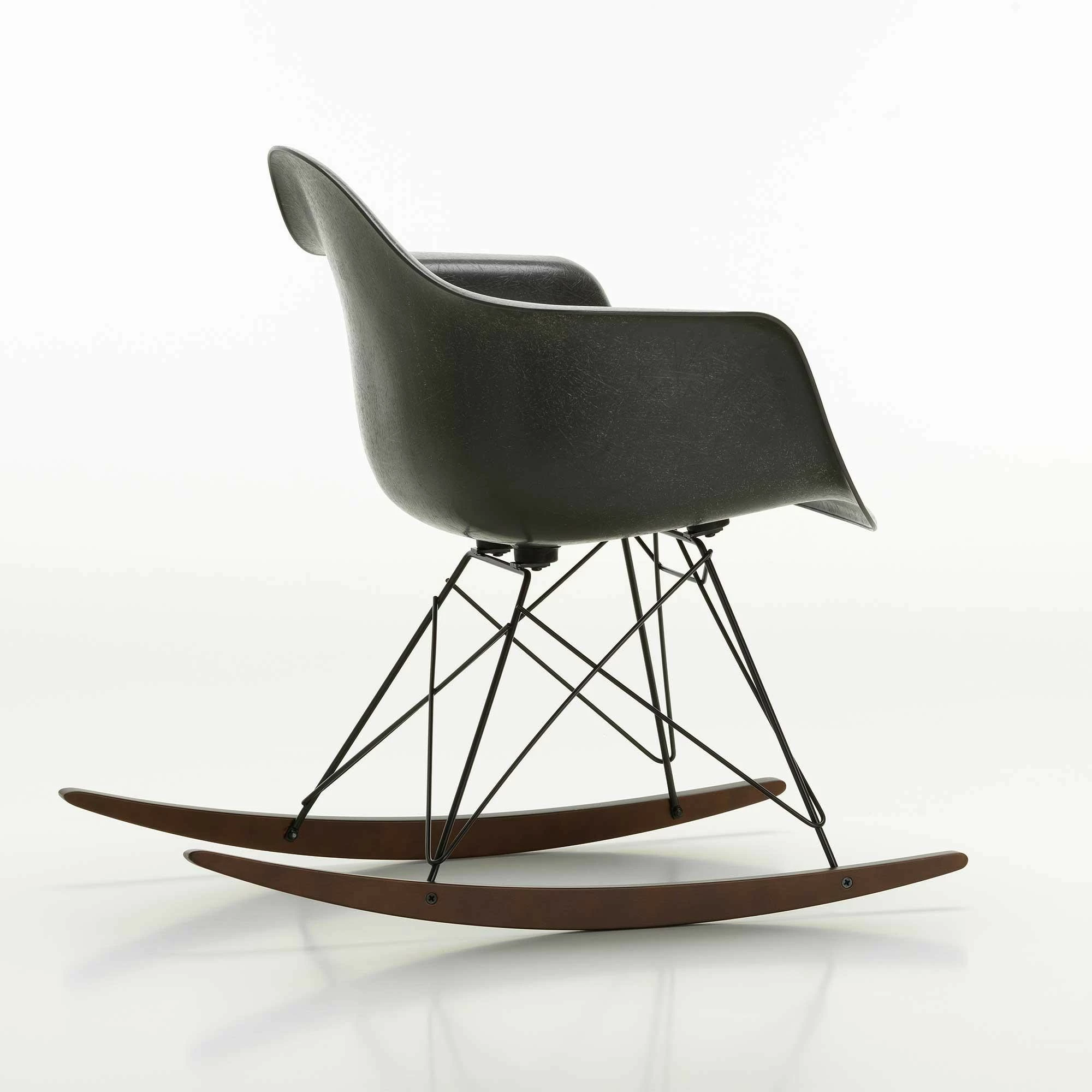 Der Eames Fiberglass Armchair RAR Schaukelstuhl Gestell schwarz wurde von den Designern Ray Eames und Charles Eames für die Marke Vitra entworfen. Dieser Schaukelstuhl erhielt 1948 bei einer Ausstellung im New Yorker Museum of Modern Art den 2. Platz und ging kurze Zeit später in Produktion. Prägend ist seine organisch geformte Sitzschale mit der deutlich erkennbaren Faserbeschaffenheit an der Oberfläche.